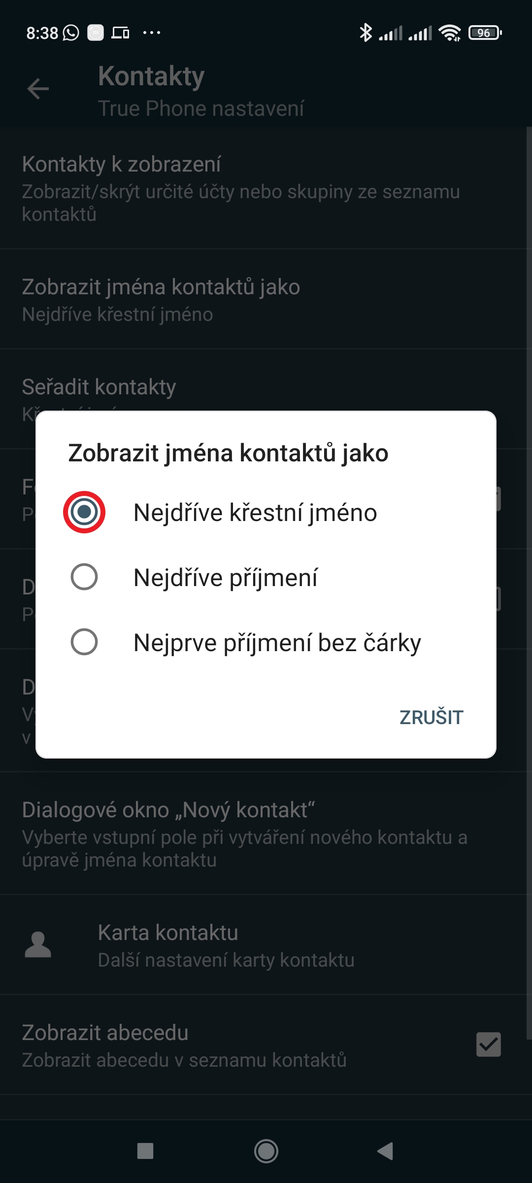 6. V nabídce Zobrazit jména kontaktů jako lze volit, v jakém pořadí bude zobrazováno jméno a příjmení.
