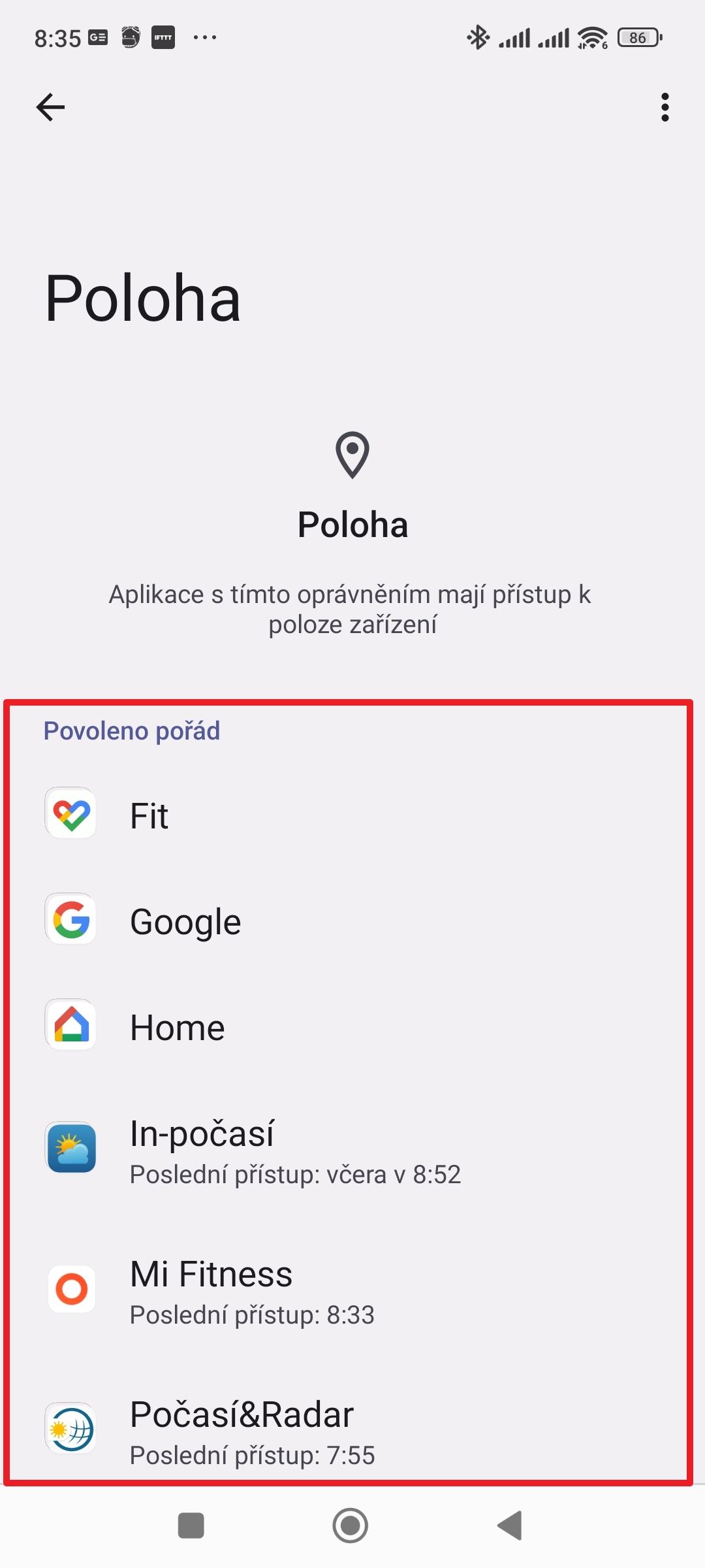 4. Zobrazí se seznam roztříděný podle toho, jaký přístup mají jednotlivé aplikace povolený – pořád, pouze při používání, nebo nepovoleno.