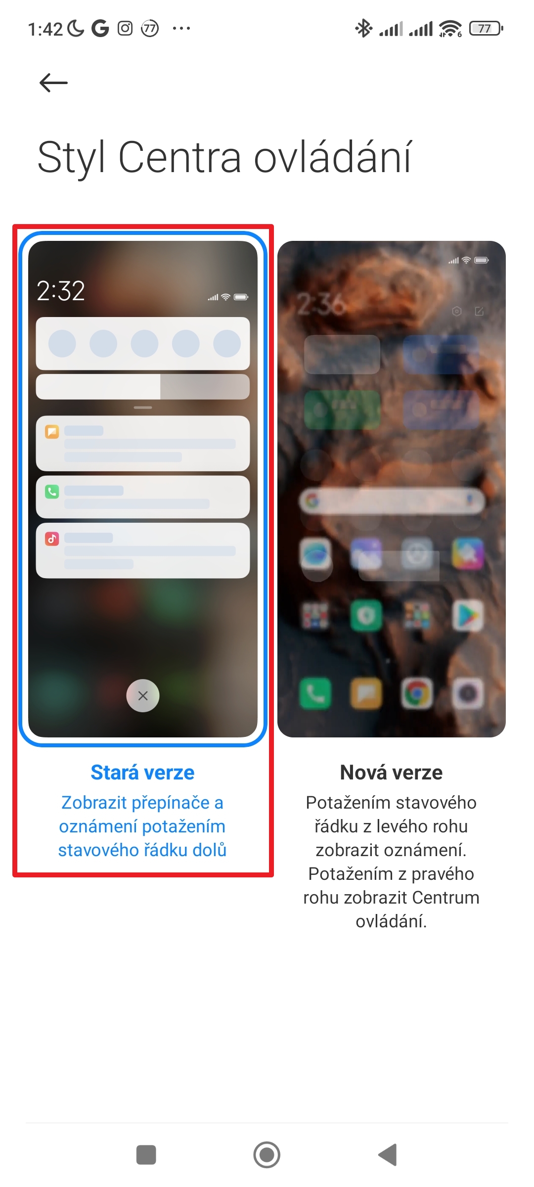 4. Chcete-li používat styl bližší Androidu s přepínači a oznámeními pohromadě, zvolte Stará verze.