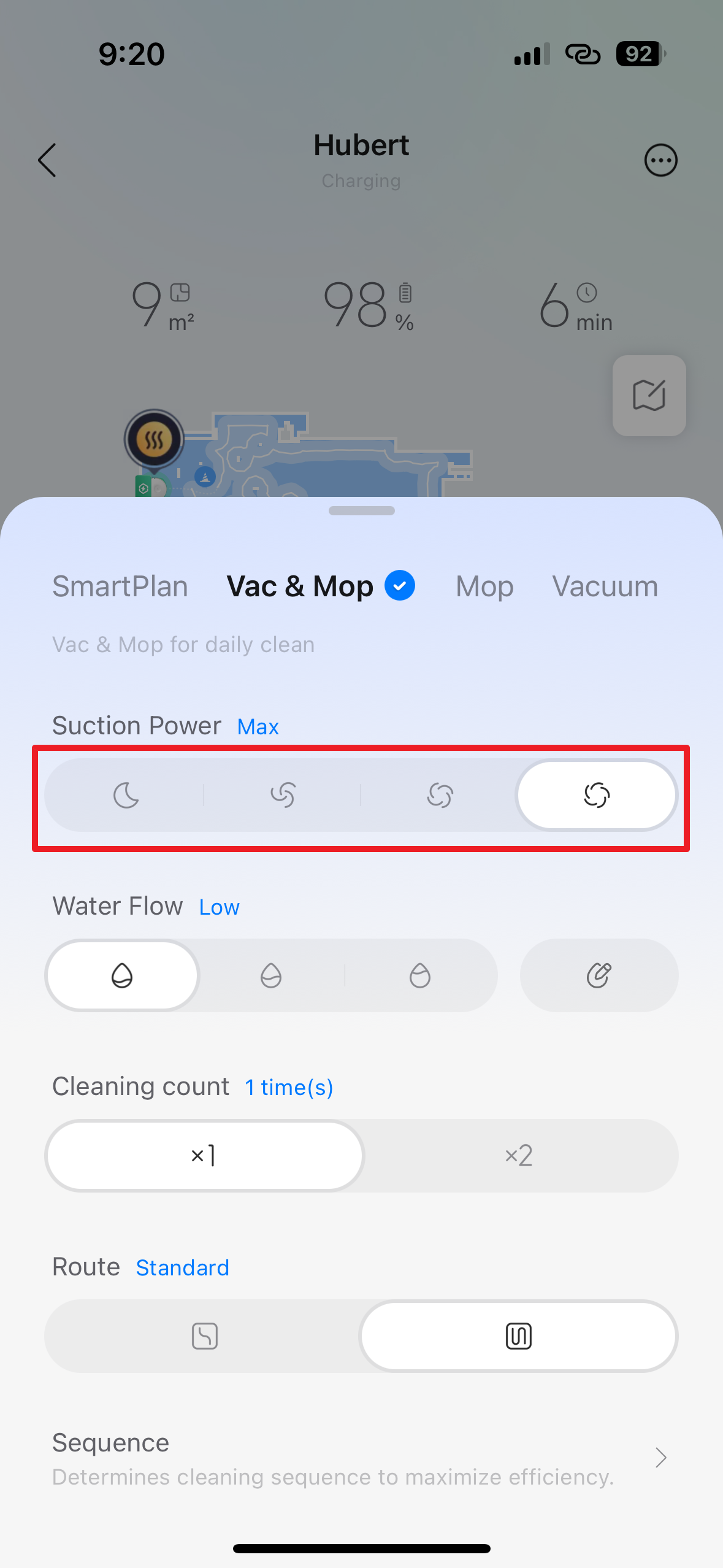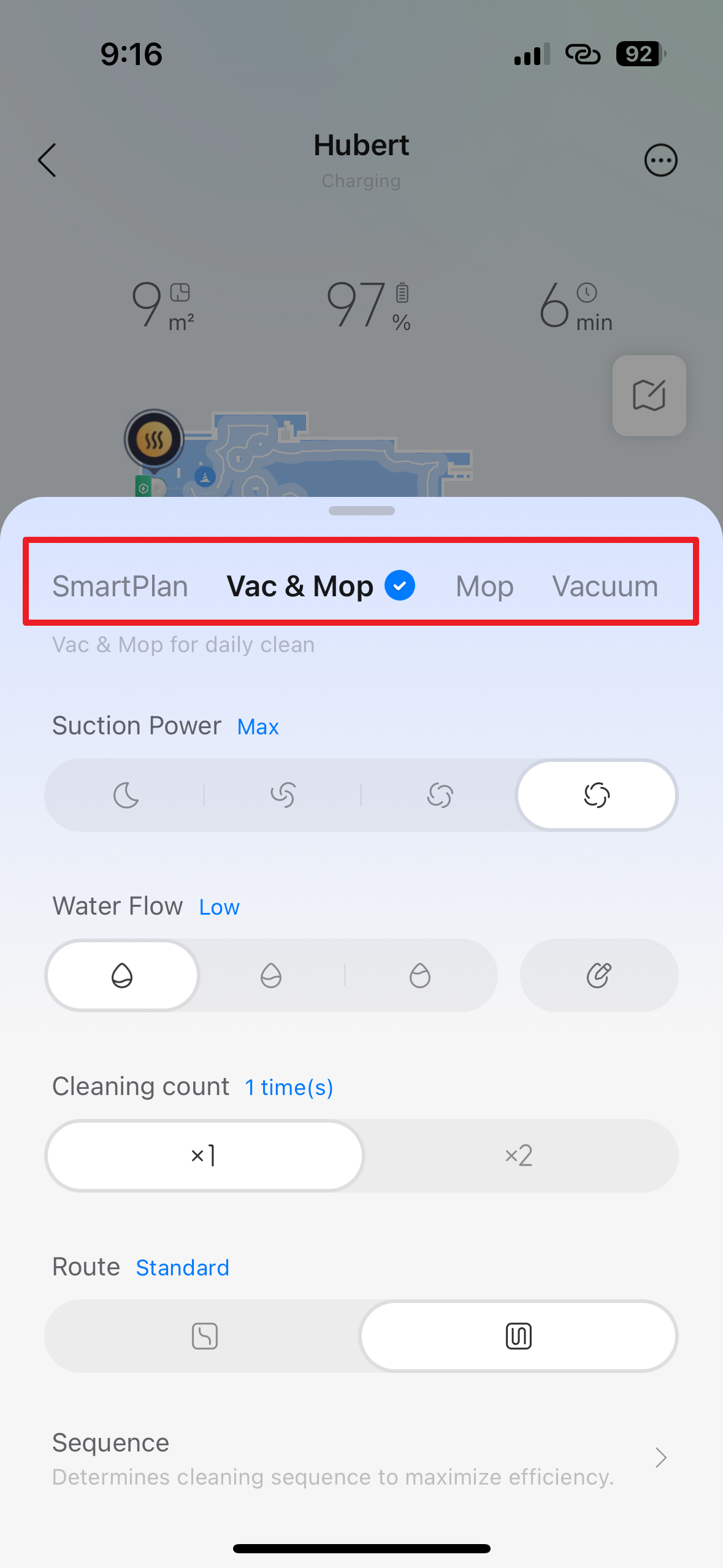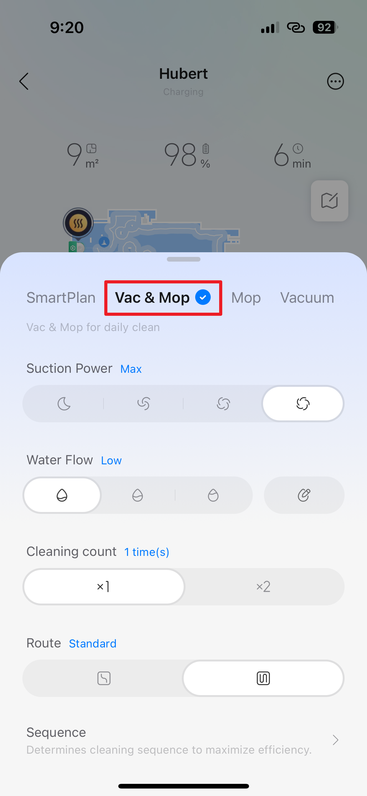 Volba Vac & Mop, tedy česky „Vysávání a mopování“, dává robotovi příkaz, aby prováděl obě činnosti současně. Je to standardní kombinovaný režim pro úklid tvrdých podlah, jako jsou dlaždice, vinyl nebo dřevo. Robot bude aktivně používat sací systém i vlhké rotační mopy k odstranění prachu a zároveň setření ulpělých nečistot v jednom jediném přejezdu pro maximální efektivitu. Pomocí přepínačů níže můžete nastavit parametry: