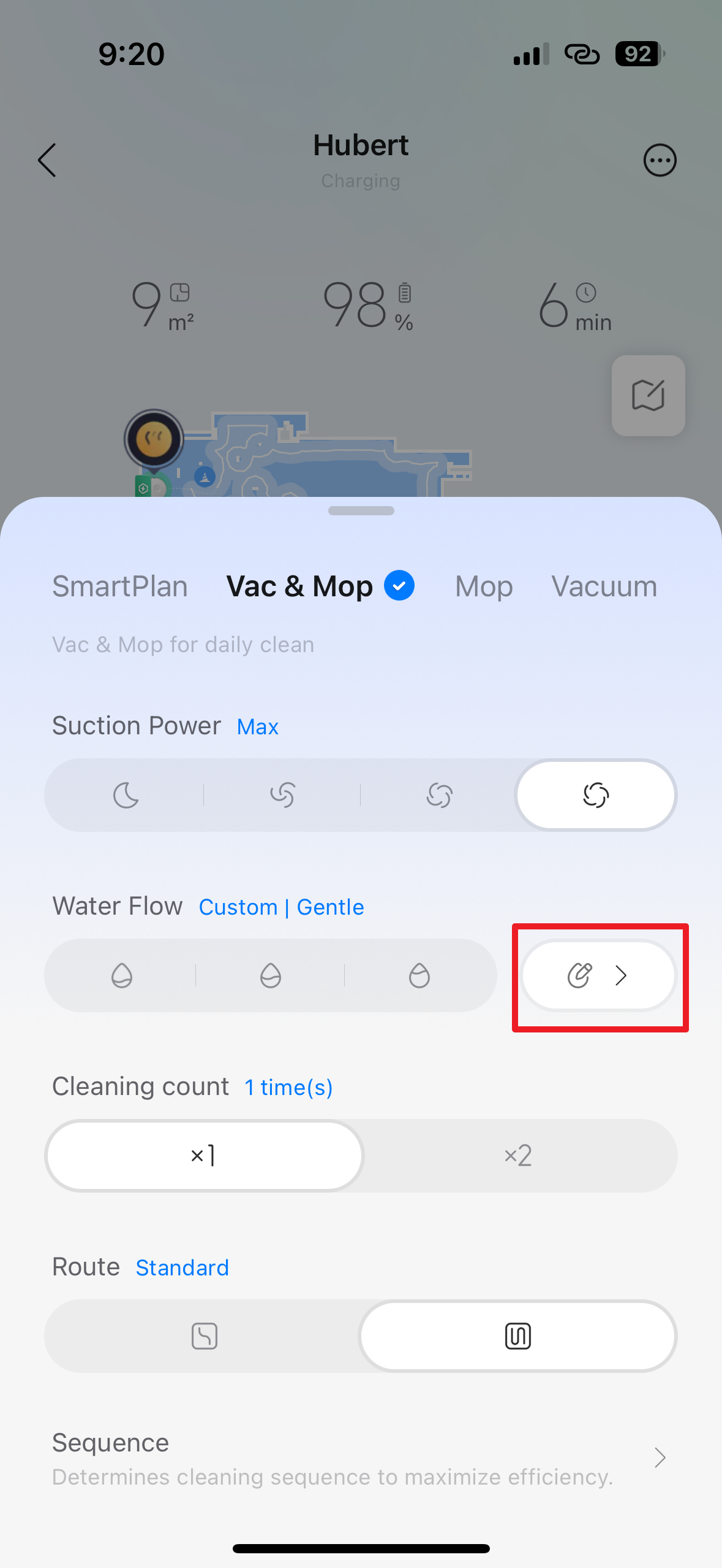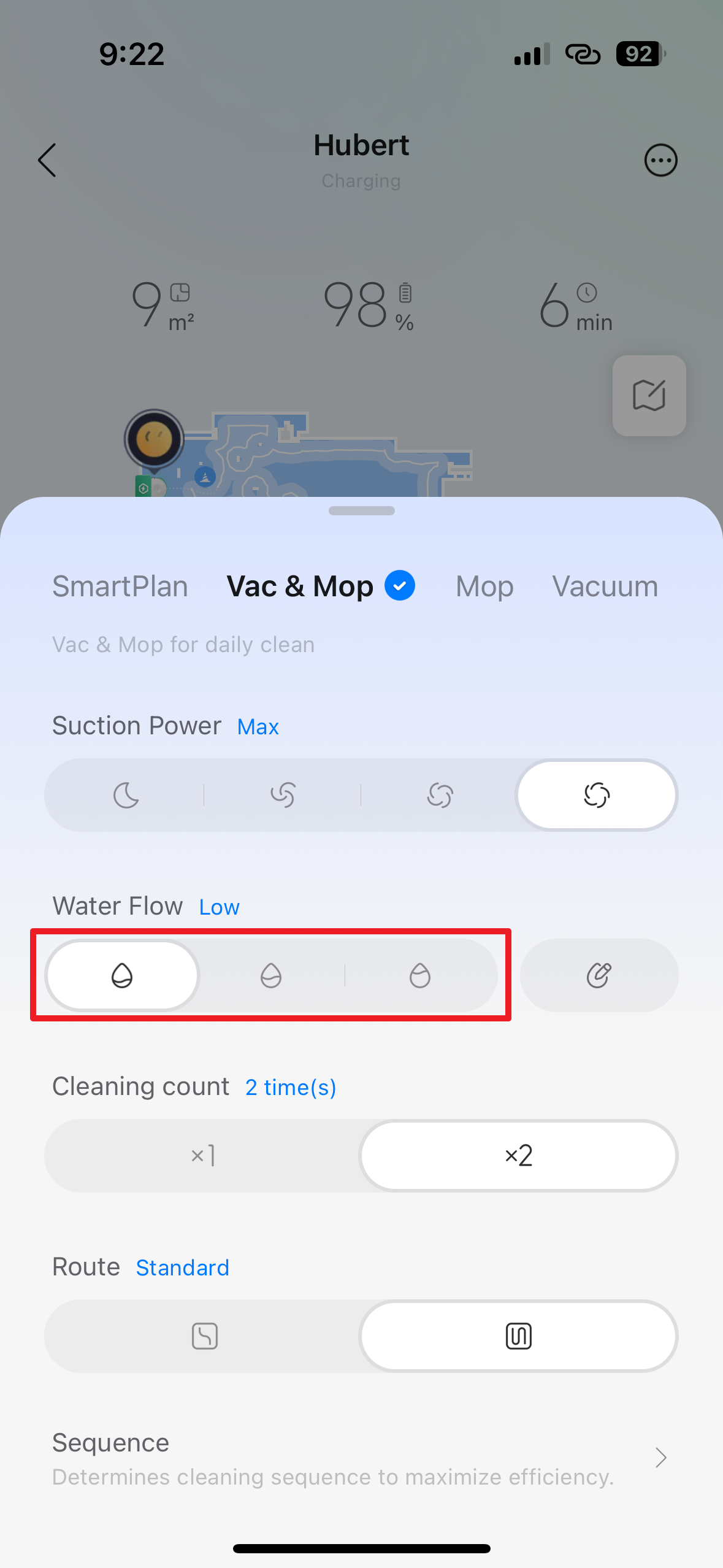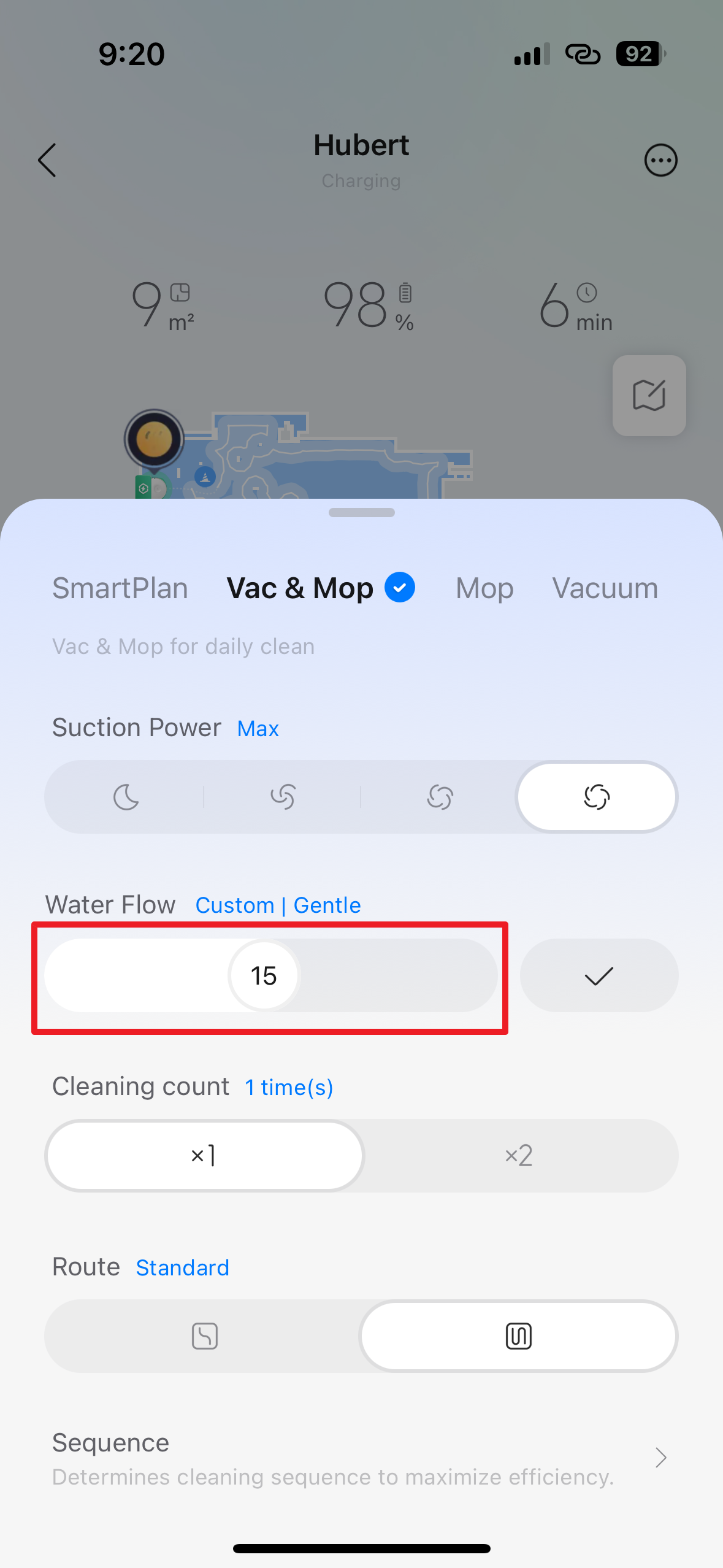 Volba Vac & Mop, tedy česky „Vysávání a mopování“, dává robotovi příkaz, aby prováděl obě činnosti současně. Je to standardní kombinovaný režim pro úklid tvrdých podlah, jako jsou dlaždice, vinyl nebo dřevo. Robot bude aktivně používat sací systém i vlhké rotační mopy k odstranění prachu a zároveň setření ulpělých nečistot v jednom jediném přejezdu pro maximální efektivitu. Pomocí přepínačů níže můžete nastavit parametry: