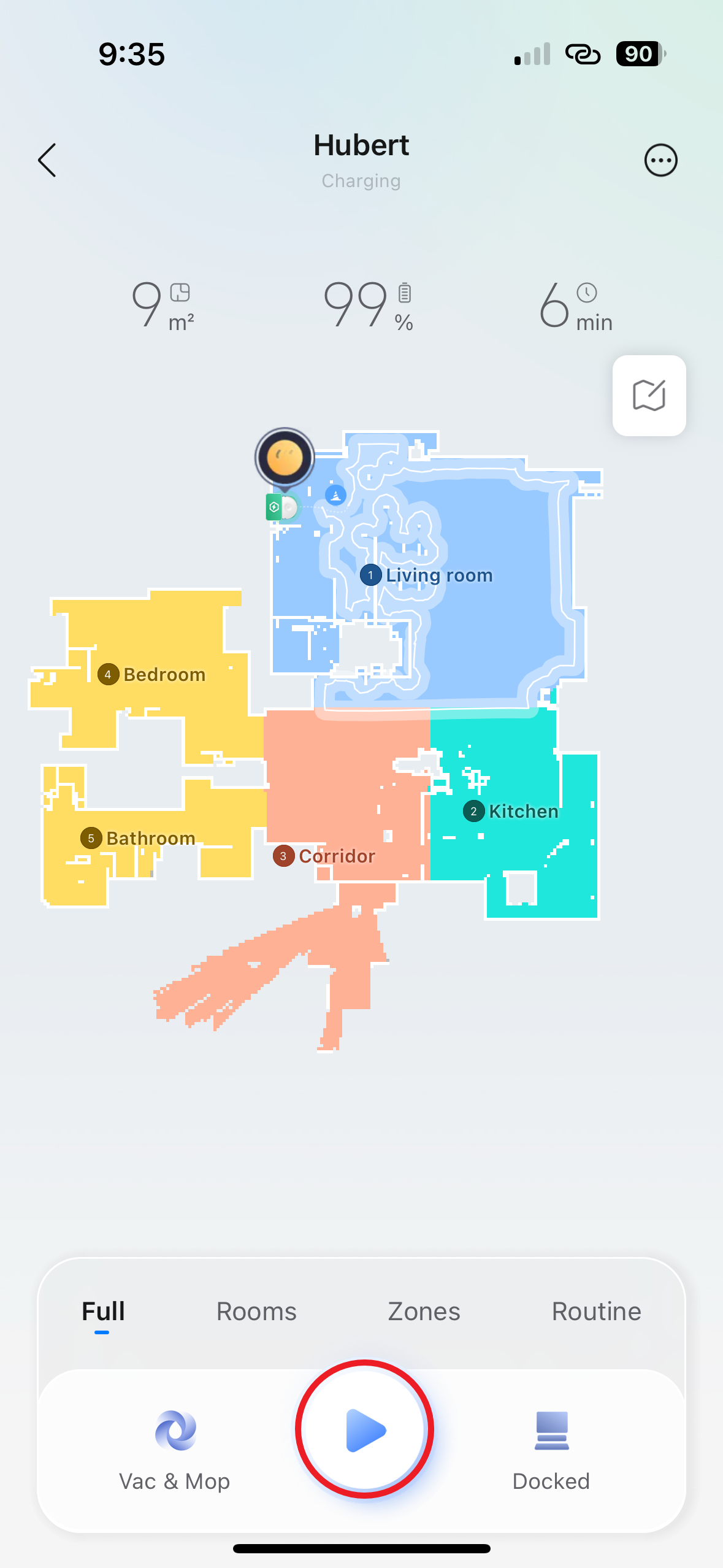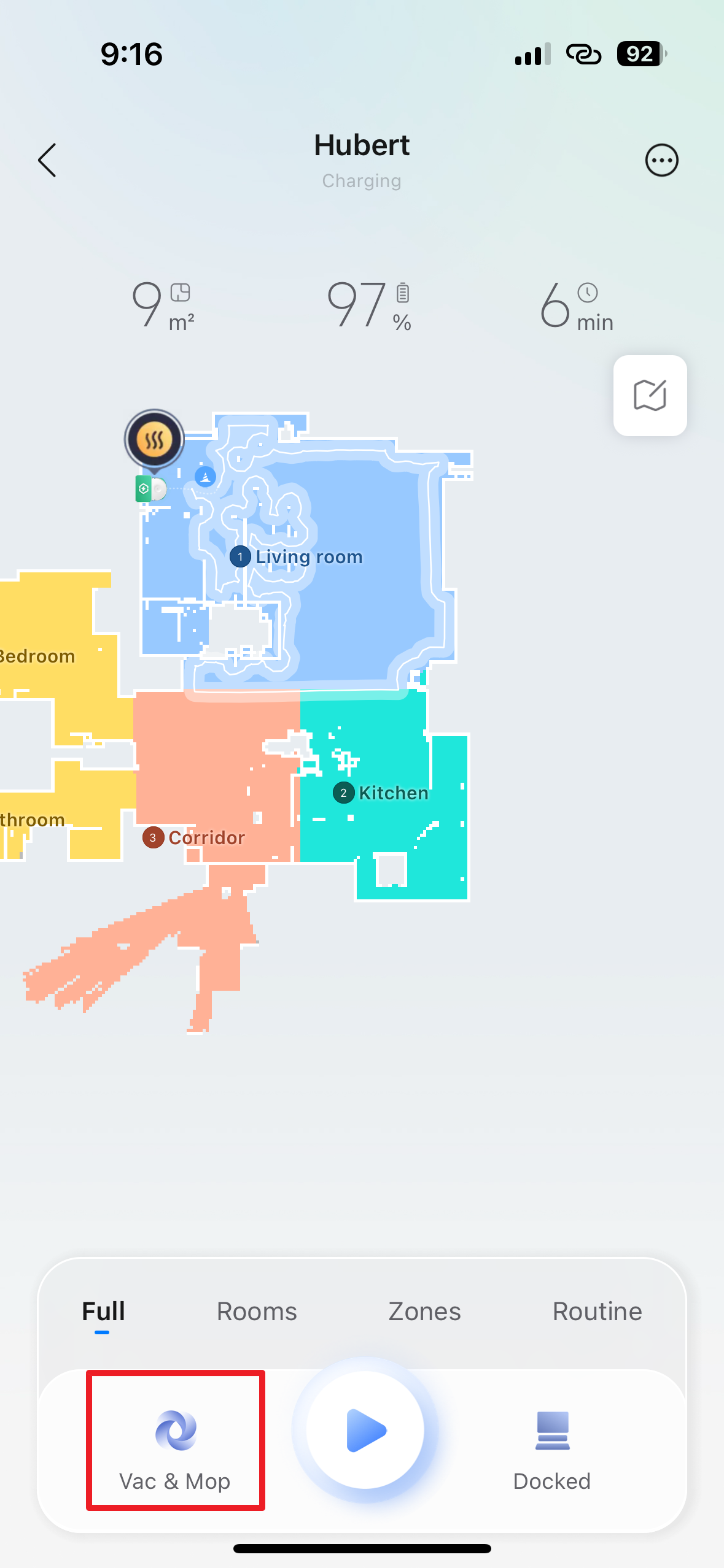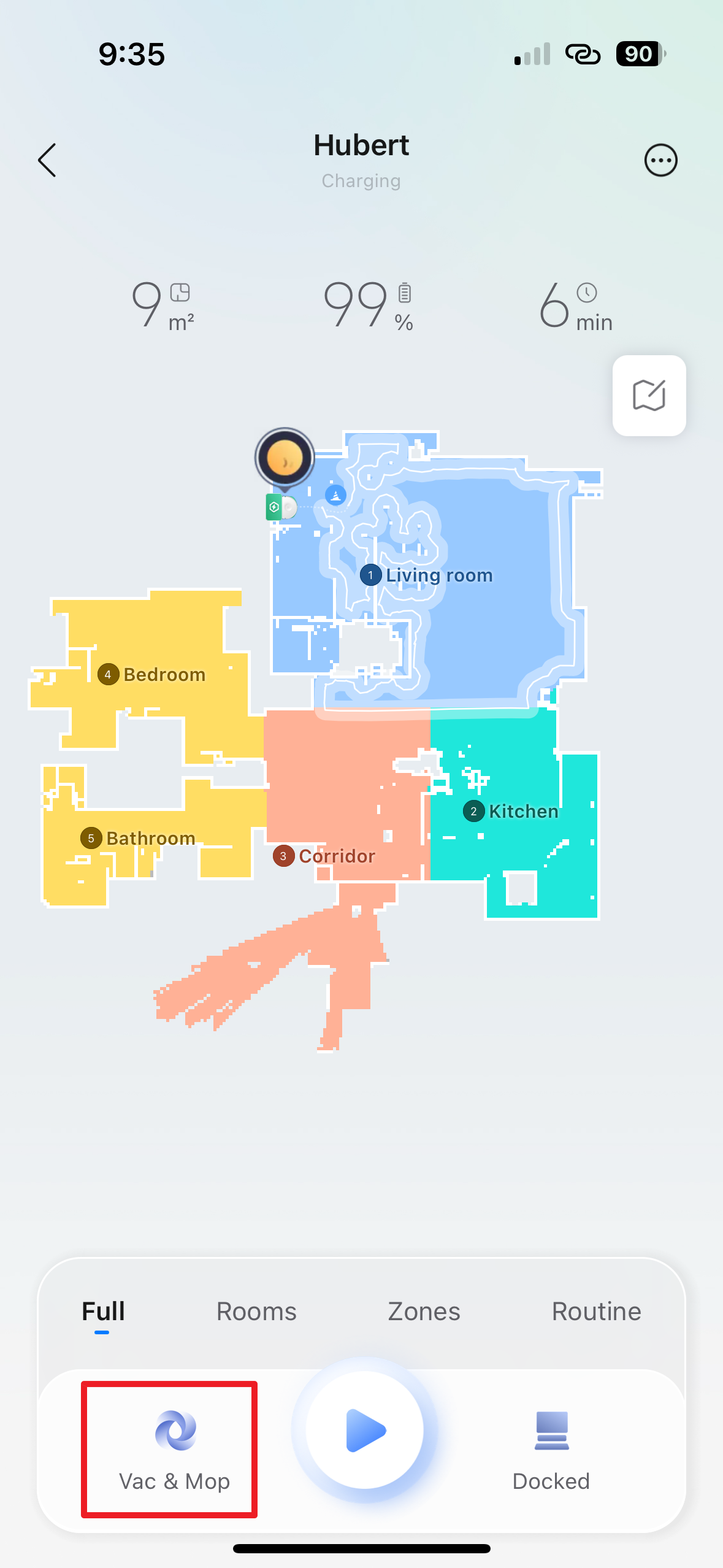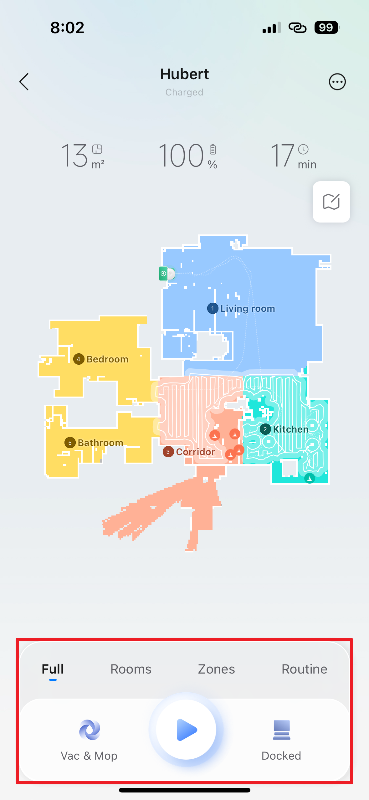 Nejprve tedy pomocí voleb Full, Rooms a Zones zvolte, co si přejete uklidit – tedy zda celou domácnost, jen zvolené pokoje nebo určité zóny. Následně vyberte režim, tedy zda chcete vysávat, vytírat, nebo vysávat i vytírat současně. K zahájení úklidu pak stačí stisknout příslušné tlačítko, které vypadá jako „play“ v multimediálním přehrávači.