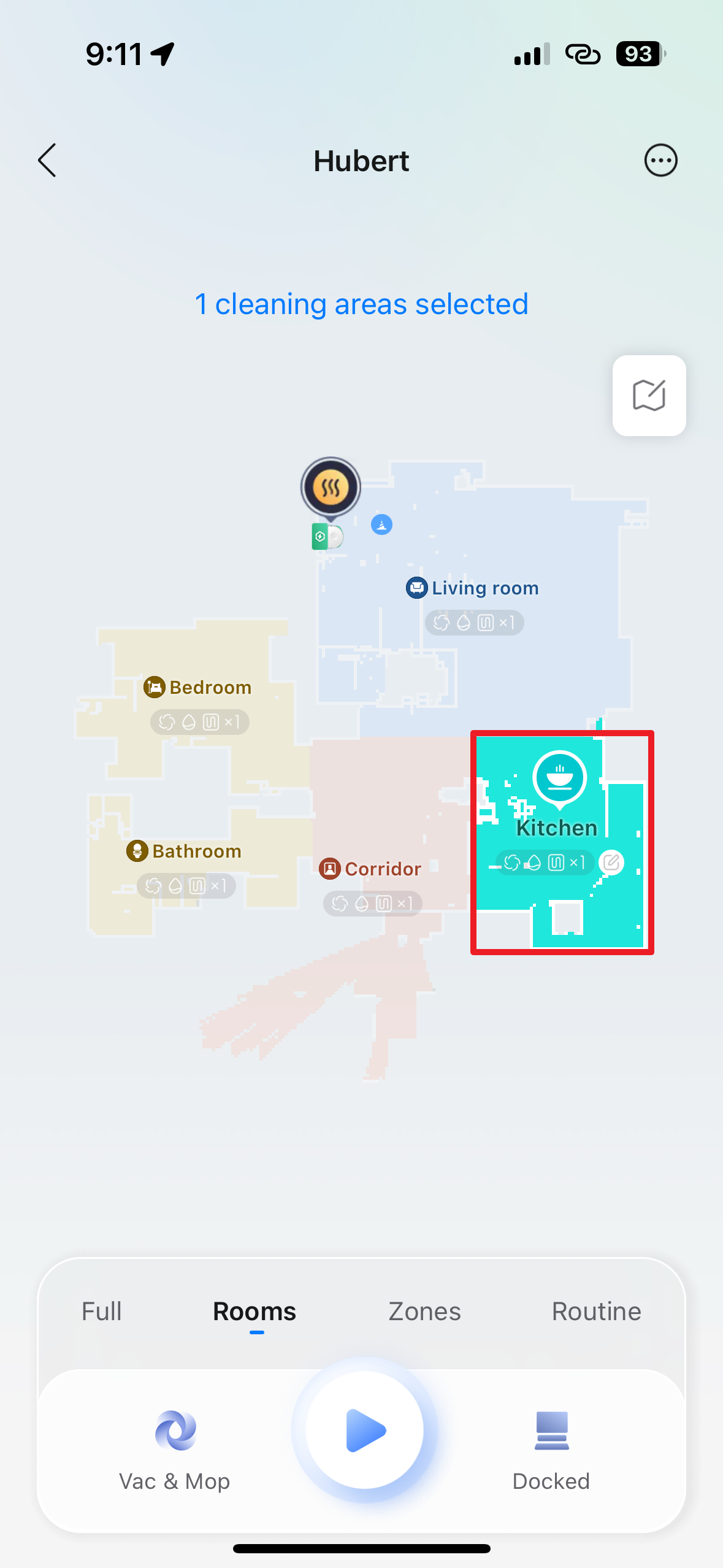 Jestliže vyberete režim Rooms (místnosti), pak budete moci klepnutím do mapy označit pouze jednu nebo více místností, které si přejete uklidit. Vybrané místnosti budou označené sytější barvou, zatímco nevybrané budou světlejší. To se hodí například v případě, kdy potřebujete uklidit kuchyň po vaření. Robot poté omezí svůj úklid pouze na vámi zvolené pokoje a ostatní části bytu bude ignorovat.