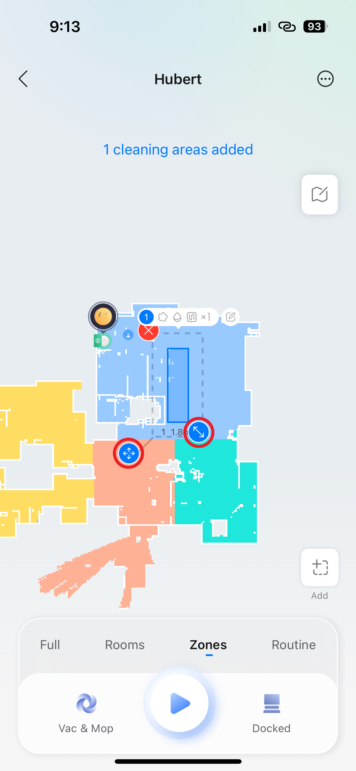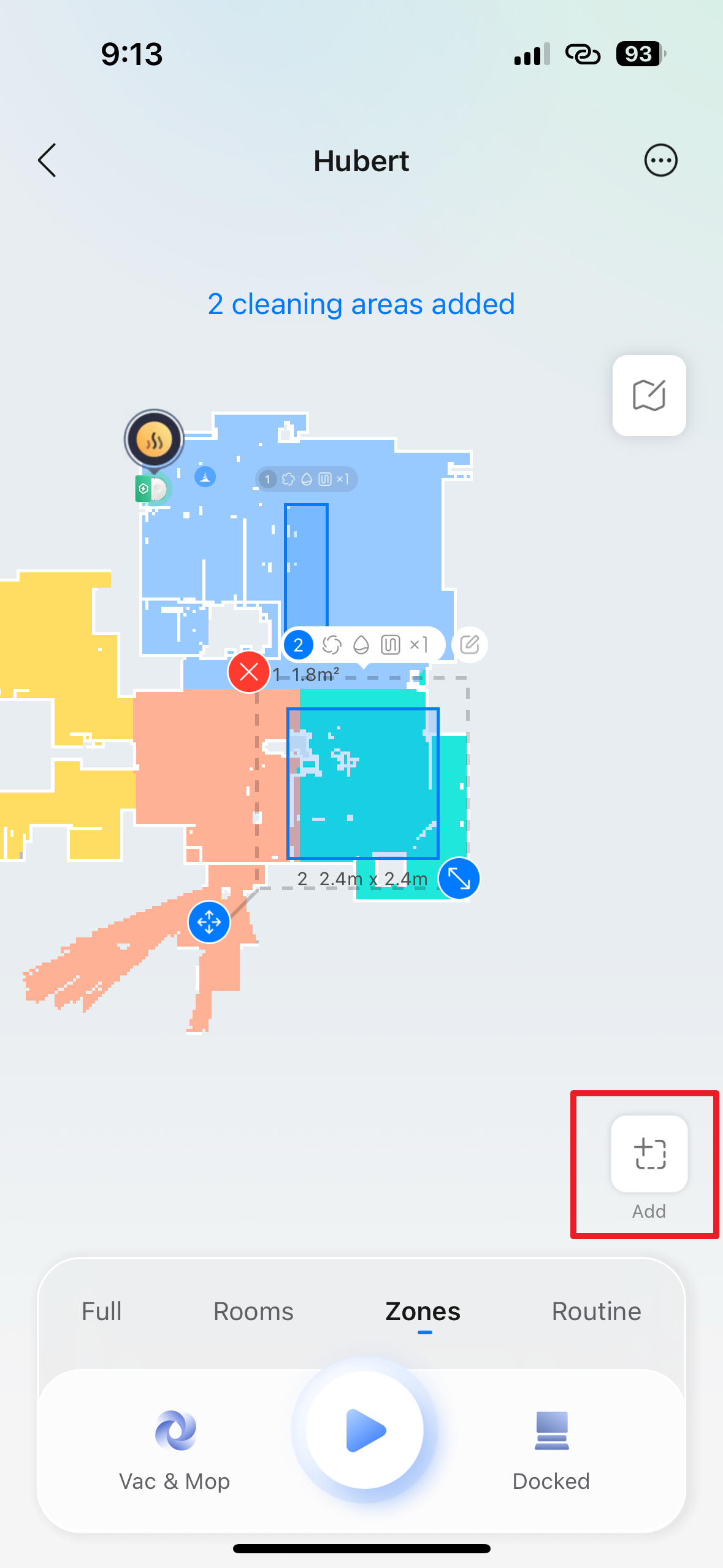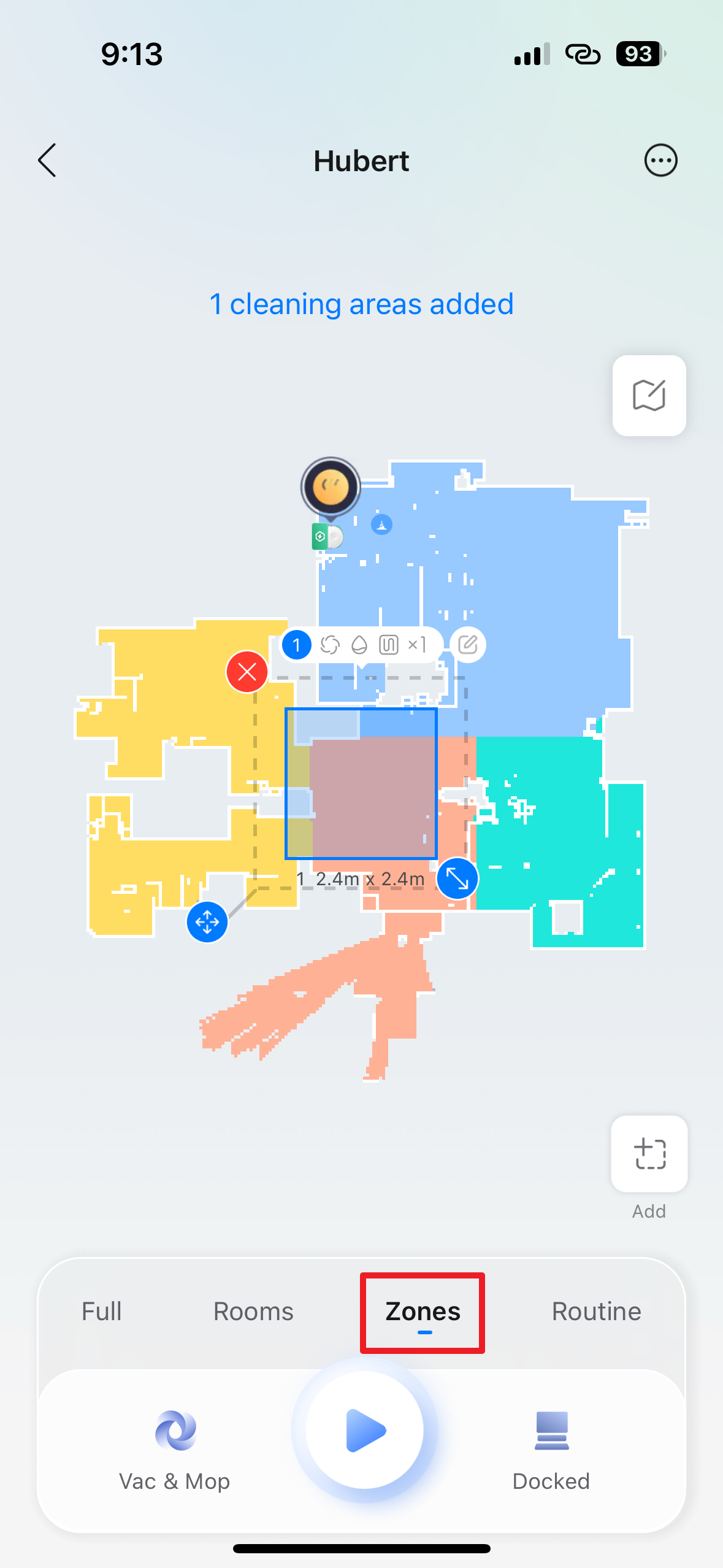 Třetí možnost Zones (zóny) nabízí úklid pouze vybraných oblastí. V aplikaci můžete na mapě manuálně vyznačit jeden či více (další obdélník lze přidat klepnutím na tlačítko Add) obdélníkových prostorů, které má robot uklidit, bez ohledu na rozdělení místností. Tato volba je perfektní pro rychlý úklid malých, specifických oblastí, jako je prostor kolem jídelního stolu po večeři nebo místo s rozsypanou nečistotou.