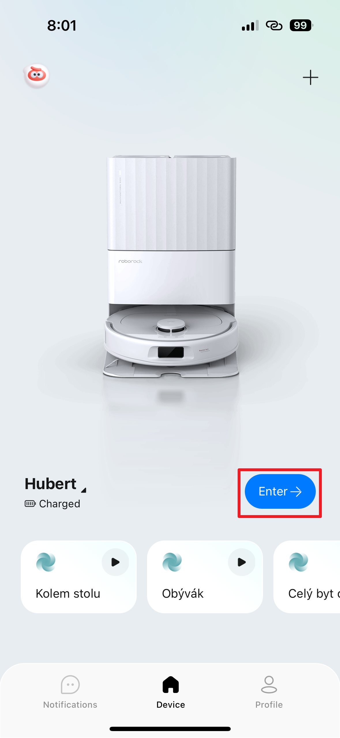 Otevřete aplikaci Roborock a na úvodní obrazovce klepněte na tlačítko Enter, které je umístěné pod obrázkem vysavače. Tím se dostanete do sekce, ve které byste měli vidět mapu své domácnosti a ve spodní části nástrojový panel s několika tlačítky, kterým se budeme věnovat v tomto pokračování.