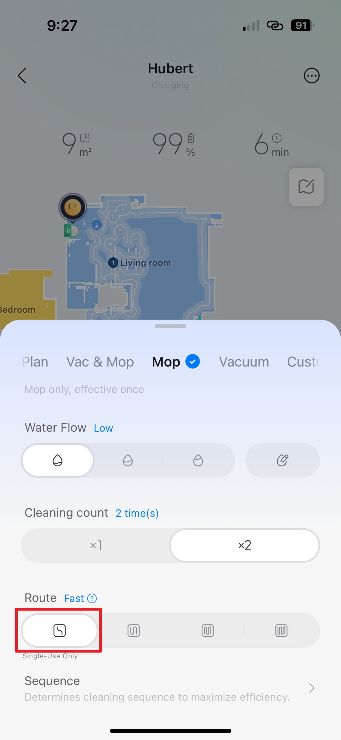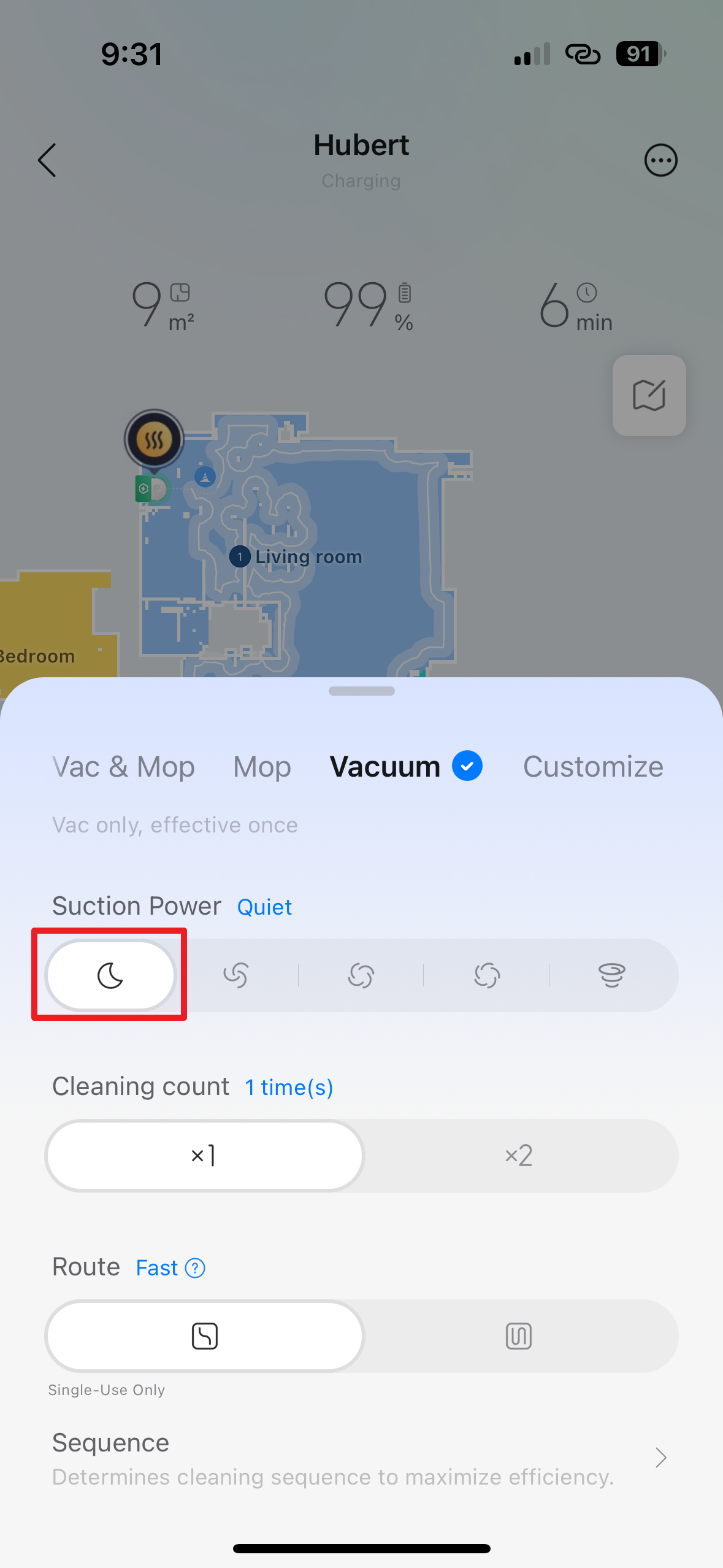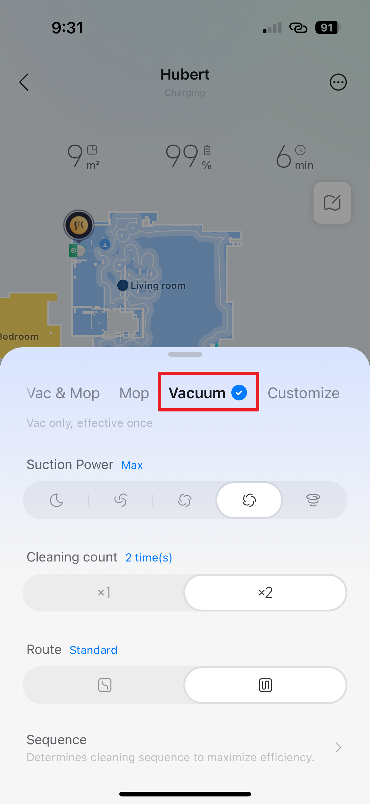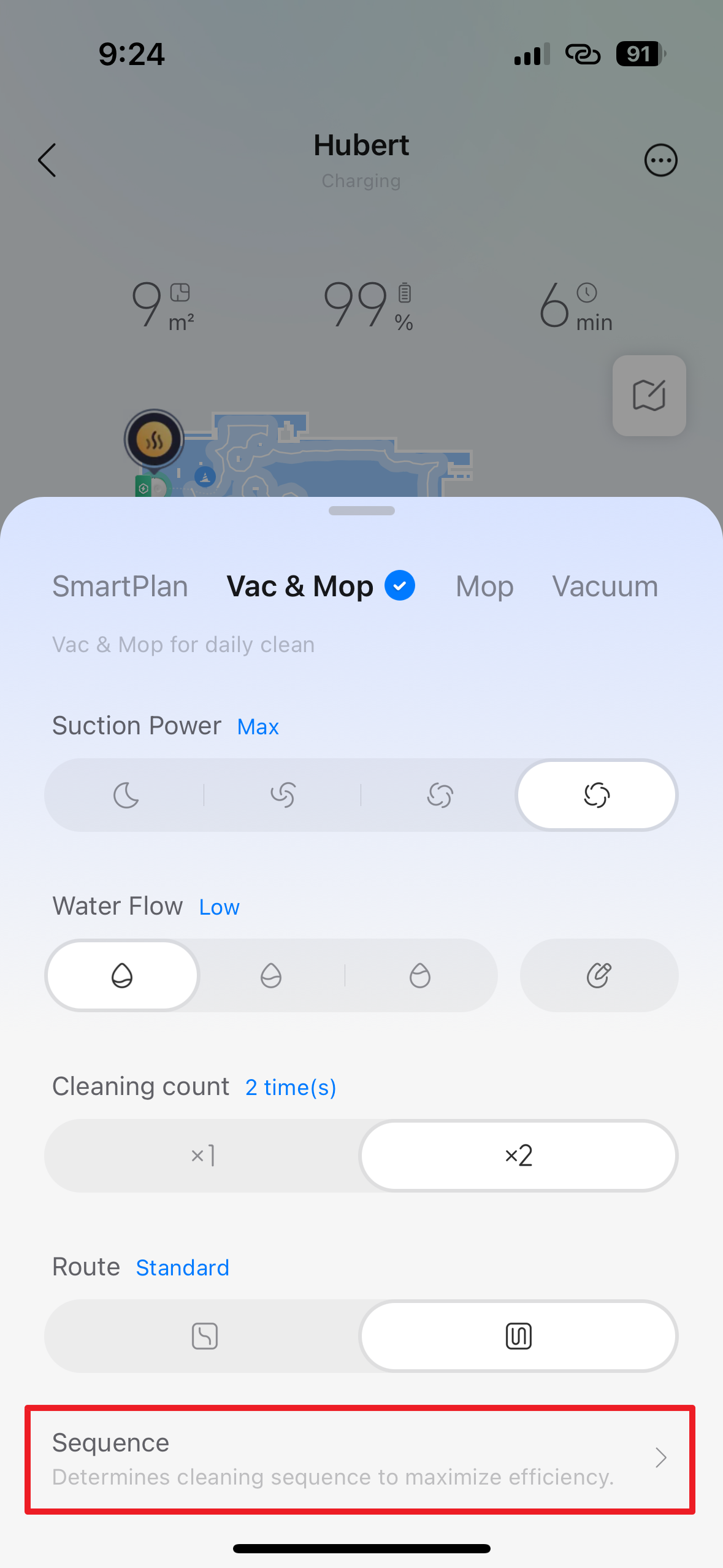 - Sequence – v této sekci si můžete zvolit pořadí, v jakém bude vysavač uklízet jednotlivé místnosti.