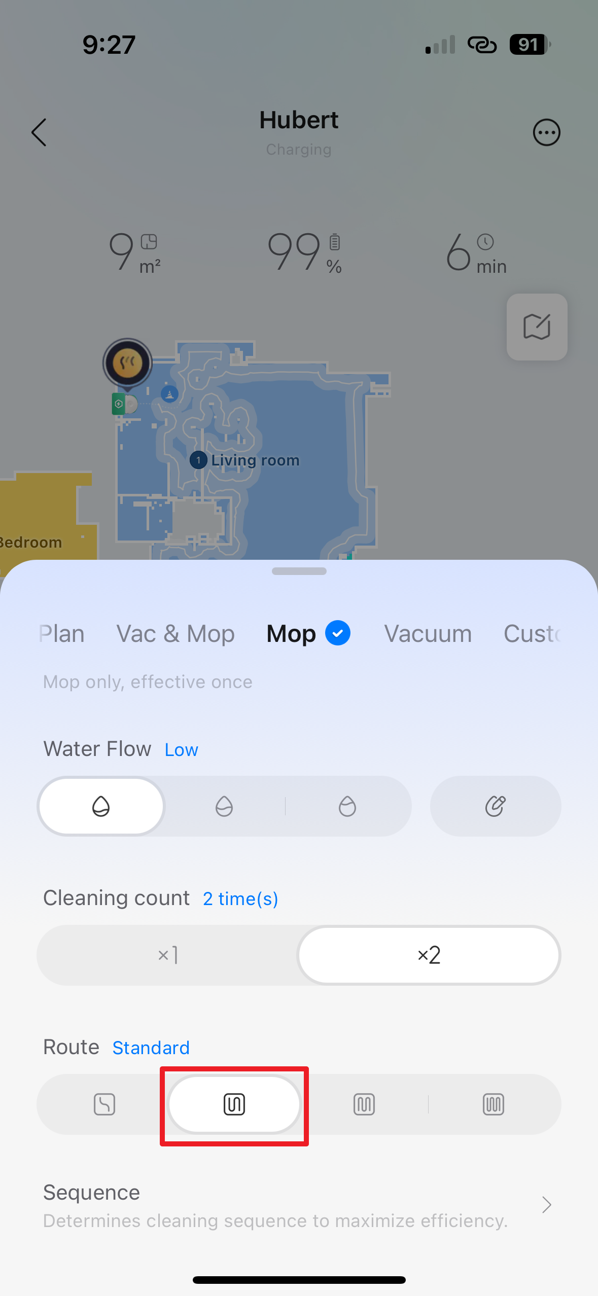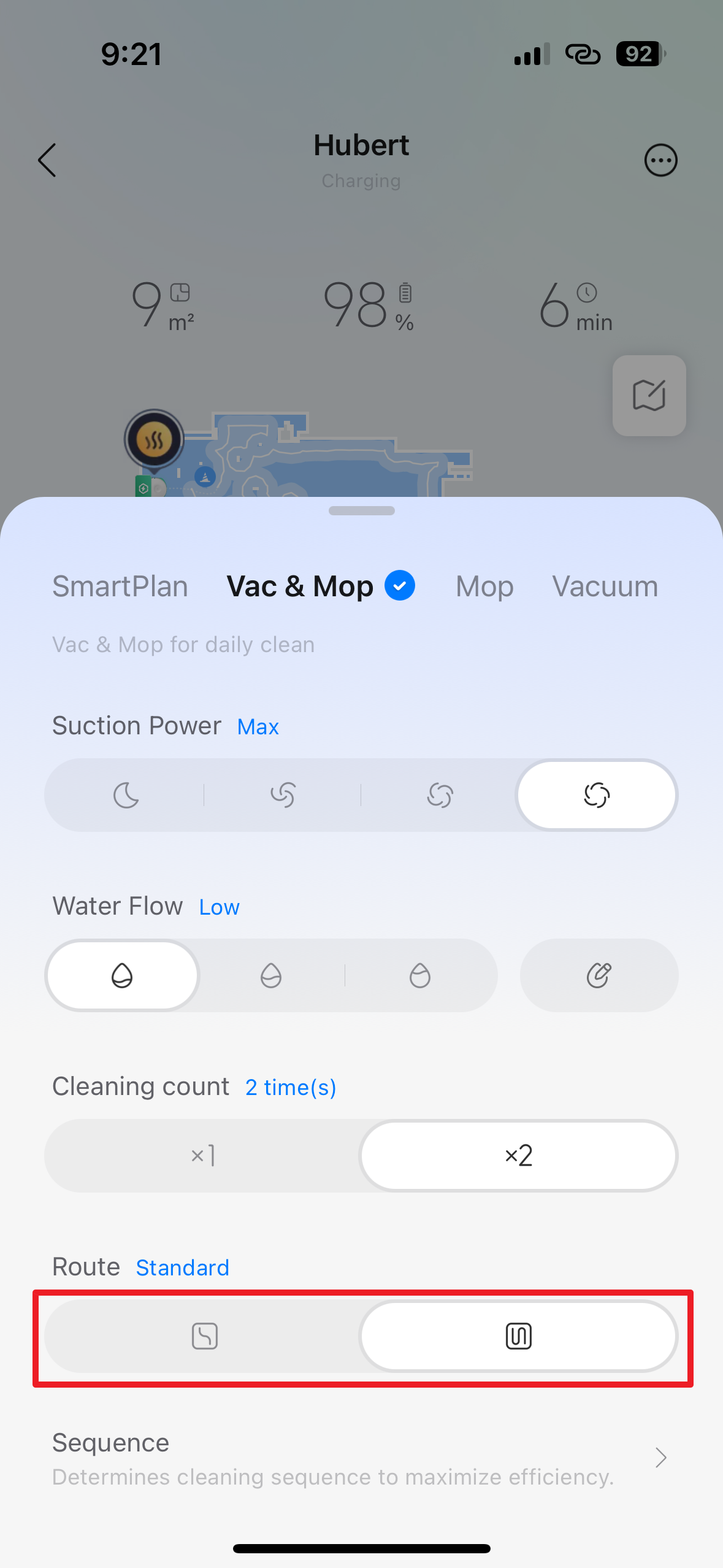 Co je jinak, je sekce Route, kde je na výběr nikoli ze dvou, ale ze čtyř možností: Fast, Standard, Deep a Deep+. Jednotlivé režimy se liší především v hustotě dráhy a rychlosti pohybu robota. Režim Fast je navržen pro co nejrychlejší pokrytí plochy, robot se pohybuje rychleji a jeho dráhy mají menší překryv. Standard představuje vyvážený kompromis mezi rychlostí a důkladností, vhodný pro běžný, každodenní úklid.