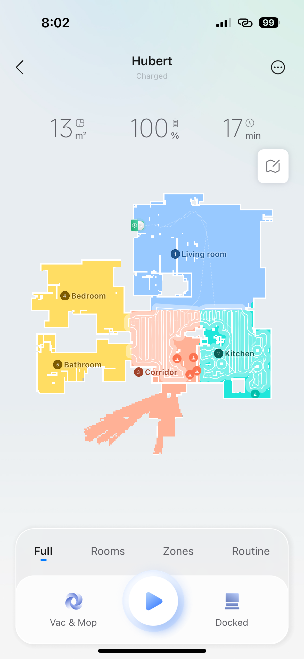 Pokud zvolíte režim Full (celý, úplný), pak vysavač postupně uklidí celou domácnost. Sám si rozdělí prostor na jednotlivé zóny, nejprve uklidí jejich okraje a poté systematicky celý vnitřek. Takto postupně uklidí všechny zóny a s nimi i celou domácnost.