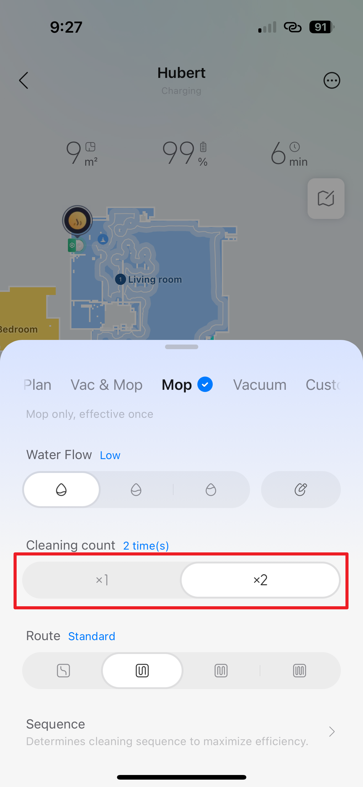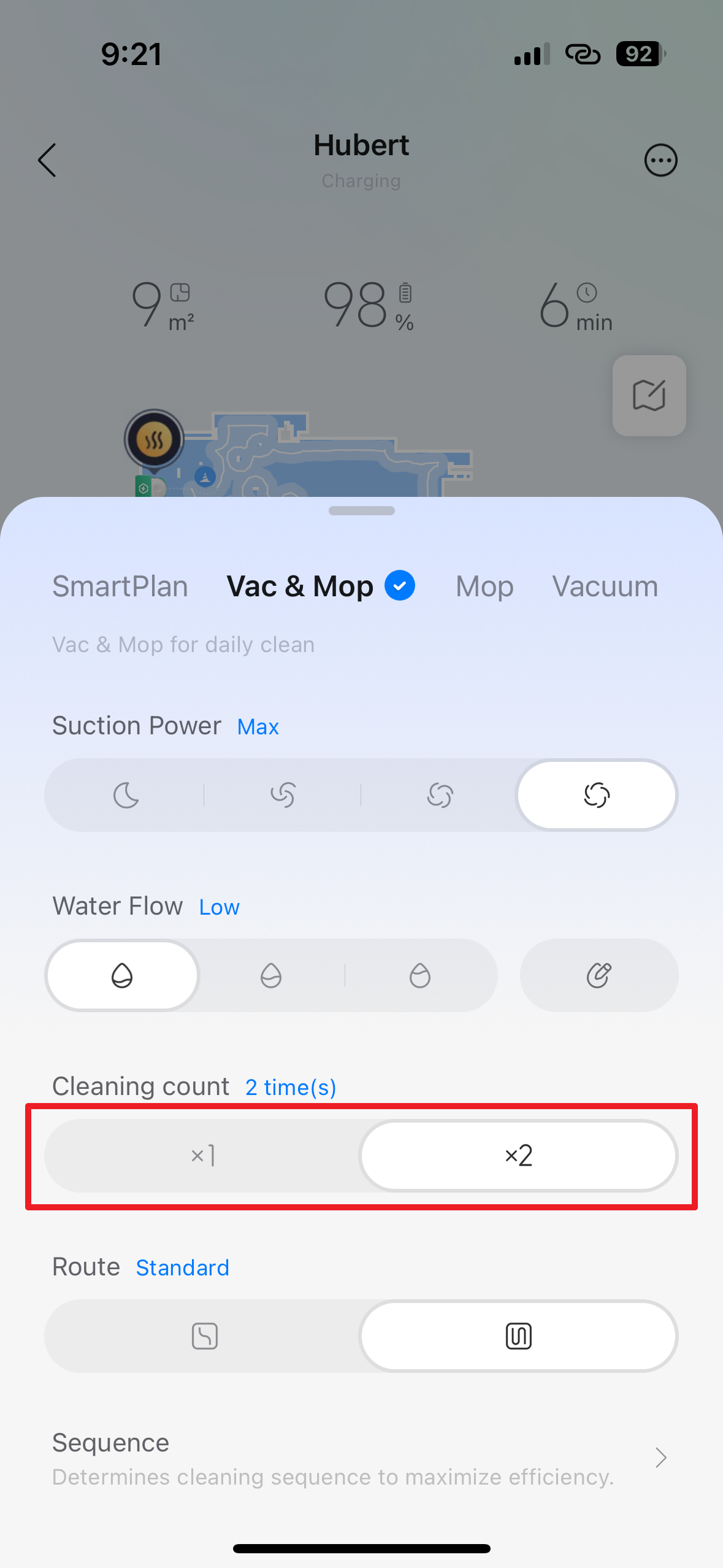 Režim pro vysávání a vytírání Nastavení síly vysávání Nastavení intenzity vlhčení mopu - Cleaning count – počet opakování úklidu. Na výběr je jednorázový, nebo dvojnásobný úklid. V případě dvojitého úklidu probíhá druhý úklid „napříč“, tj. například tam, kde vysavač předtím jezdil zleva doprava, bude ve druhém cyklu jezdit „shora dolů“.