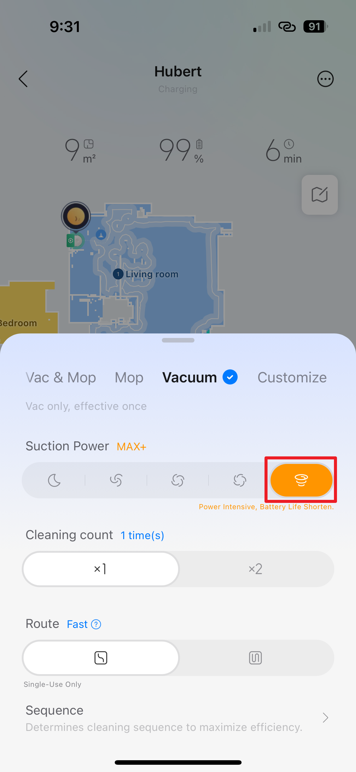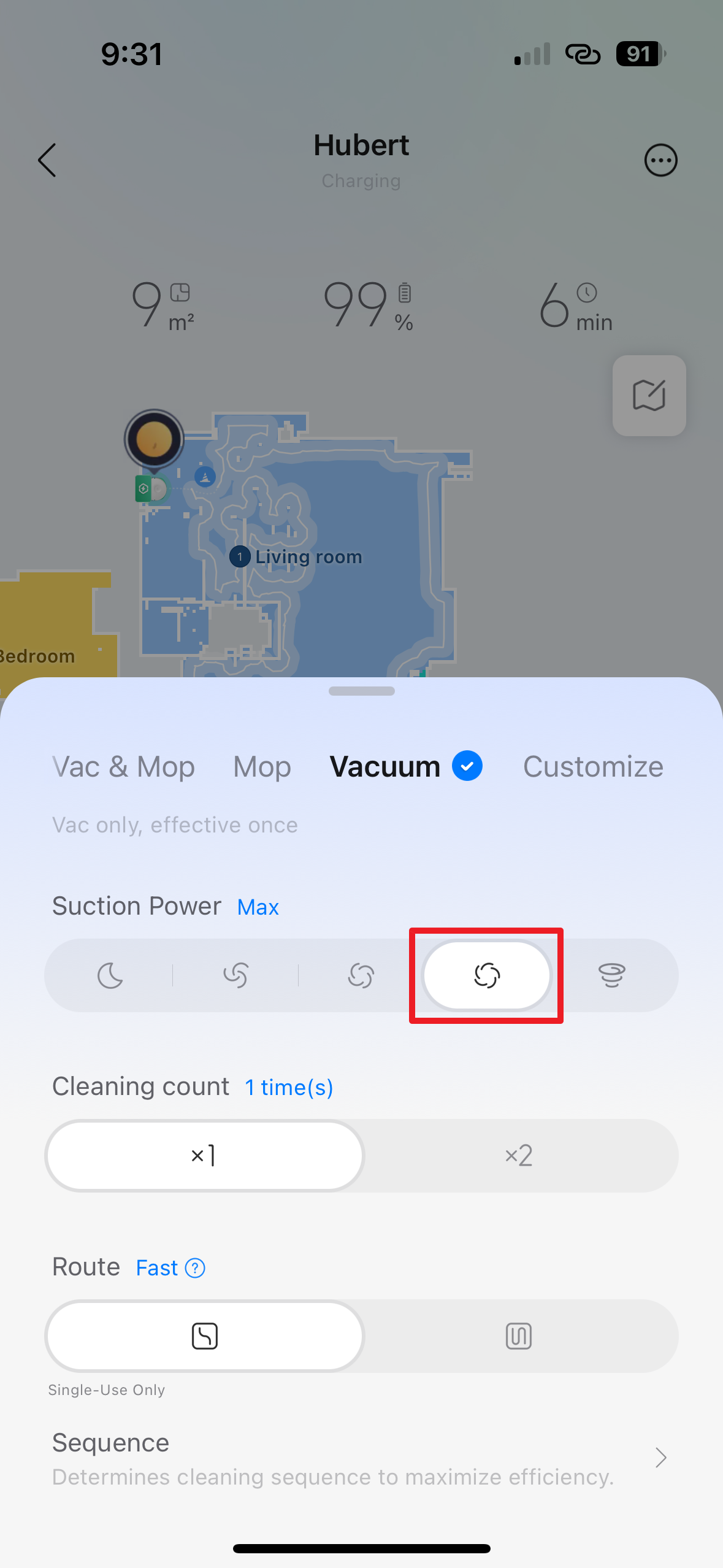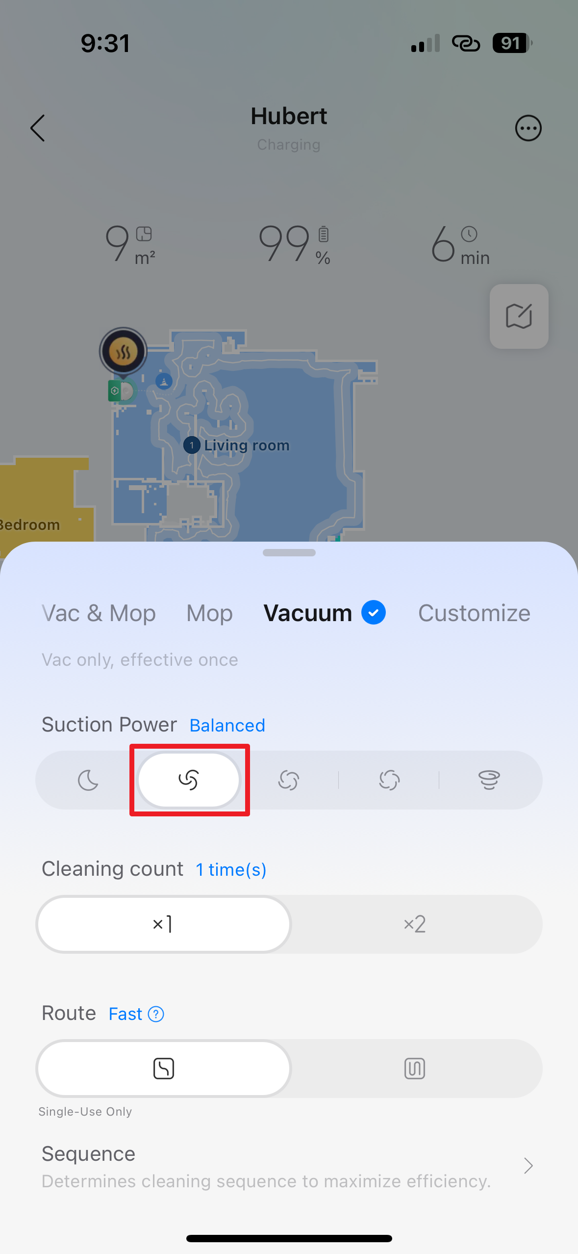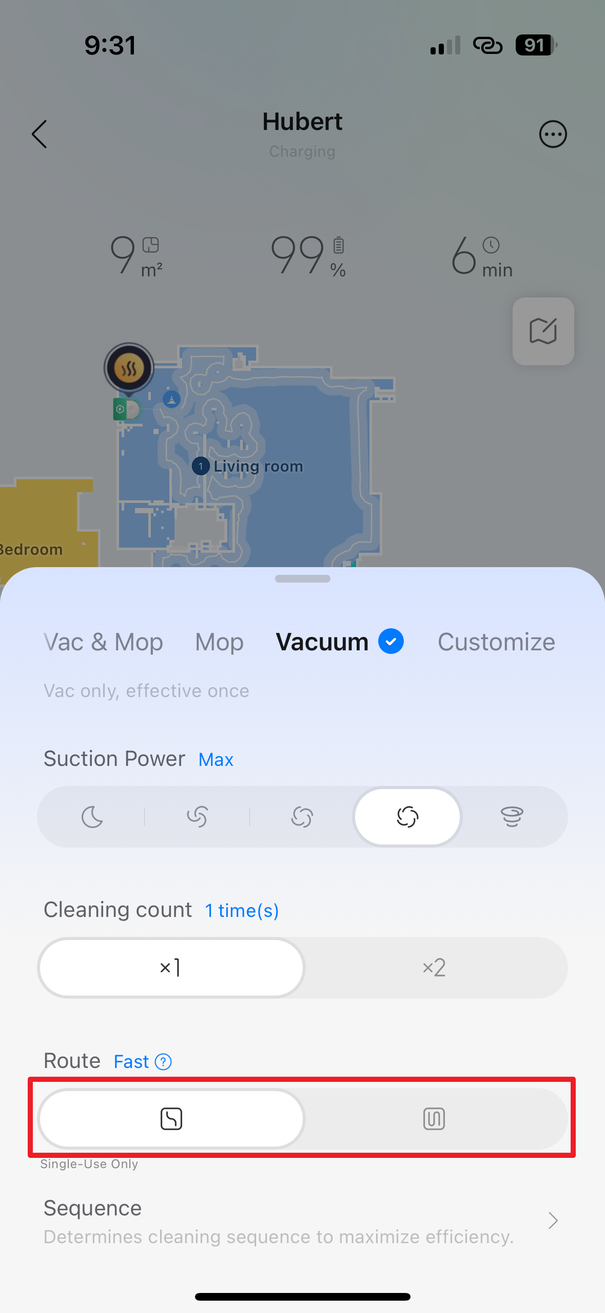 Do třetice všeho dobrého tu máme sekci Vacuum, kterou využijete tehdy, když chcete vysávat, ale nikoli vytírat. Podobně, jako u kombinovaného režimu, je zde možnost nastavení jednoho, nebo dvou opakování úklidu (Cleaning Count) a volba mezi rychlou a standardní trasou (Route).