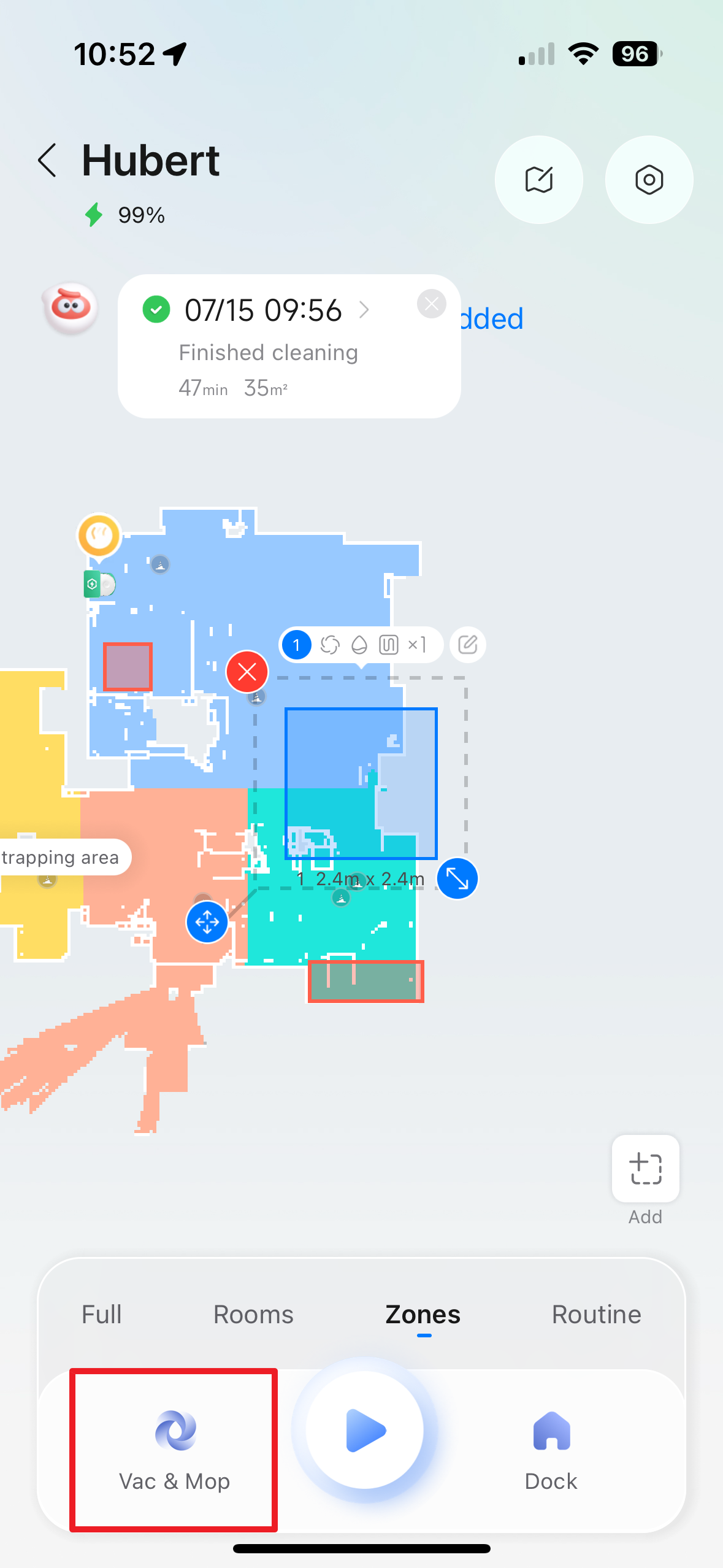 Umístěte zónu (modrý čtverec) na nějaké místo – ideálně takové, ze kterého budete vysavač přenášet do nové oblasti, ať to nemáte daleko. Následně klepněte na tlačítko pro nastavení režimu úklidu. Nastavte ten typ úklidu, který budete chtít použít v patře či oddělené oblasti.