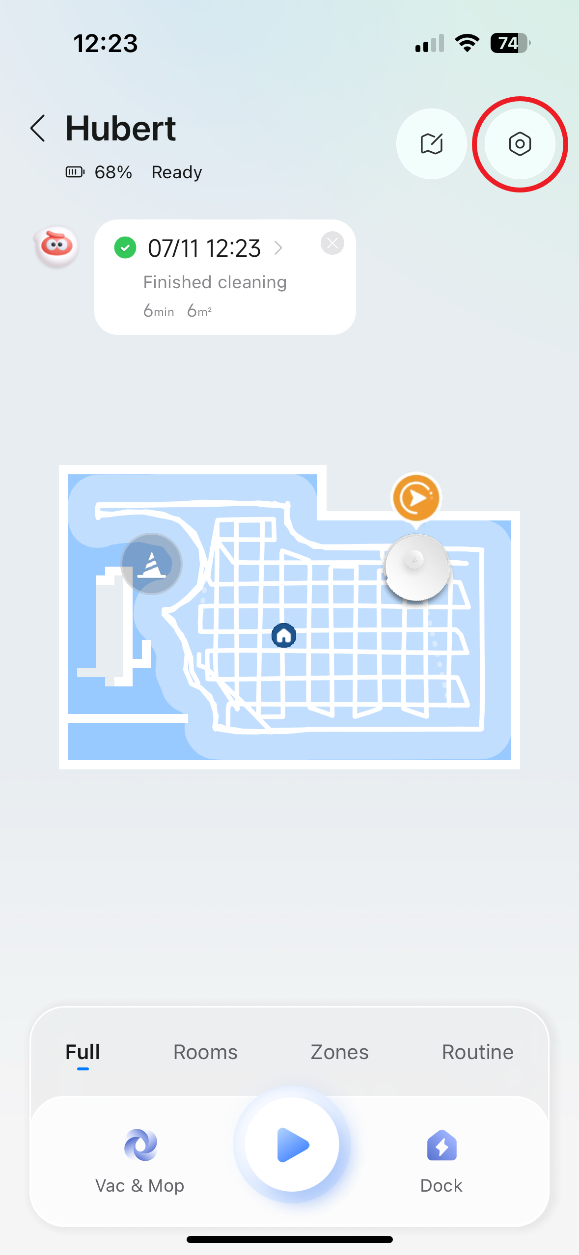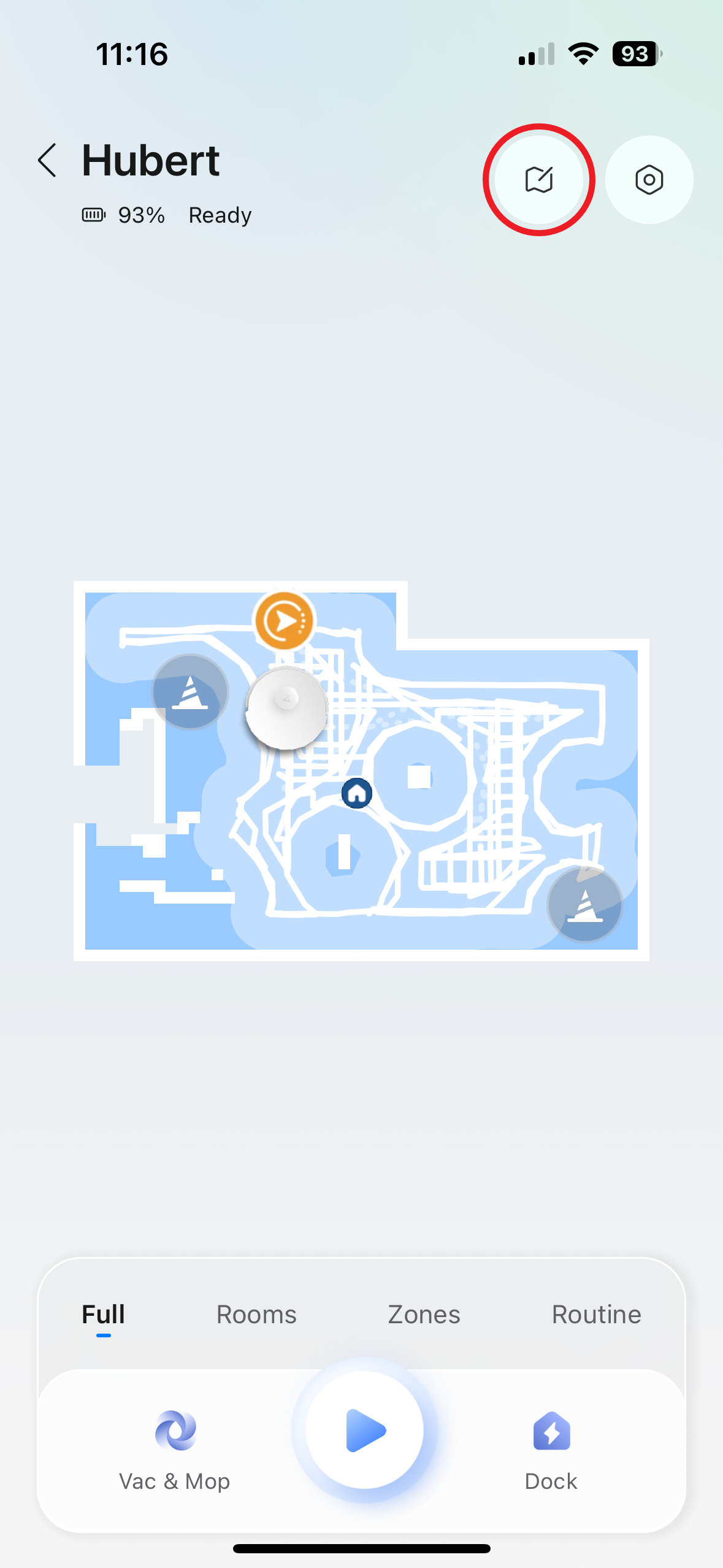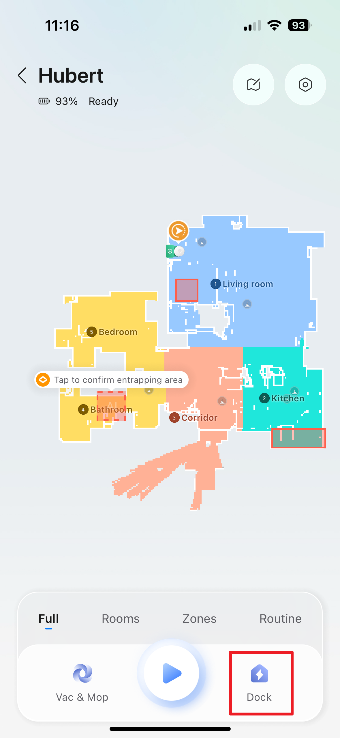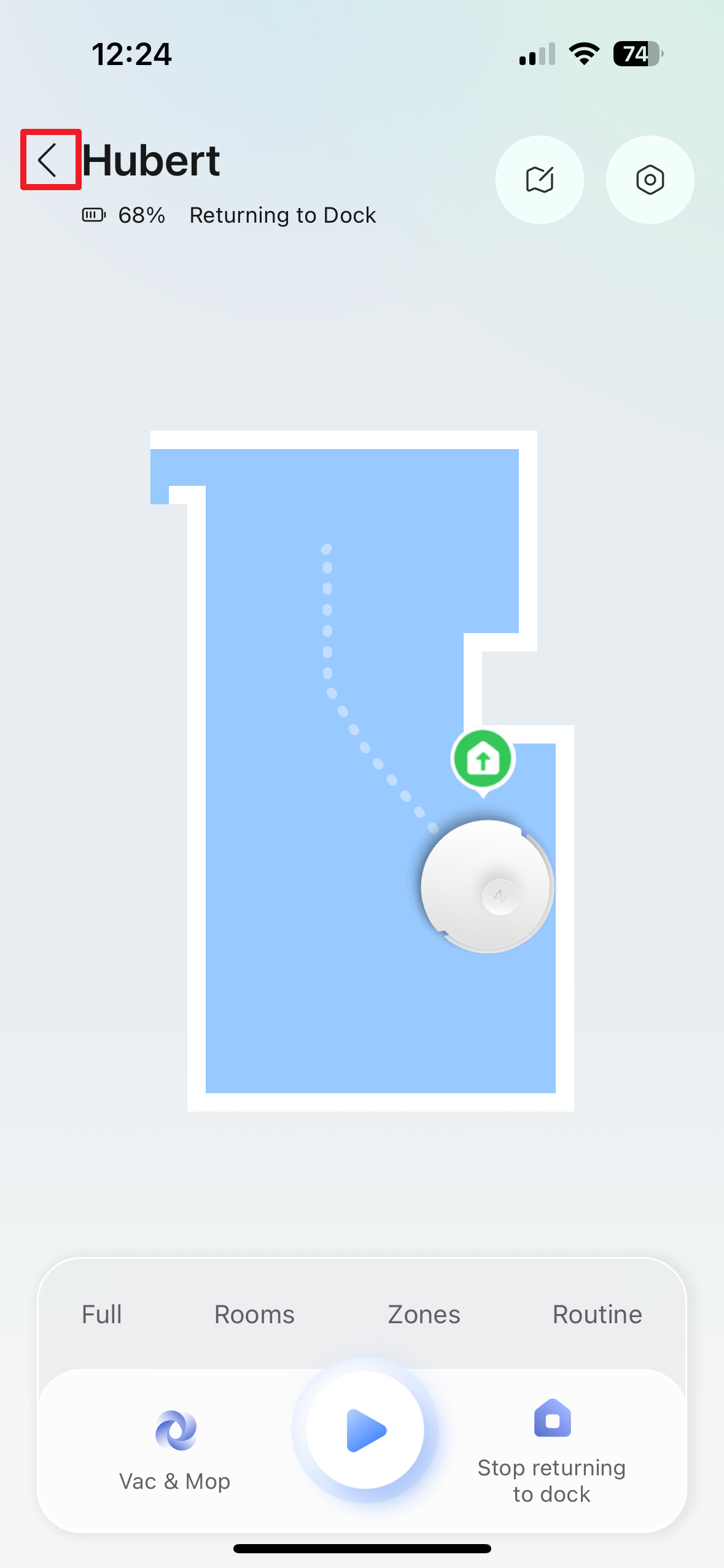 Po dokončení úklidu přeneste vysavač zpět do patra, ve kterém se nachází dokovací stanice. Přes ikonu s mapou změňte mapu na výchozí a tlačítkem Back to Dock pošlete vysavač do dokovací stanice, kde by se měl vyprázdnit a umýt si mopy.