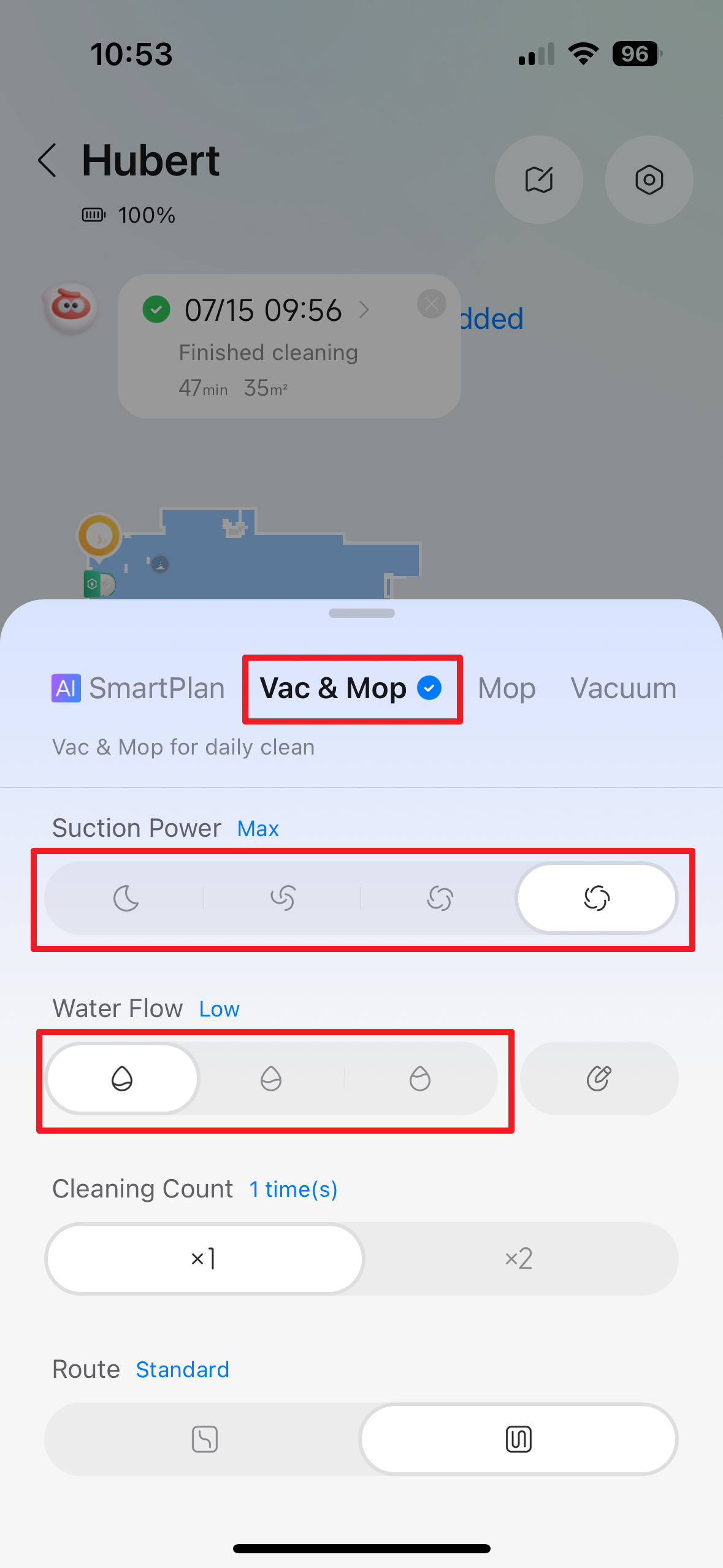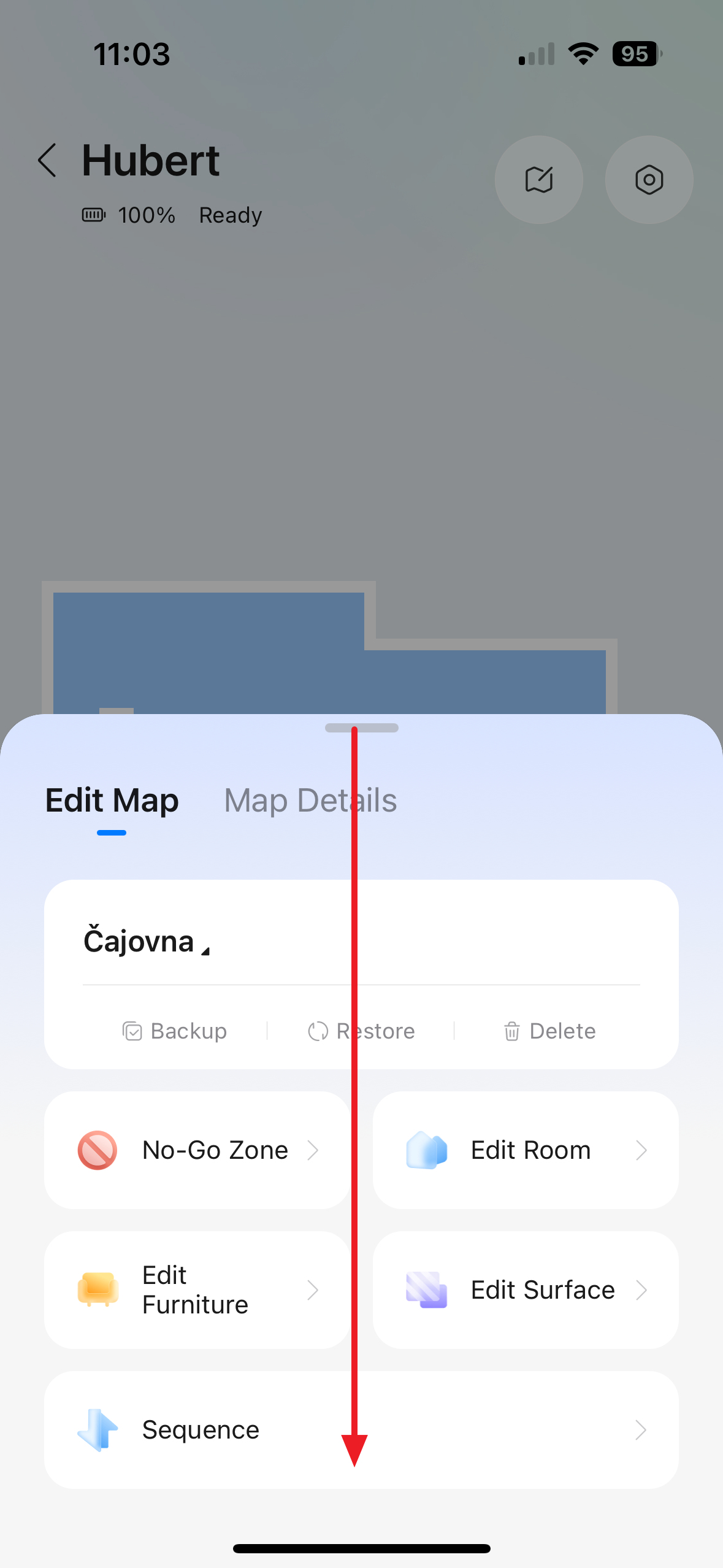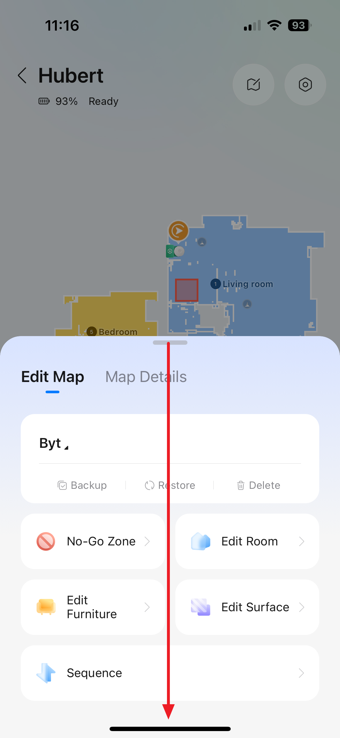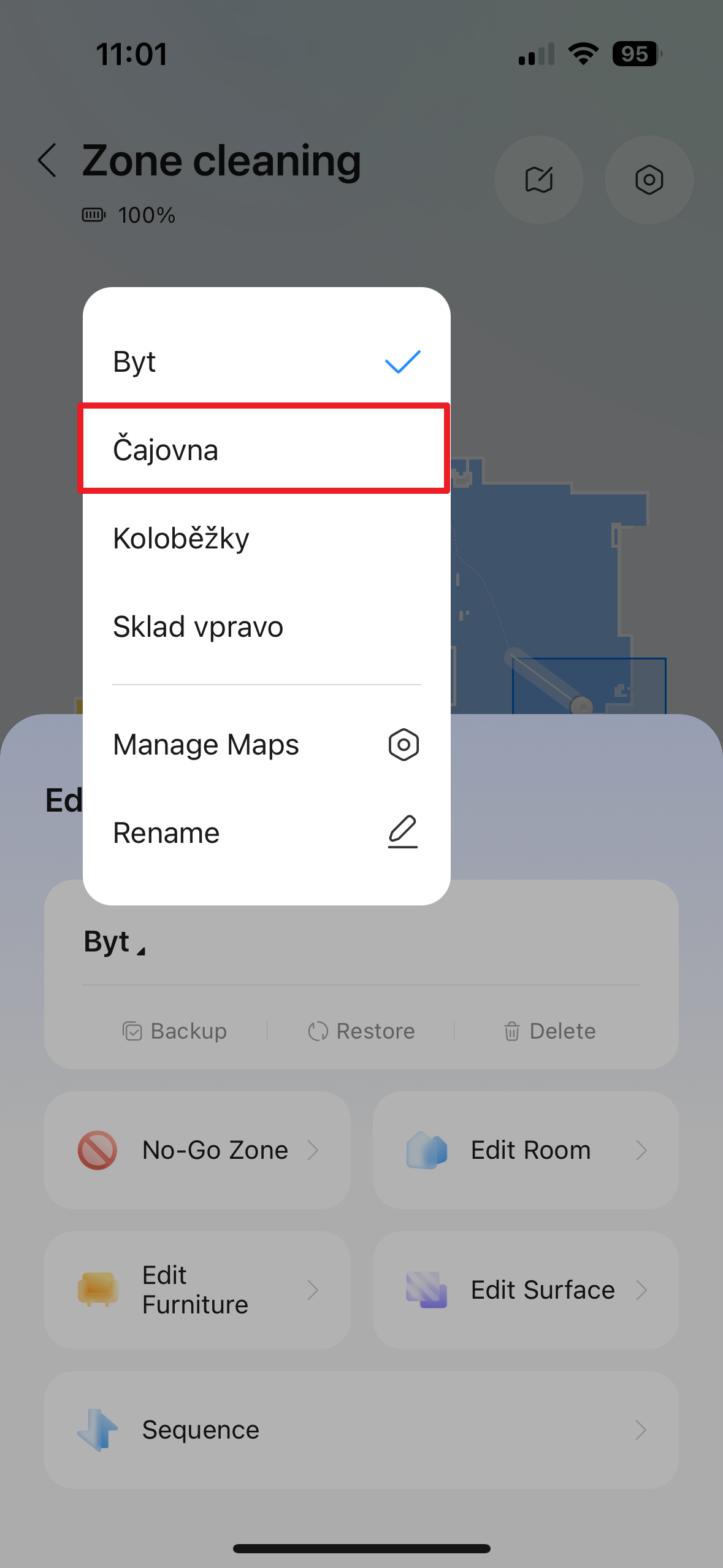 Poté znovu rozbalte nabídku se seznamem map a zvolte oblast, do které jste vysavač přenesli. Poté stáhněte nabídku s mapami za ouško směrem dolů. Měli byste vidět mapu oblasti, ve které se vysavač nachází. Nyní již můžete způsobem, který jsme vám vysvětlili ve druhém díle našeho seriálu, nastavit požadovaný způsob úklidu a zahájit ho.