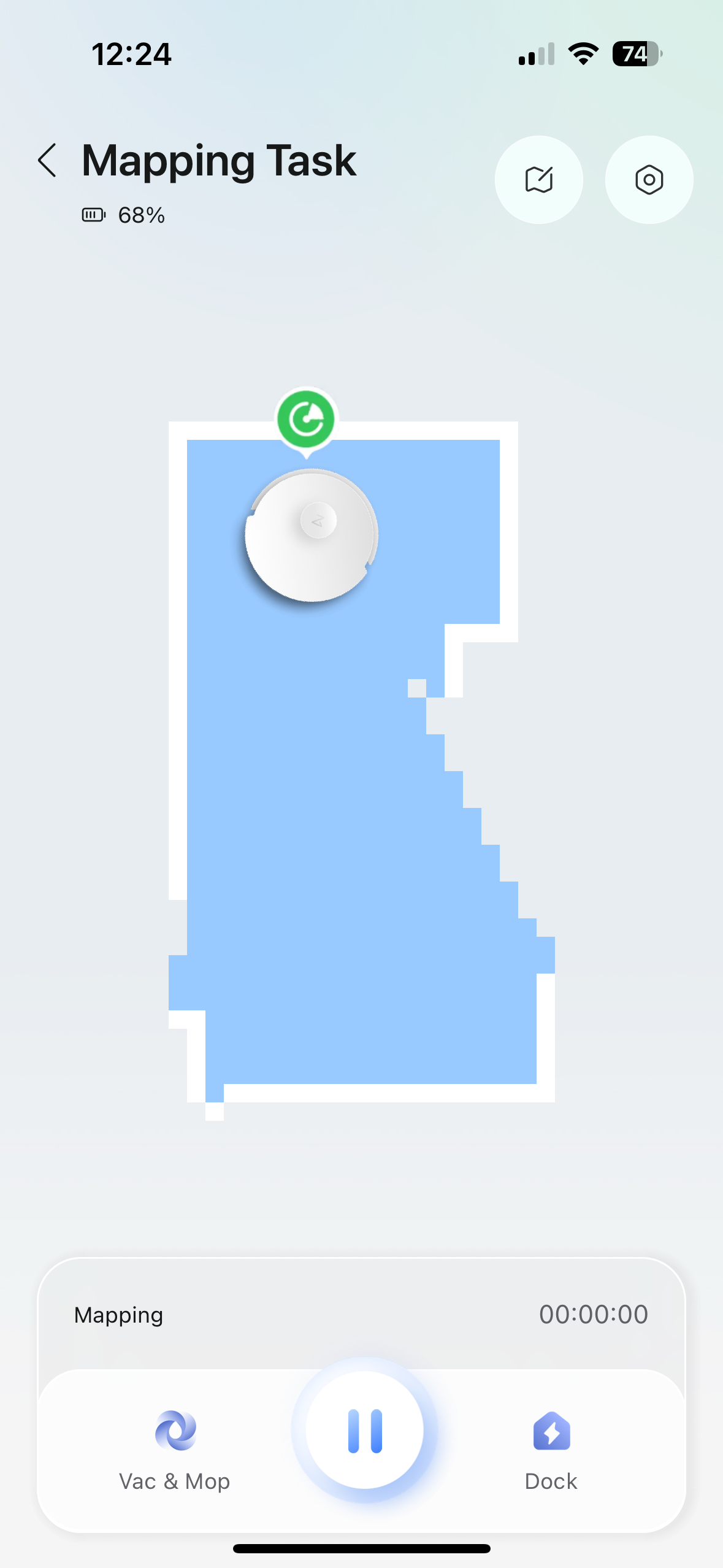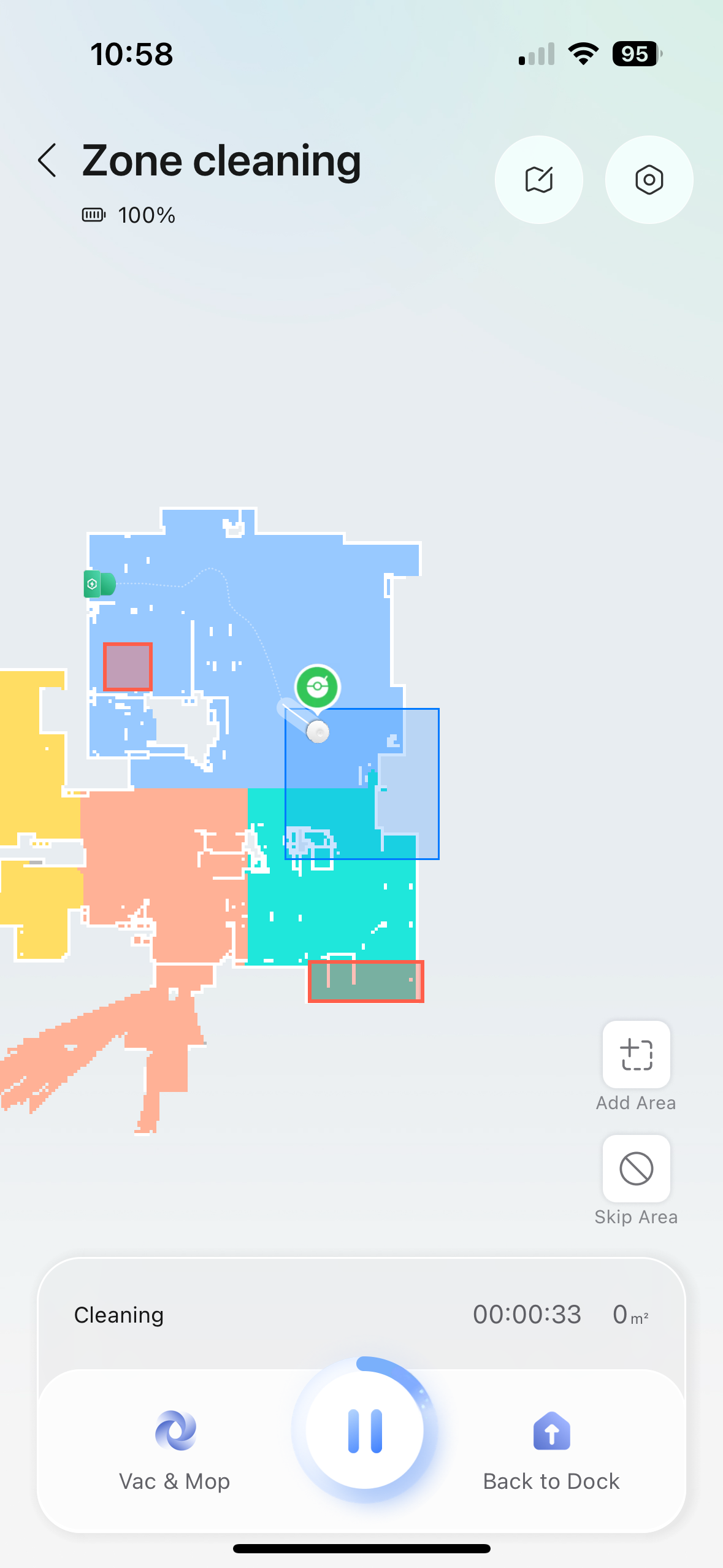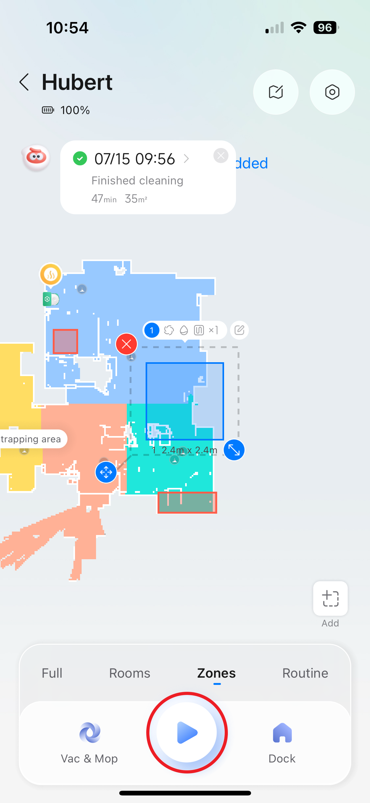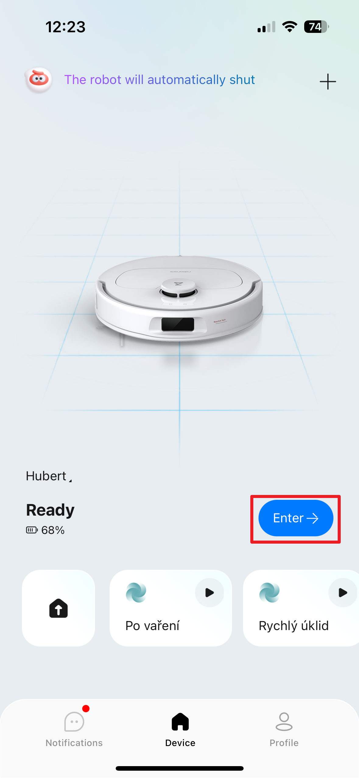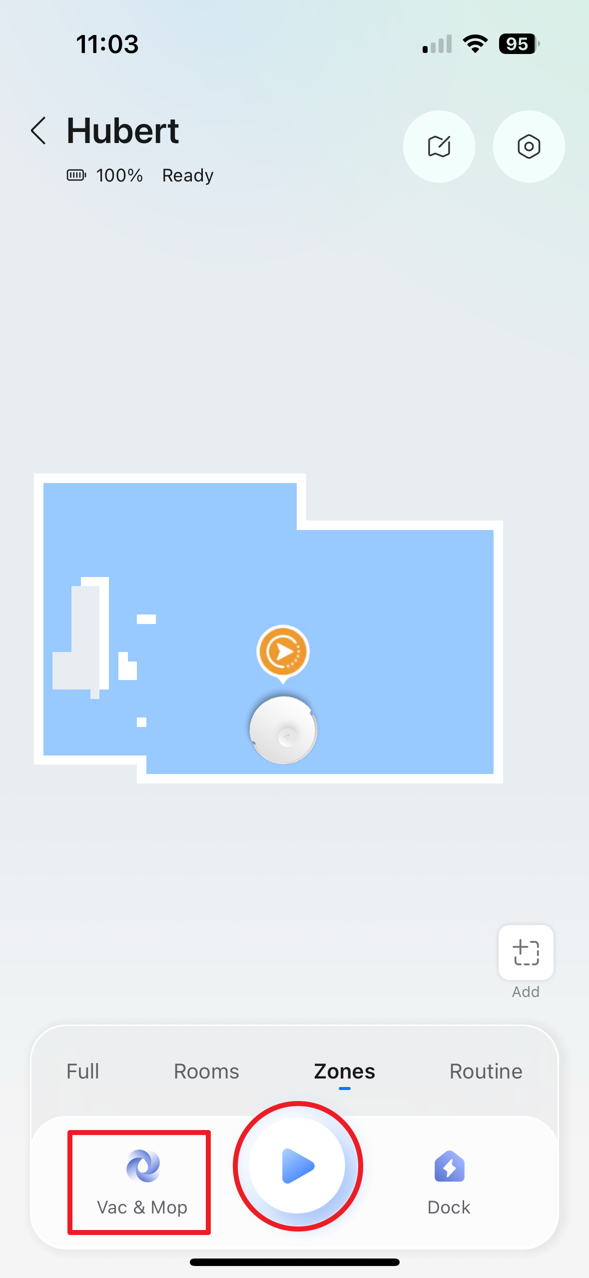 Následně stiskněte tlačítko pro zahájení úklidu. Vysavač si umyje mopy, doplní vodu, vyjede z dokovací stanice, přejede do vyznačené oblasti a začne uklízet. V tom okamžiku stiskněte tlačítko pro pozastavení úklidu. Poté, co se přístroj zastaví, ho můžete přenést do patra, respektive do jiné oblasti.