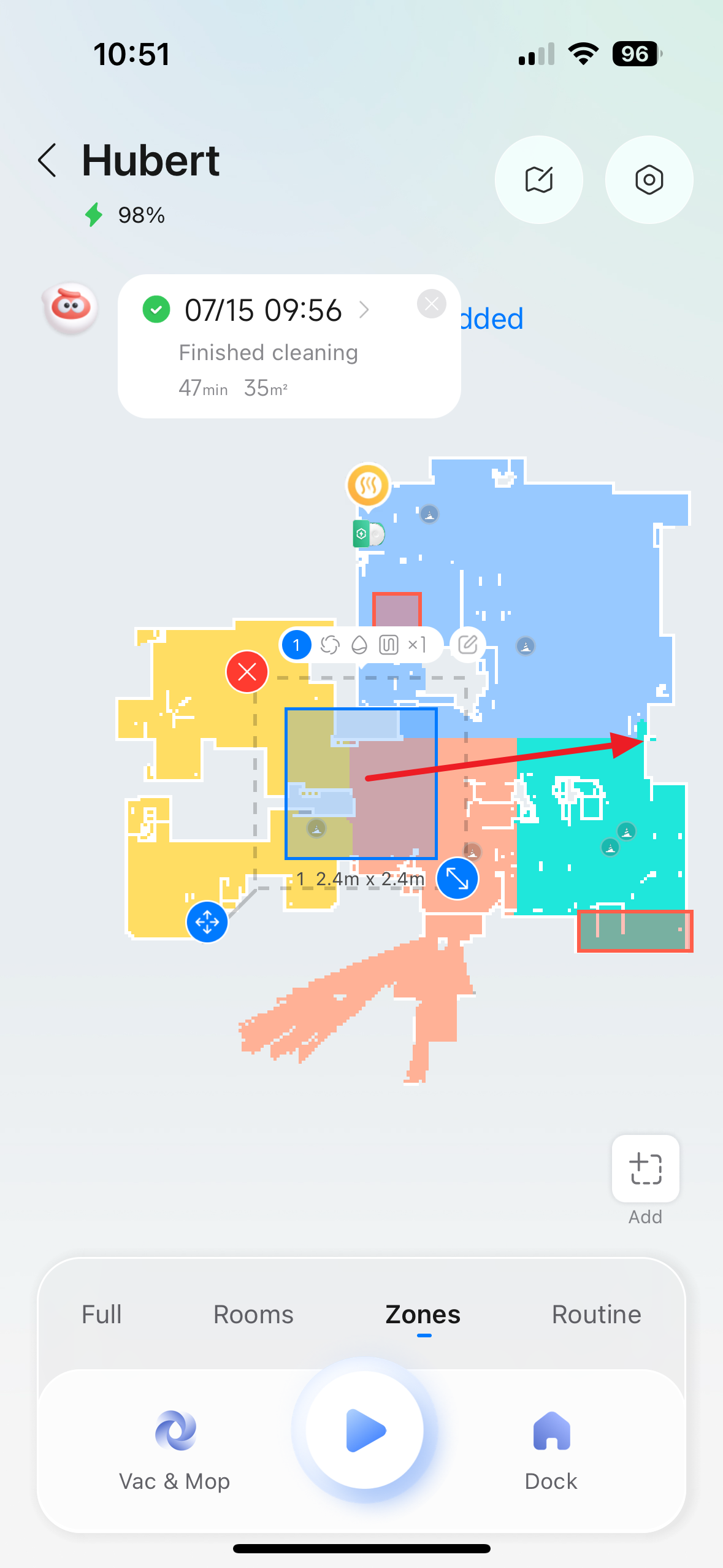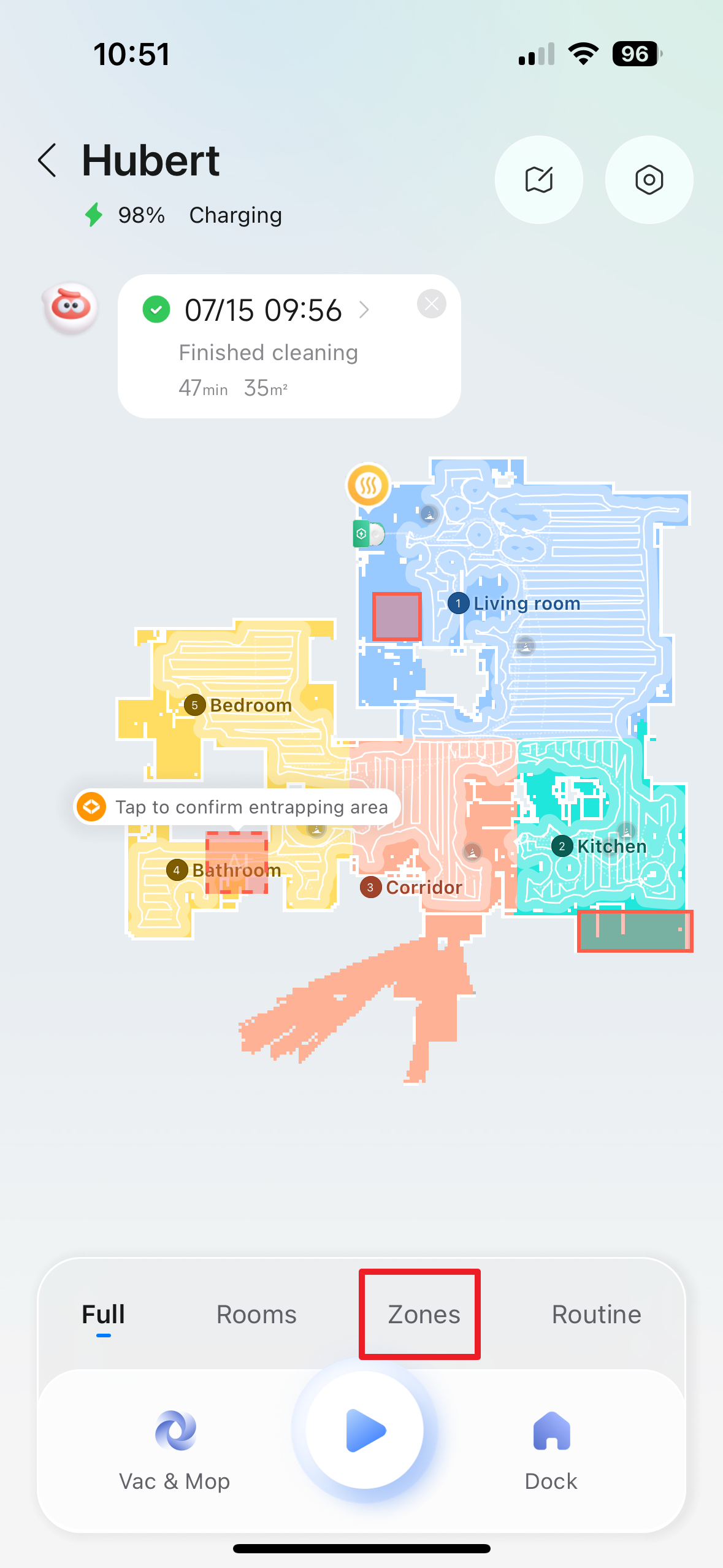 Pokud nechcete přenášet nabíjecí základnu, bude nutné vysavač na úklid v oddělené oblastí nejprve připravit. V aplikaci Roborock proto přejděte z úvodní obrazovky tlačítkem Enter do nastavení úklidu. Zde v dolní části obrazovky přejděte do sekce Zones.