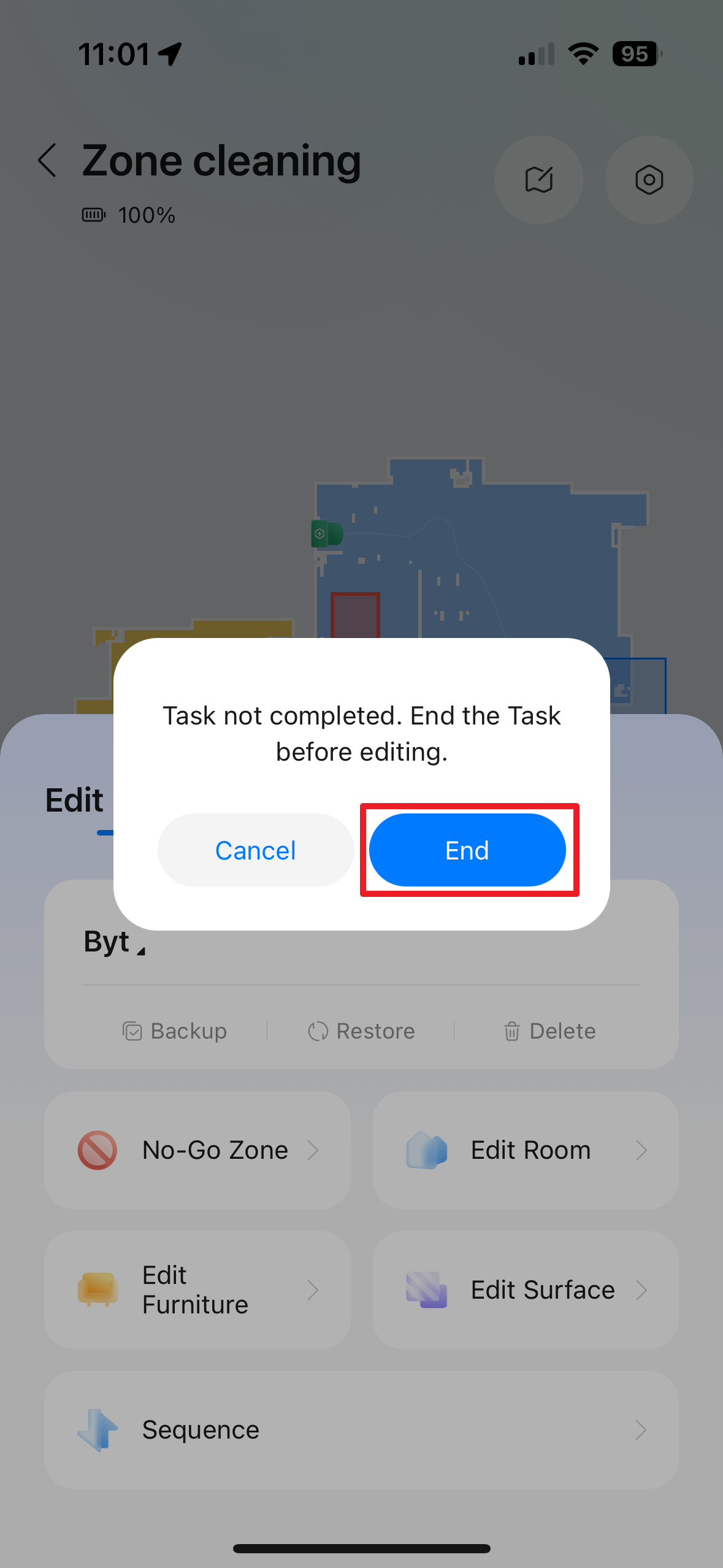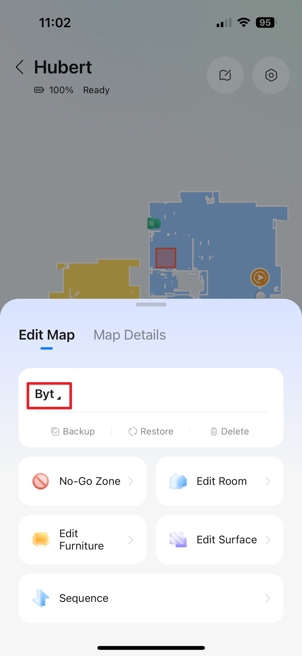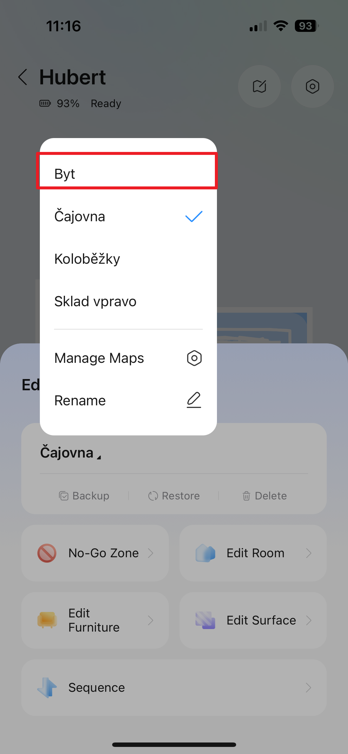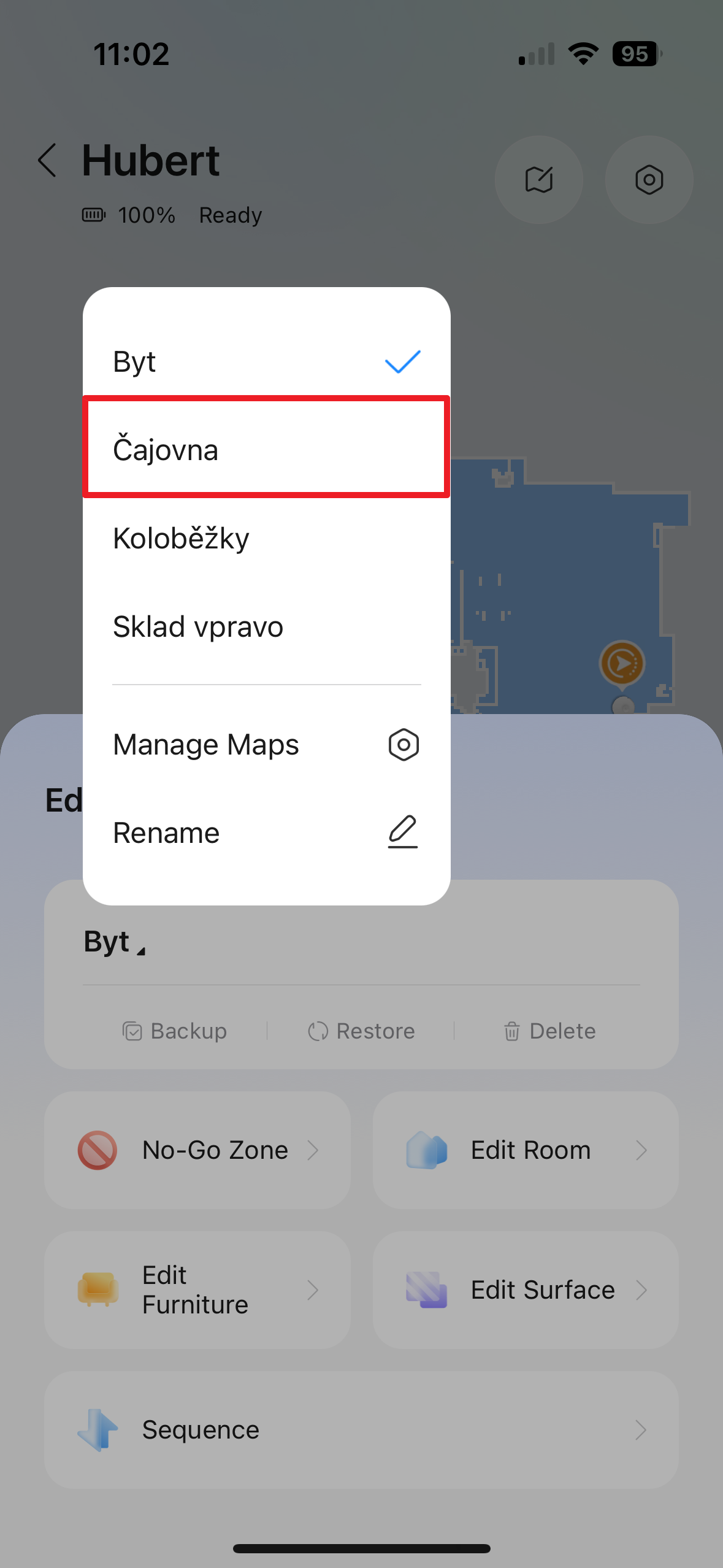 Klepněte na tlačítko s obrázkem mapy, nacházející se v pravé horní oblasti aplikace. V sekci Edit Map otevřete rozbalovací nabídku a následně zvolte prostor, ve kterém se nachází. Aplikace bude protestovat s tím, že mapu lze změnit jedině, když ukončíte probíhající úlohu. Potvrďte to stiskem tlačítka End, na což bude vysavač reagovat hlášením „Stop cleaning“.
