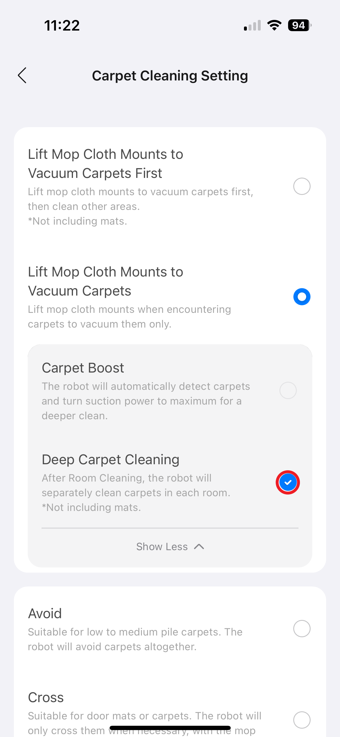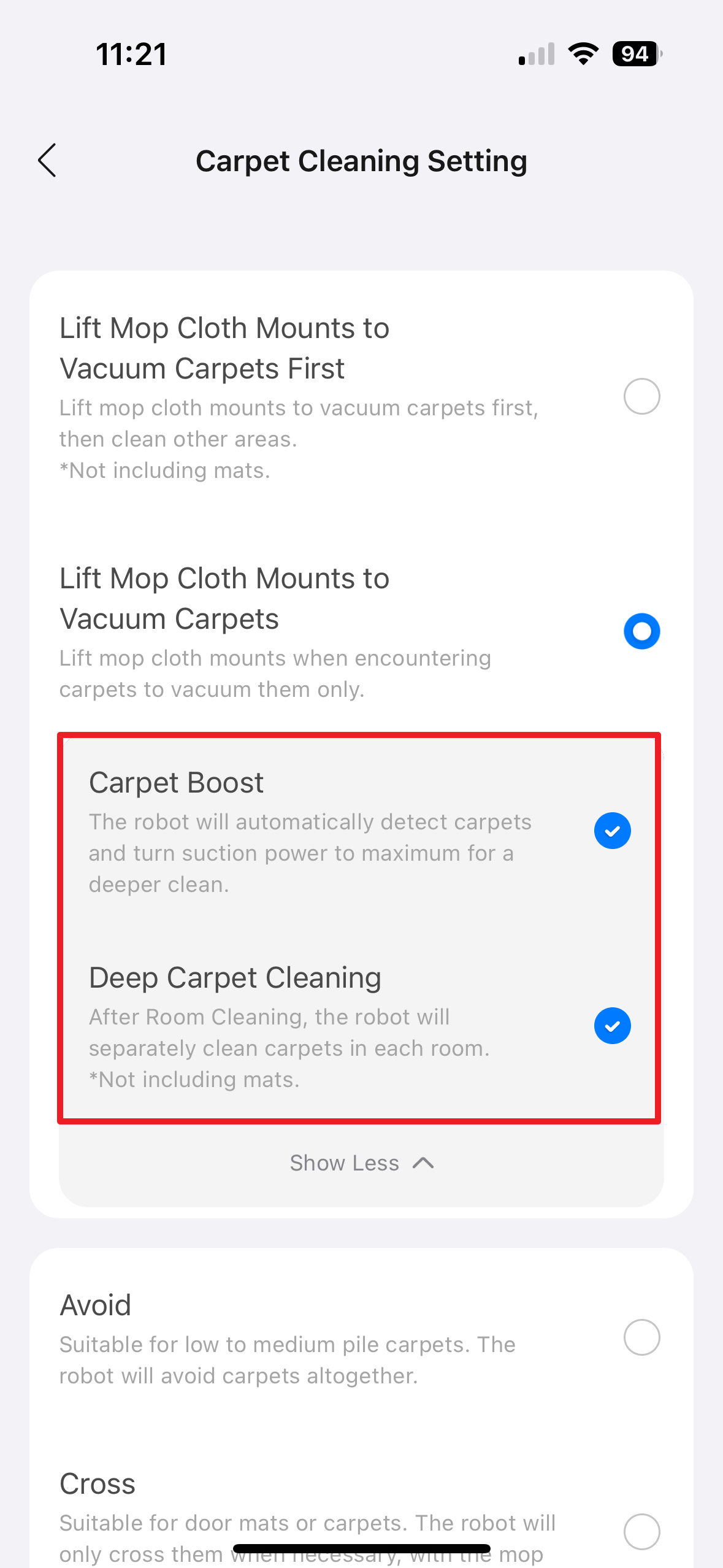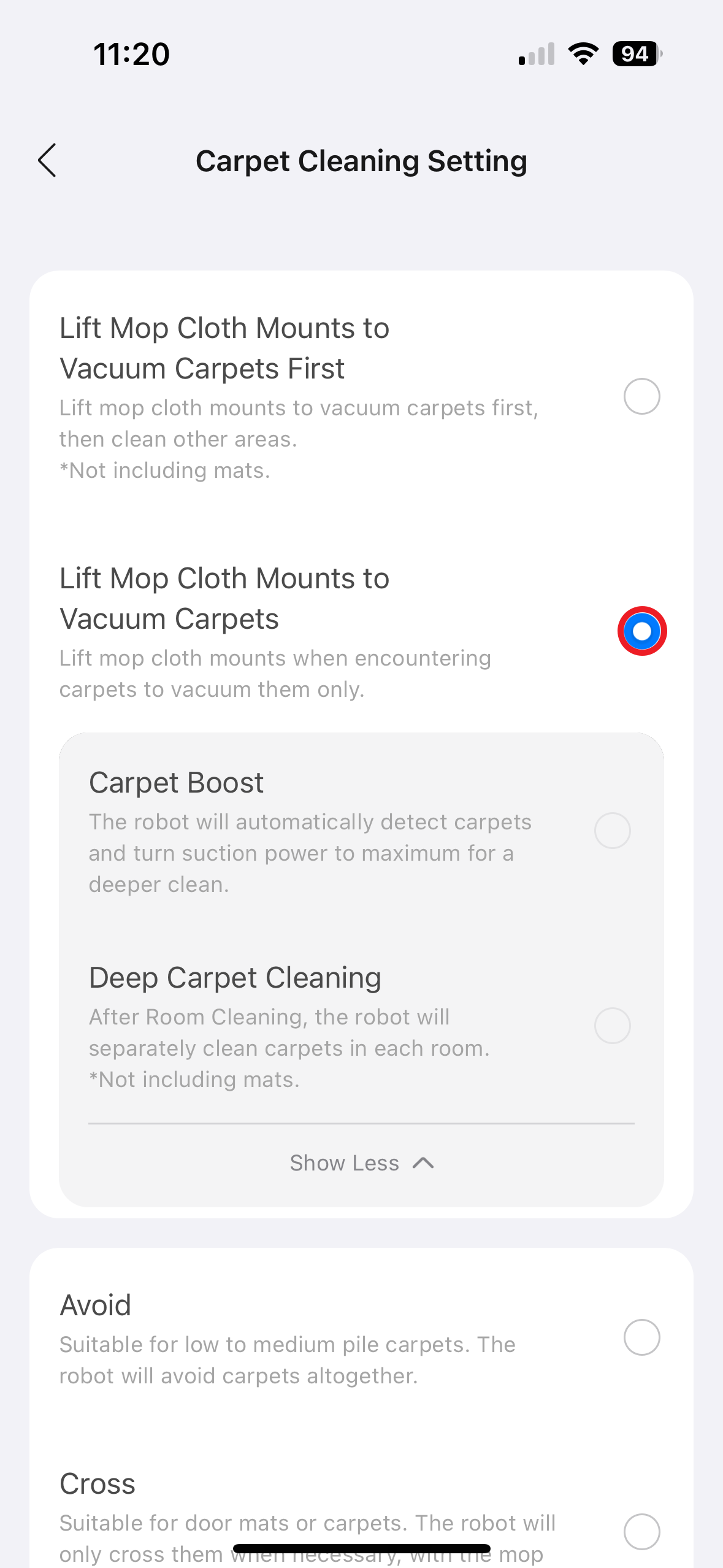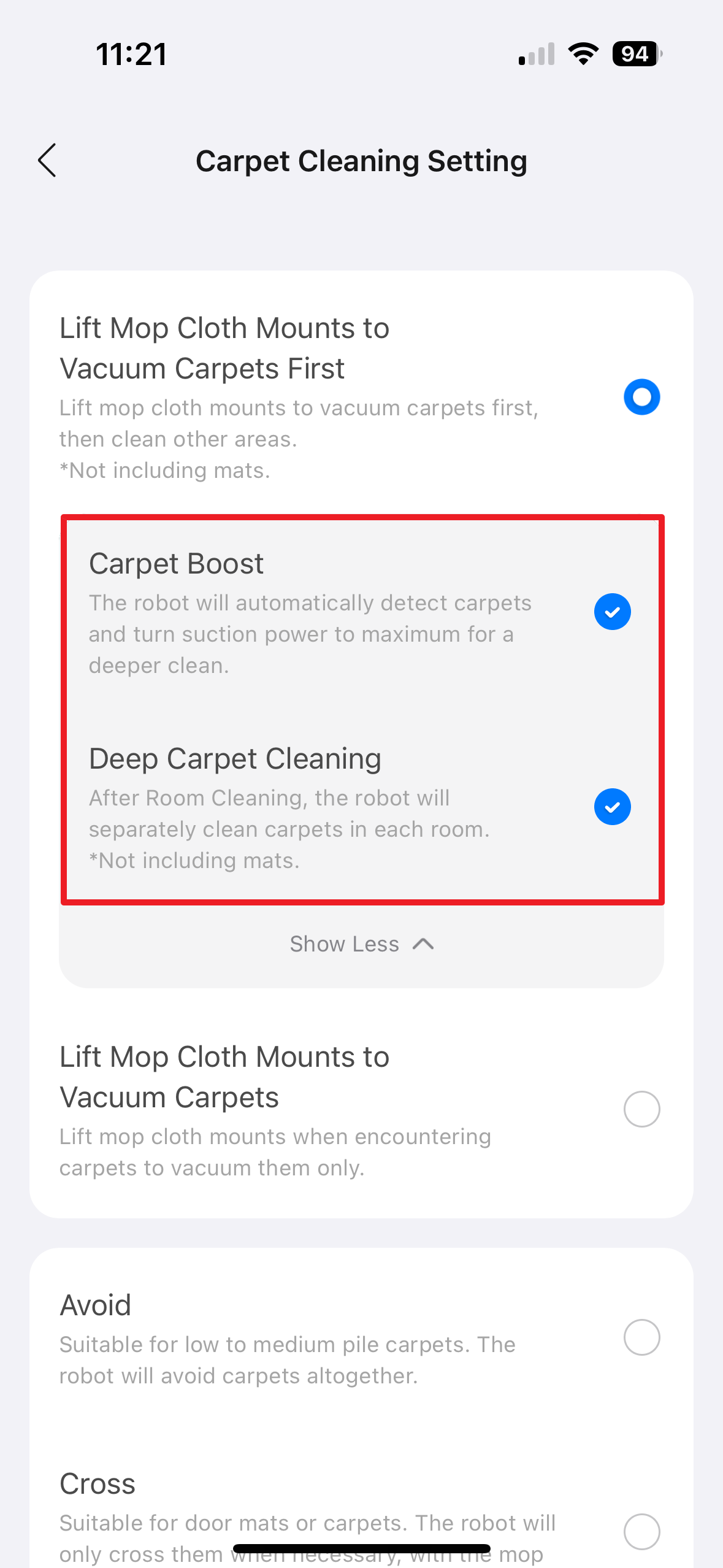 Pod volbami Lift Mop Cloth Mounts to Vacuum Carpets First a Lift Mop Cloth Mounts to Vacuum Carpets budete mít k dispozici dva přepínače: Carpet Boost a Deep Carpet Cleaning. Zde rozhodujete o tom, co přesně má robotický vysavač dělat v momentě, kdy se ocitne na koberci. Je to volba mezi okamžitou silou a následnou pečlivostí.