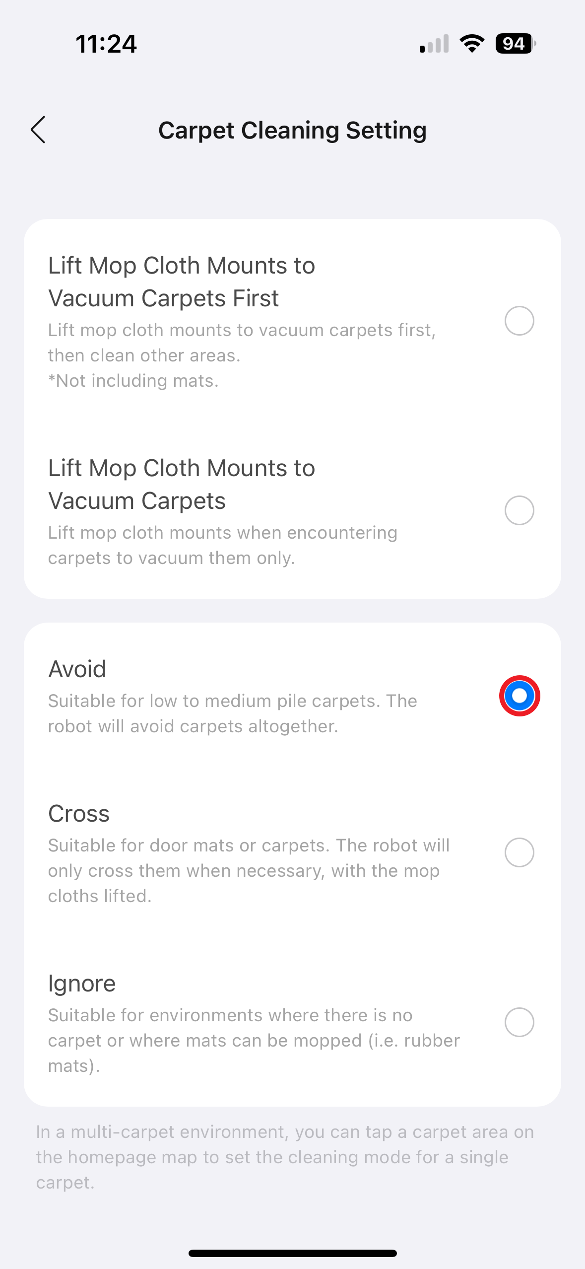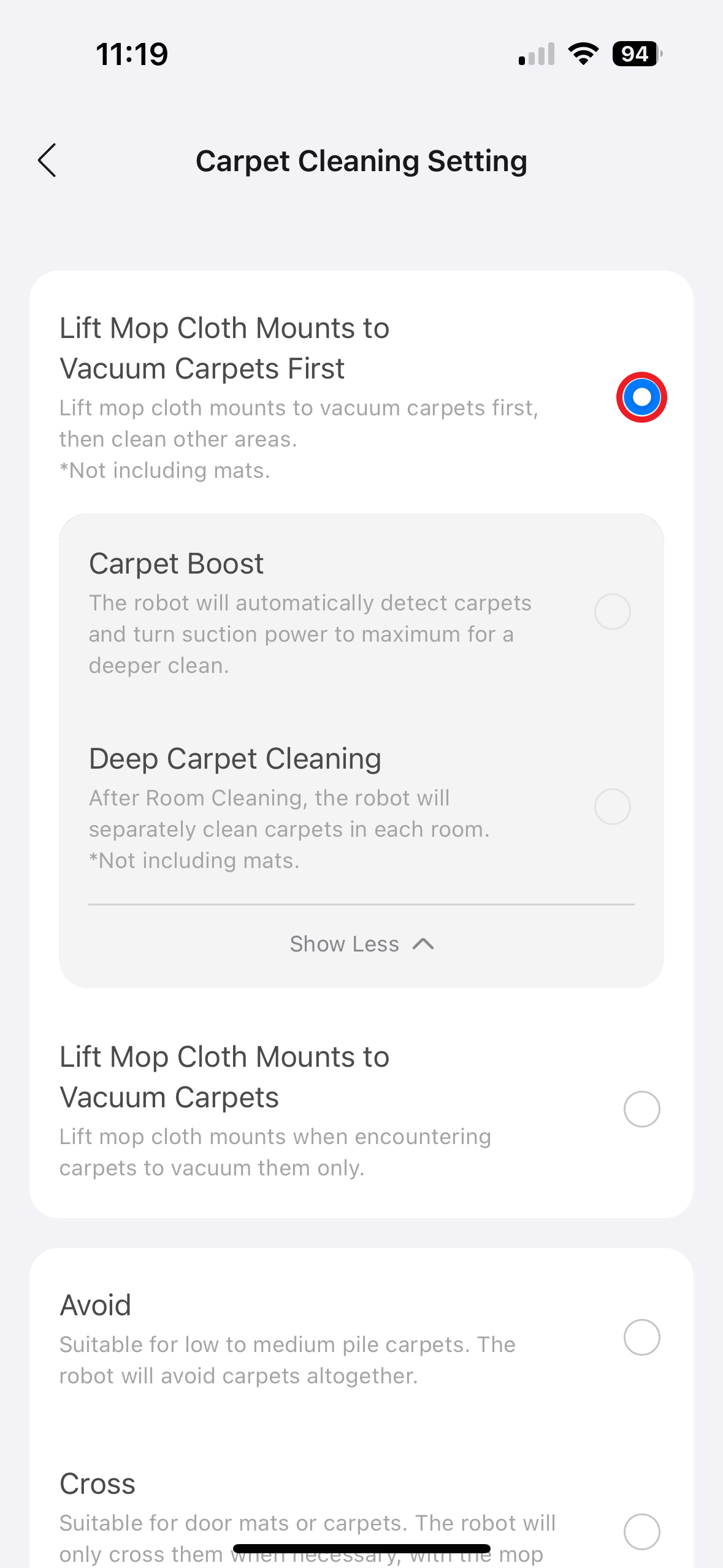 Po klepnutí na Carpet Cleaning Setting se otevře nabídka s několika režimy chování vysavače na kobercích, které si nyní podrobně představíme. První volba Lift Mop Cloth Mounts to Vacuum Carpets First (Zvednout mopy a nejprve vysát koberce) je určena pro obzvláště opatrné majitele choulostivých koberců. Pokud aktivujete tento režim, robot změní celou svou úklidovou strategii. Ještě předtím, než vůbec namočí mopy, projede celý byt a nejprve vysaje všechny koberce. Teprve když má tuto „suchou“ fázi za sebou, vrátí se na základnu, zahájí mopování a pustí se do úklidu tvrdých podlah.