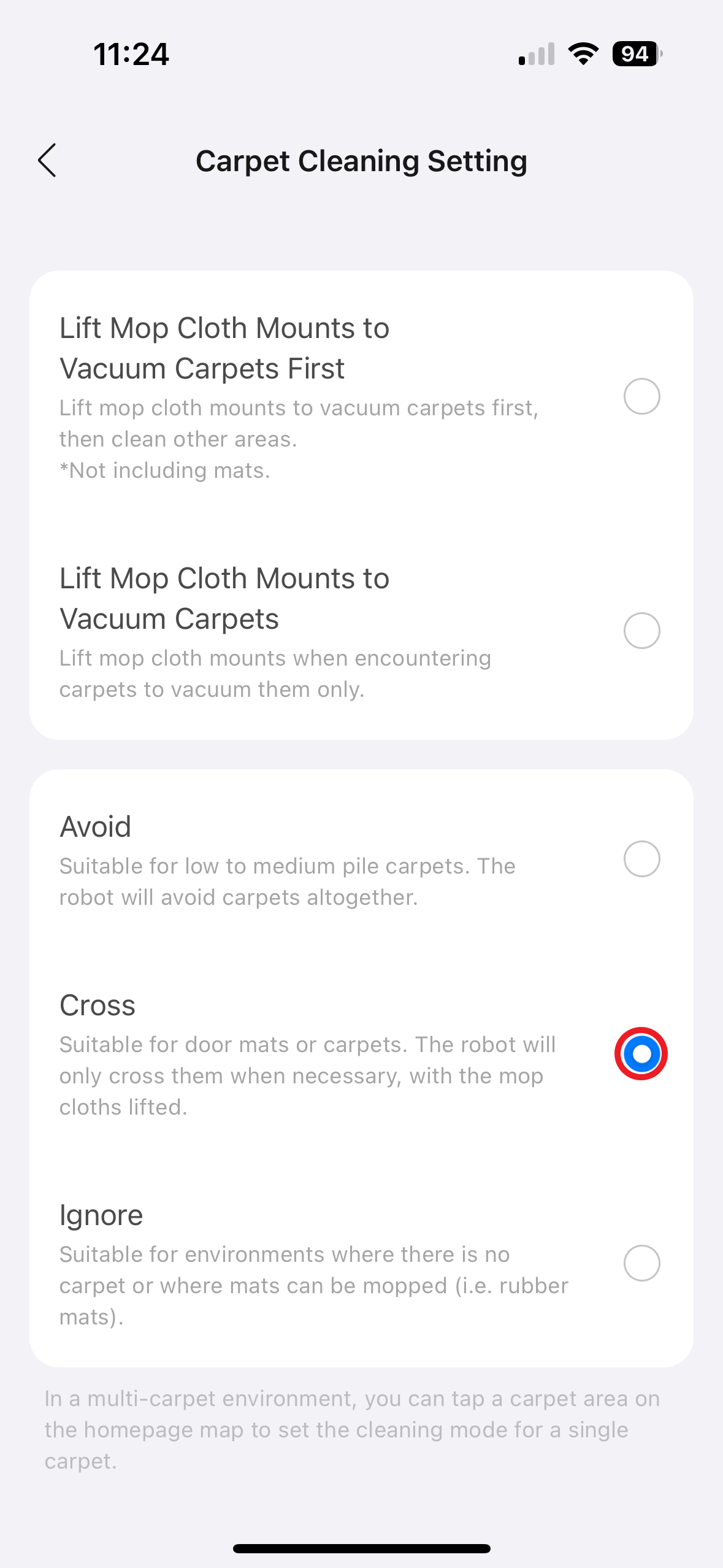 Čtvrtá volba Cross (Přejet) se hodí v situaci, kdy máte dvě místnosti s tvrdou podlahou, které jsou však propojené chodbou s kobercem. Zde by režim Avoid znemožnil úklid dalších místností za chodbou. A právě zde přichází ke slovu tento mód, kdy vysavač nebude koberec aktivně uklízet, ale použije jej jako tranzitní cestu, aby se dostal do další části bytu. Samozřejmostí je, že při tomto přejezdu zvedne mopovací moduly, aby koberec zůstal suchý.