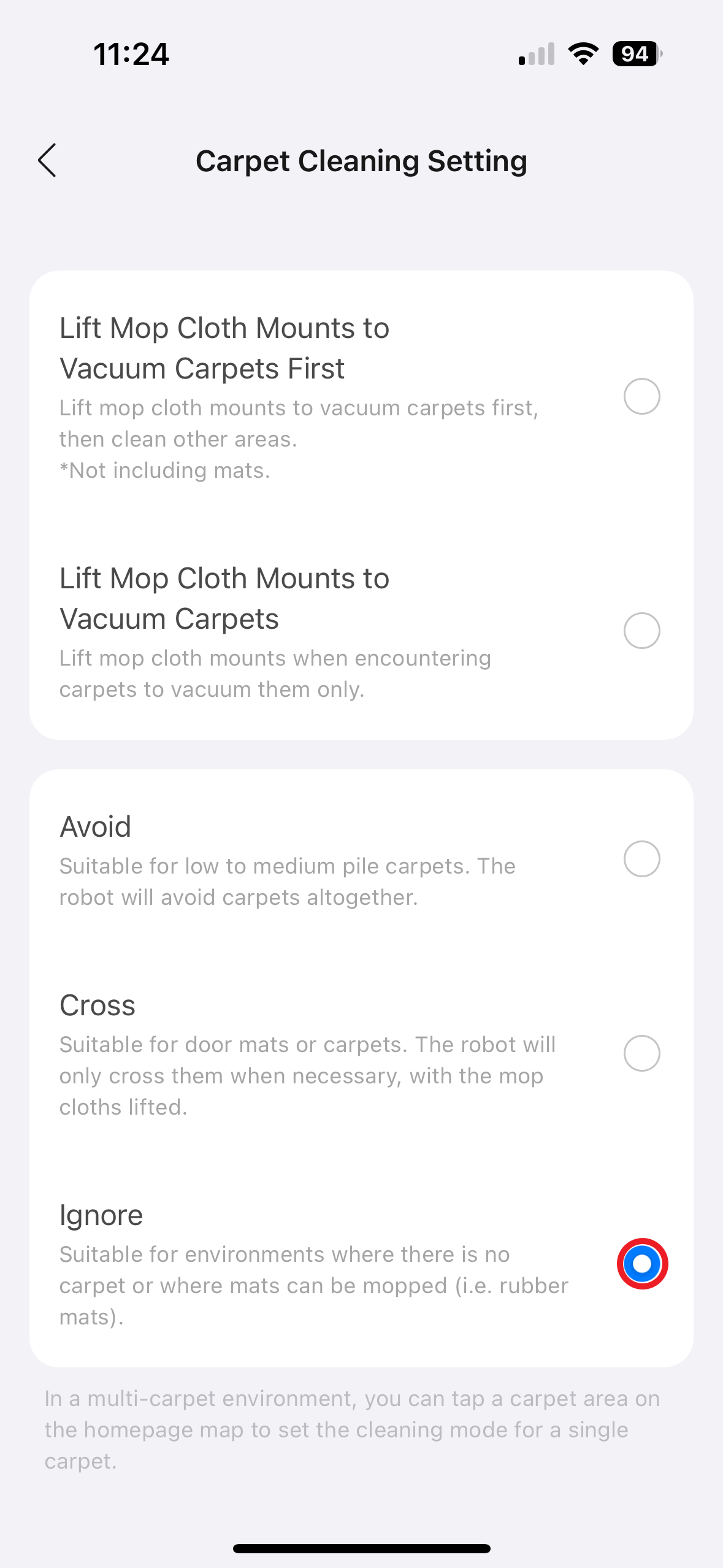 Poslední pátá volba Ignore (Ignorovat) v podstatě deaktivuje inteligentní rozpoznávání koberců. Robotický vysavač v tomto módu bez váhání přejede a namočí vše, co mu stojí v cestě. Ač to zní nebezpečně, má to své opodstatnění. Tento režim je určen pro prostory, kde nejsou žádné textilní koberce, nebo pro domácnosti, které používají plně omyvatelné, voděodolné podložky – typicky gumové nebo plastové rohože v kuchyni, předsíni či dílně, u kterých je mopování žádoucí.