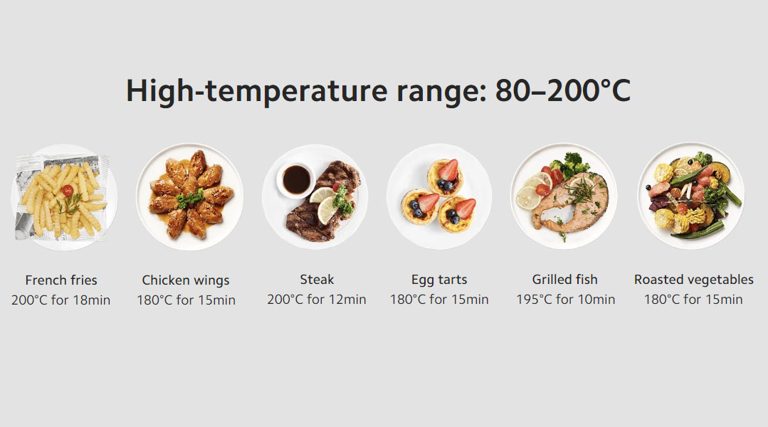 Horkovzdušná fritéza Xiaomi má široký provozní rozsah teplot od 40 °C do 200 °C. Díky tomu je možné ji využít nejen ke smažení a pečení ve vysokých teplotách, ale též pro rozmrazování a fermentaci při nízkých teplotách. Na nejnižší teplotu můžete například vyrábět jogurt. Přesnou regulaci teploty uvnitř přístroje zajišťuje integrovaný teplotní senzor NTC.
