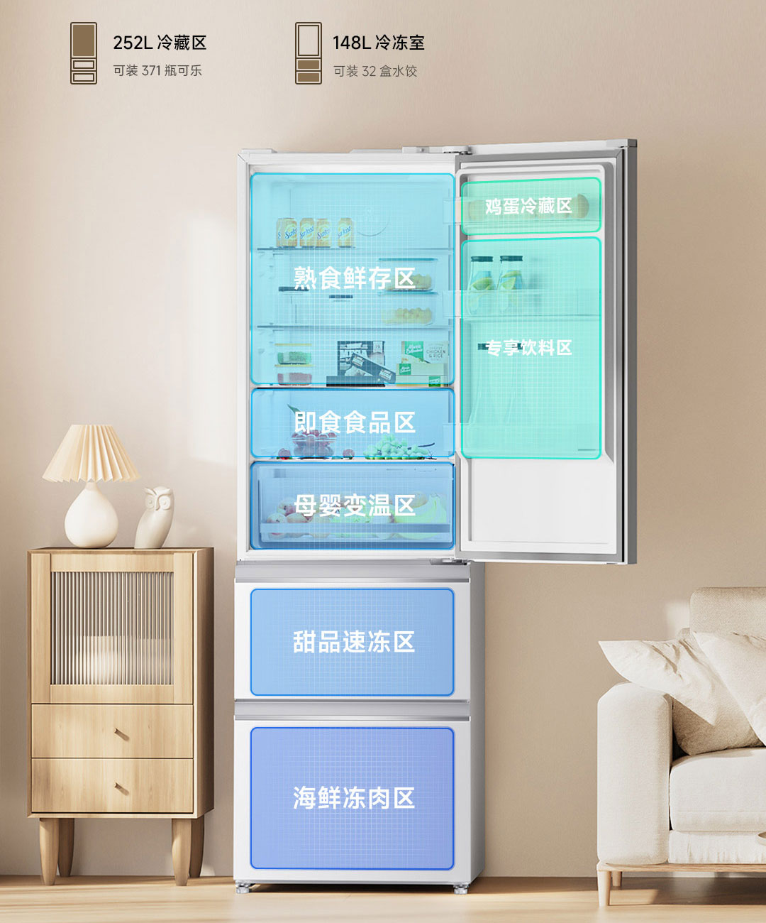 Jednou z výrazných vlastností chladničky Mijia Italian Style 400L je nezávislá uzavřená zásuvka s proměnlivou teplotou. Tato zásuvka nabízí tři teplotní režimy, které zajišťují optimální podmínky pro uchování výživové hodnoty pokrmů.