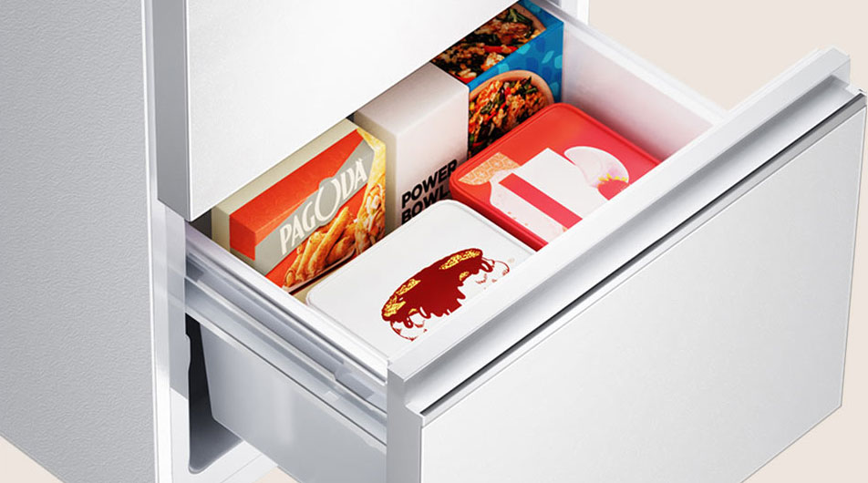 Celé zařízení se skládá ze dvou částí. Nahoře je chladnička s objemem 252 litrů, poskytující čtyři poličky a jednu velkou zásuvku na ovoce a zeleninu. Ve spodní části jsou dvě výsuvné zásuvky mrazáku s celkovým objemem 148 litrů.