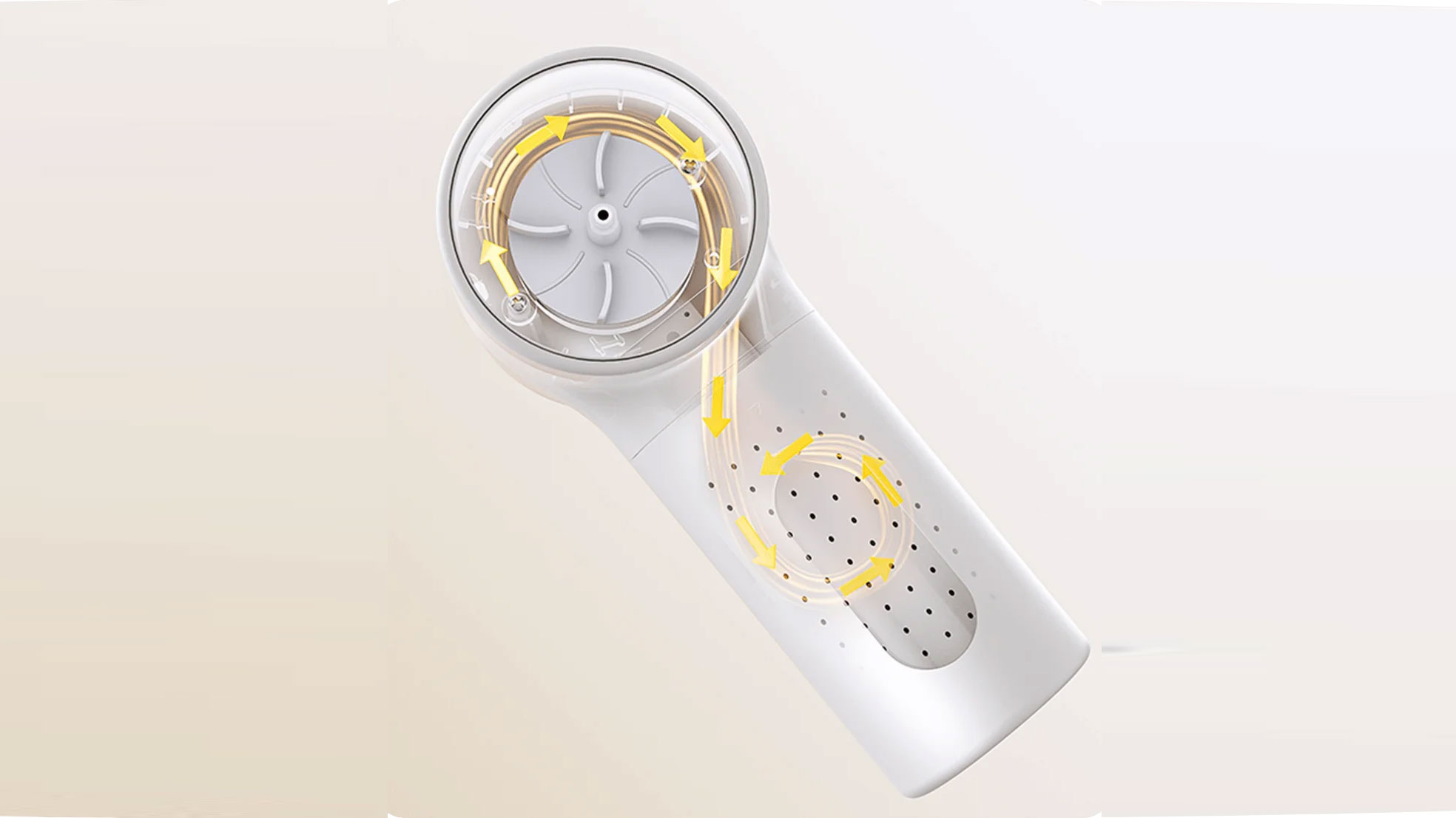 Velmi zajímavě je vyřešeno proudění vzduchu uvnitř samotného přístroje. Konstruktéři navrhli speciální vzduchový kanál ve tvaru číslice 8, který vytváří cyklónový efekt. Ten zajišťuje plynulé proudění vzduchu pouze jedním směrem a zabraňuje zpětnému pohybu materiálu. V praxi to znamená, že se nasbírané žmolky nevrací zpět k nožům ani nevypadávají ven, což by jinak komplikovalo čištění.