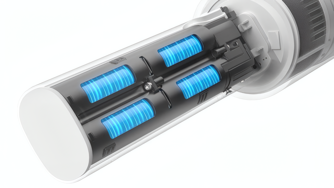 Napájení zajišťuje sada čtyř lithium-iontových článků, každý o kapacitě 2000 mAh. Ačkoli kapacita neoslní, díky úsporné elektronice zvládne přístroj fungovat v běžném režimu až 40 minut. To je dost času pro úklid menšího bytu na jeden zátah. V silnějším režimu počítejte s maximálně 10 minutami intenzivního vysávání. Výkonnější mód oceníte například na zaprášeném koberci nebo při rychlém vyčištění čalounění aut.