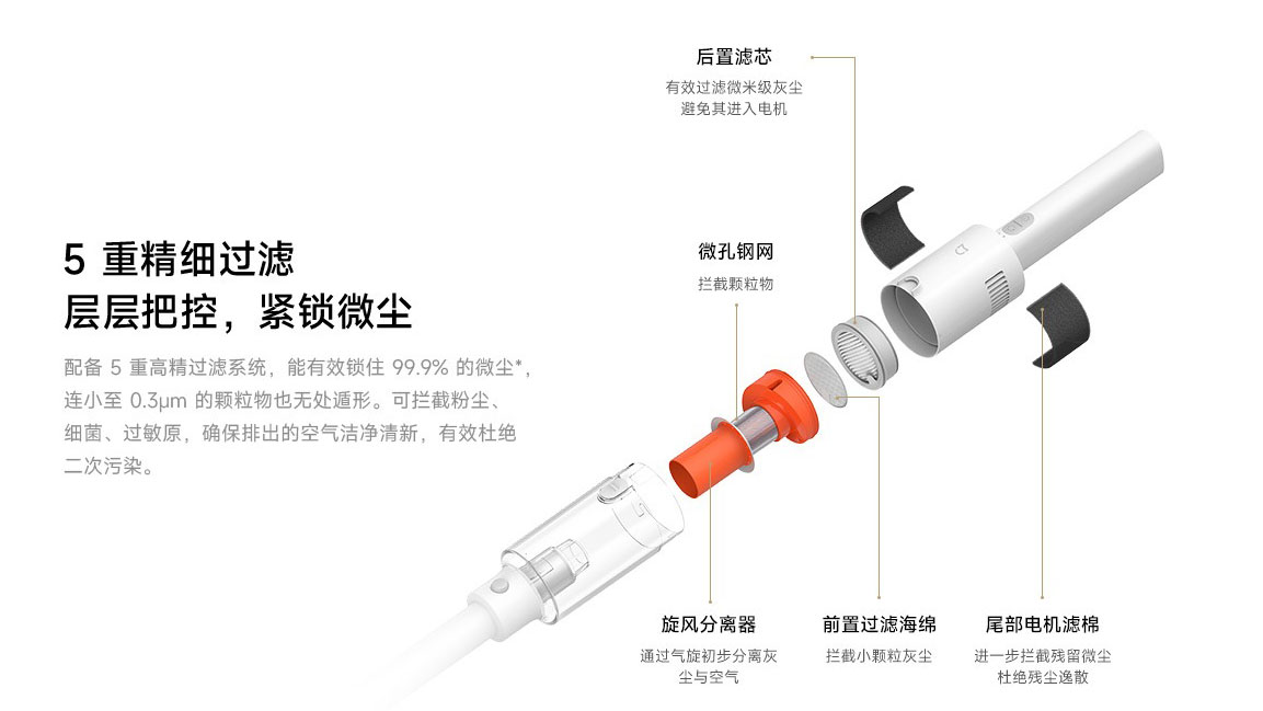 Významným prvkem je pětiúrovňový filtrační systém. Ten kombinuje cyklonovou komoru, kovové mikro-síto, pěnový předfiltr, HEPA filtr a ochrannou vrstvu u motoru. Tyto prvky společně dokážou zachytit až 99,9 % částic o velikosti 0,3 mikrometru. Zpět do místnosti se tak nevrací jemný prach ani alergeny.