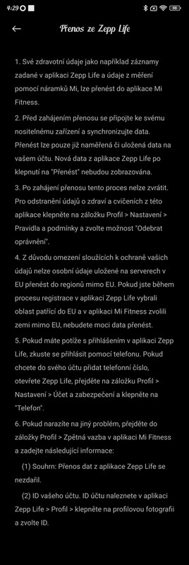 ……a dole jsou informace k přenosu dat z app Zepp Life do app Mi Fitness