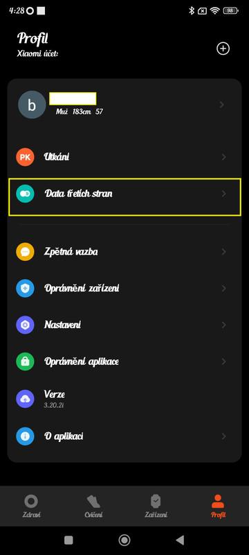V Mi Fitness se klikne dole v liště na „Profil“. V nabídce se klikne na „Data třetích stran“