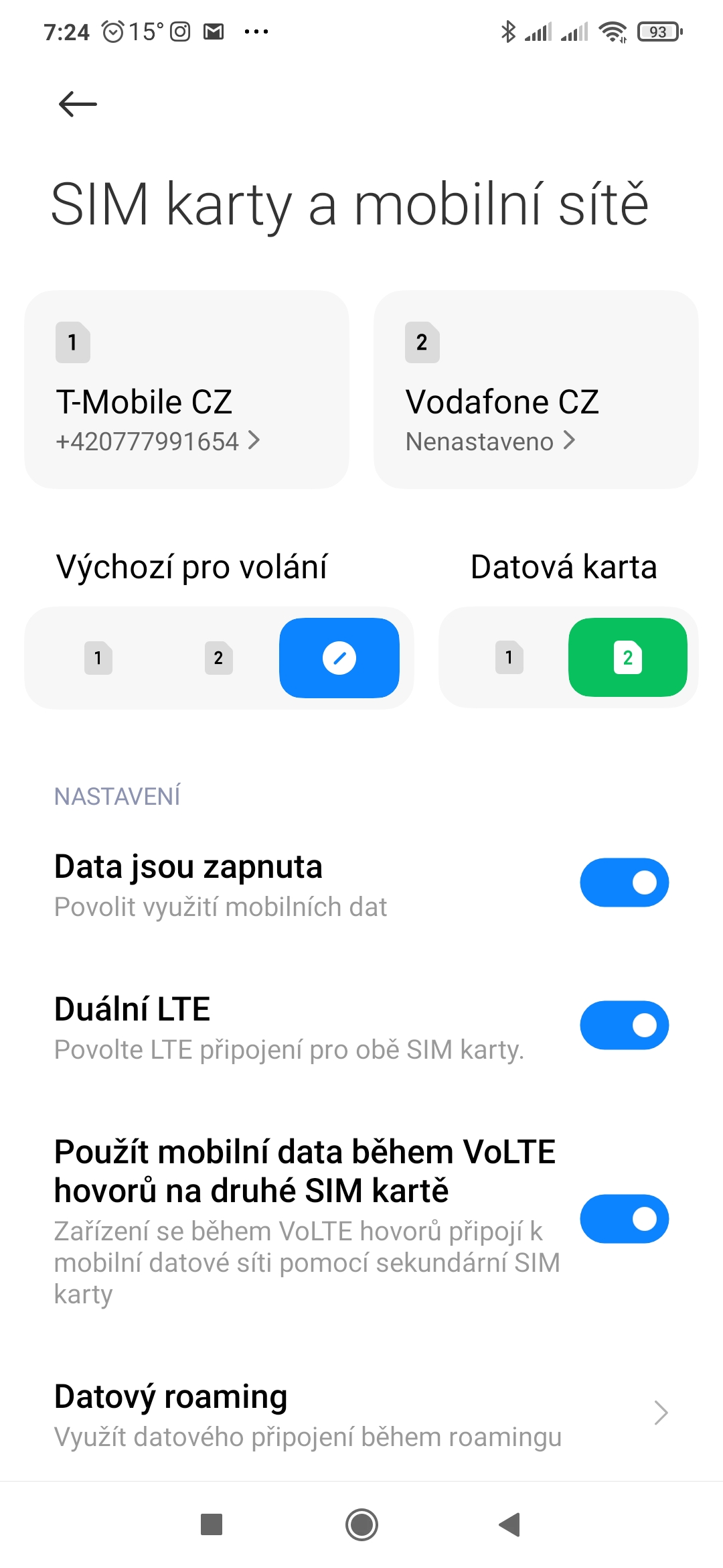 Další položky této sekce zůstaly víceméně tak, jak byly. Jako první je přepínač pro vypnutí/zapnutí mobilních datových přenosů. Na telefonech, které to podporují, lze zapnout duální LTE a povolit mobilní datové přenosy během LTE hovorů na druhé SIM kartě.