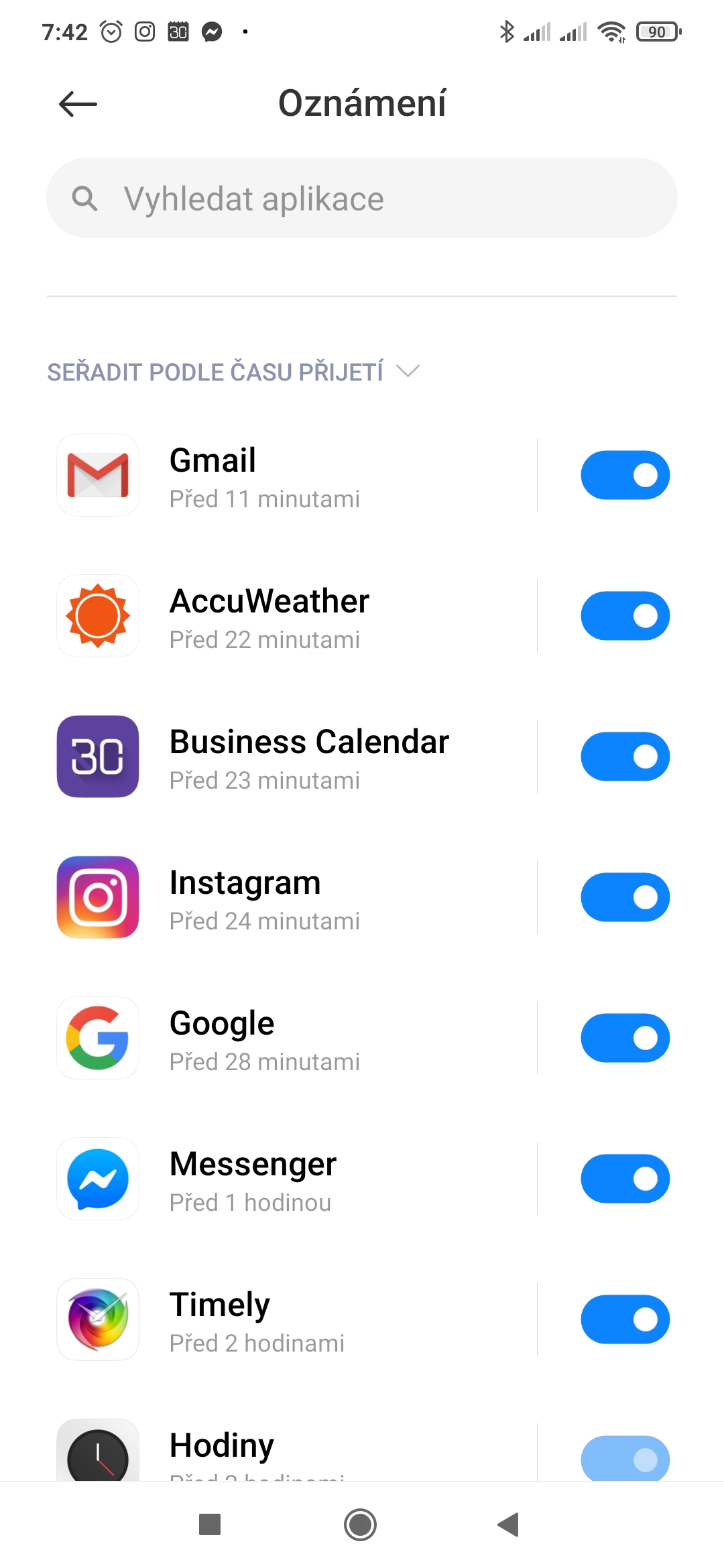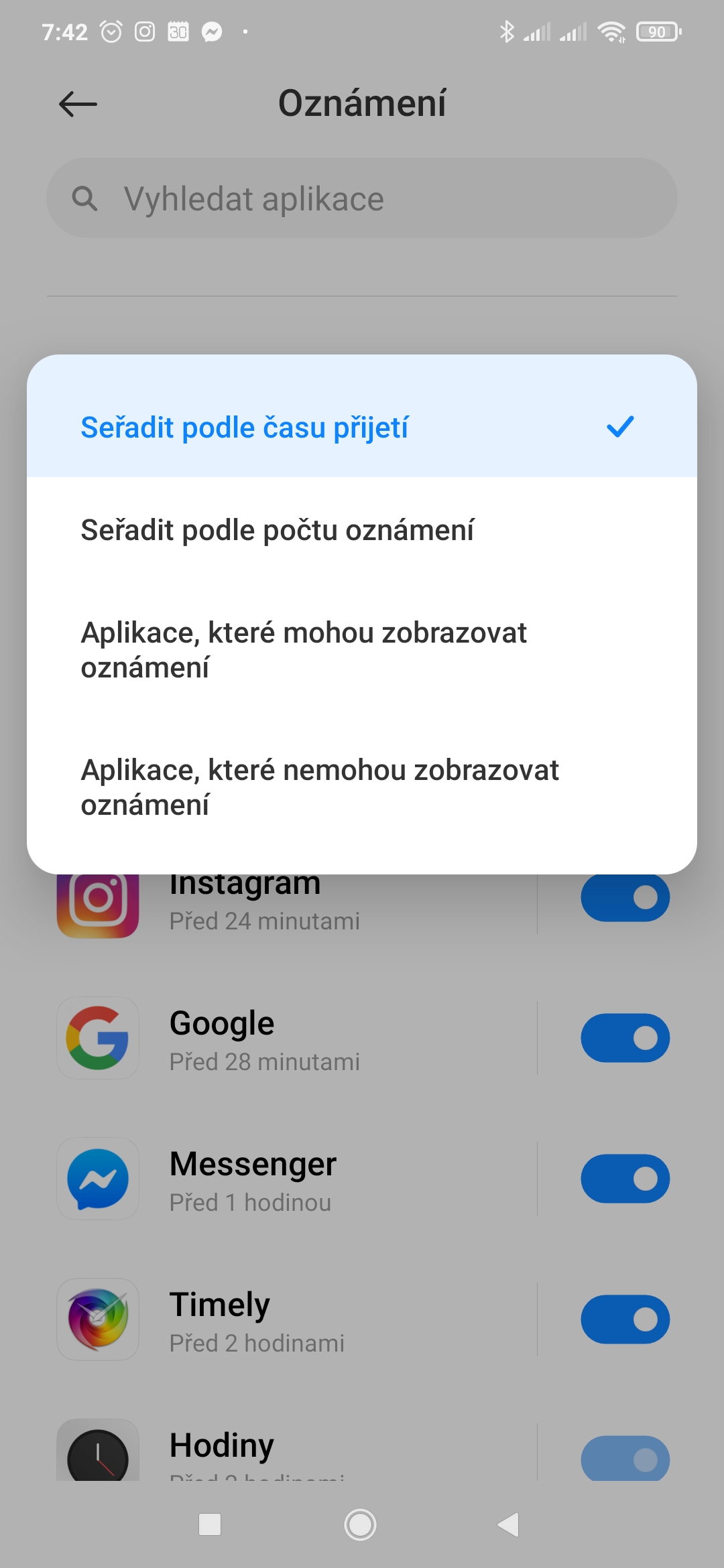 Zbytek sekce pak zabírá seznam aplikací, které zobrazily nějaké oznámení. To může být užitečné například v situaci, kdy hledáte, který program vydal zvuk, nebo rozsvítil obrazovku telefonu. Pomocí přepínače lze možnost zobrazovat oznámení zakazovat, nebo povolovat. Seznam je možné řadit podle času, nebo počtu oznámení, případně si lze nechat vyfiltrovat jen ty aplikace, jež mají povolené, respektive zakázané oznamování.