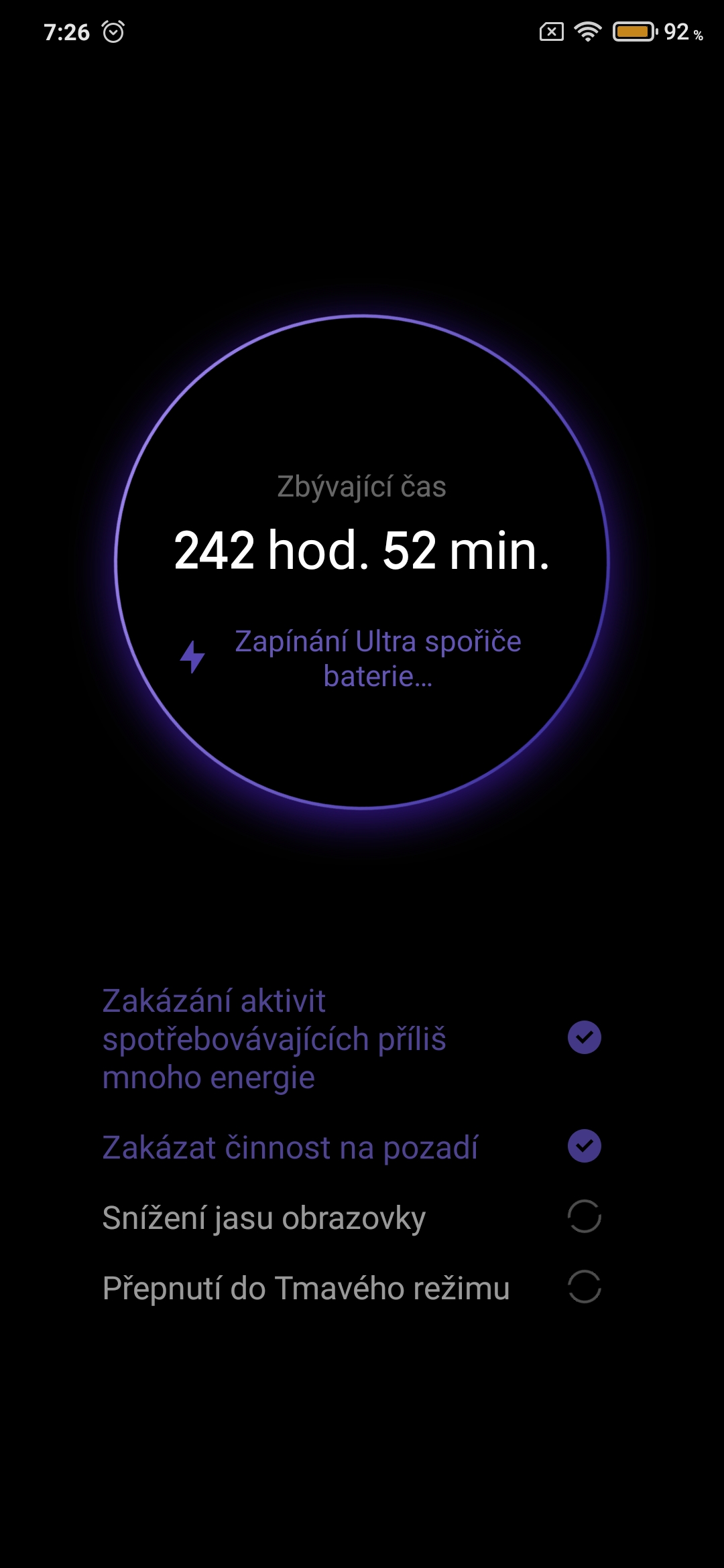 Ultra spořič baterie můžete aktivovat v Nastavení-Baterie a výkon. Po aktivaci funkce telefon nejprve zobrazí upozornění, následně zakáže aktivity na pozadí, sníží jas obrazovky, přepne do tmavého režimu a údajně i sníží výkon.