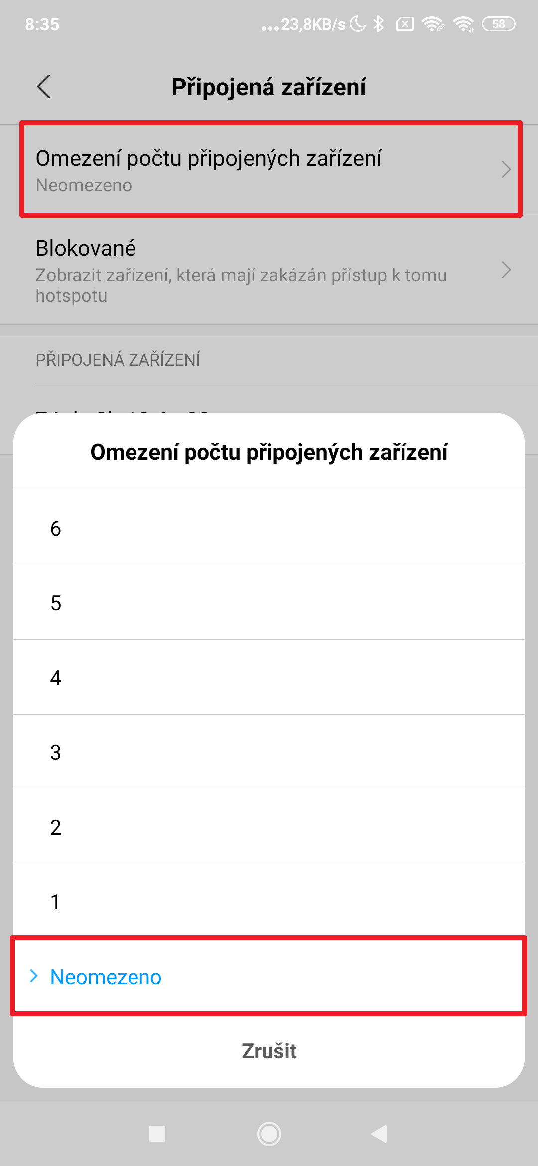 Mimochodem v sekci Nastavení-Přenosný hotspot-Připojená zařízení-Omezení počtu připojených zařízení můžete nastavit maximální povolený počet zařízení, který se smí připojit k vaší bezdrátové síti.