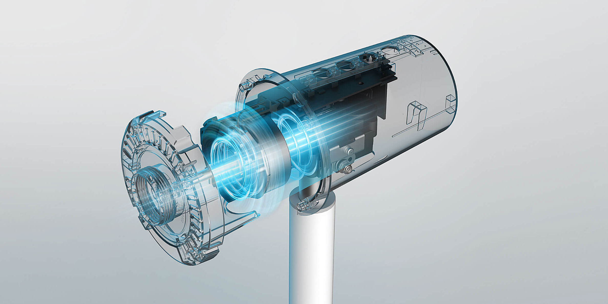 Srdcem ventilátoru je bezkartáčový stejnosměrný motor s měděnými dráty, který má vyšší provozní účinnost a delší životnost než motor s hliníkovými dráty. Zajišťuje konstantní otáčky pro stabilní větrání a nižší spotřebu elektrické energie. Ve spolupráci s lopatkami ve tvaru křídel je na nejvyšší výkon schopen zajistit průtok vzduchu až 20 metrů krychlových za minutu.