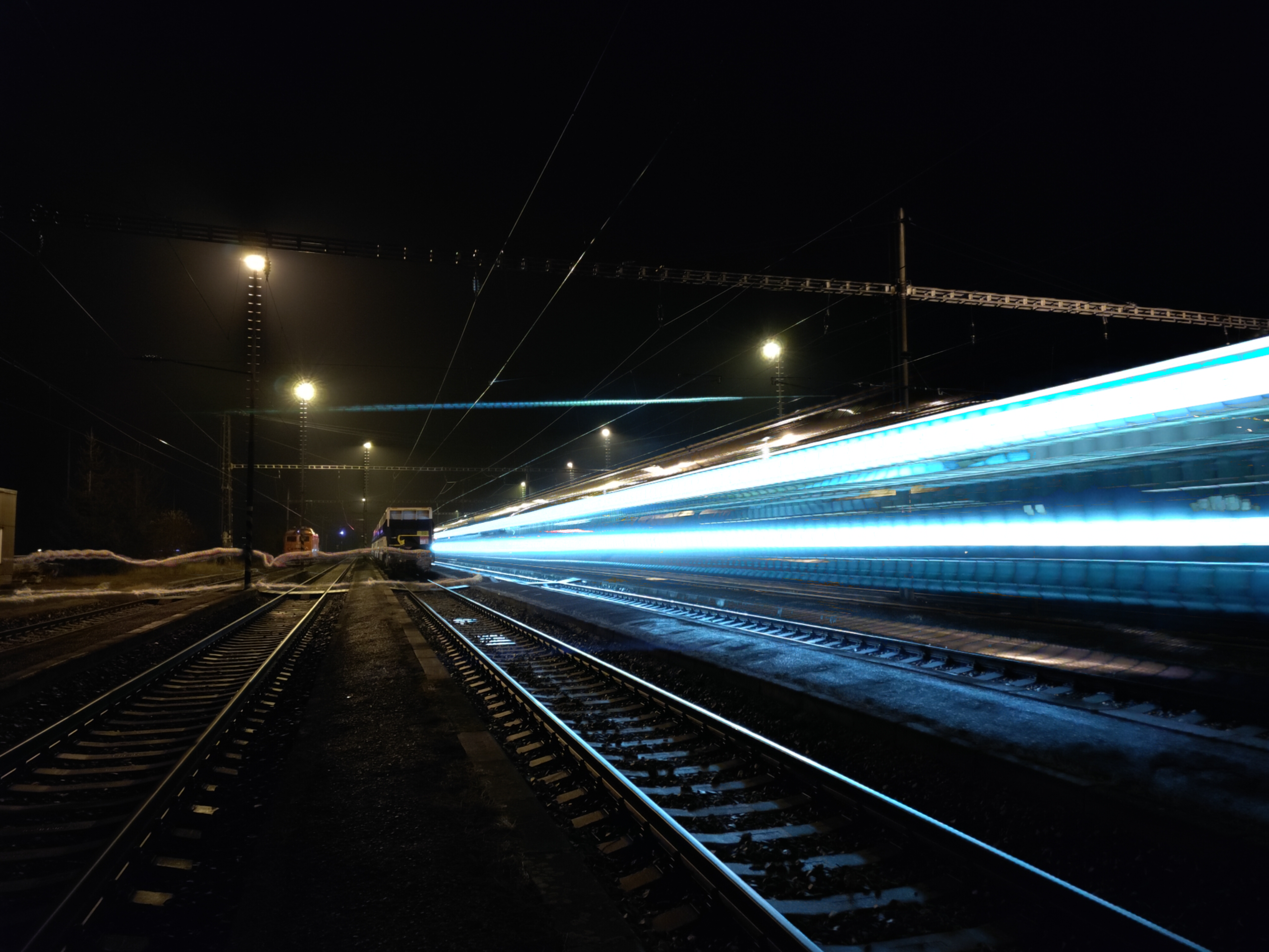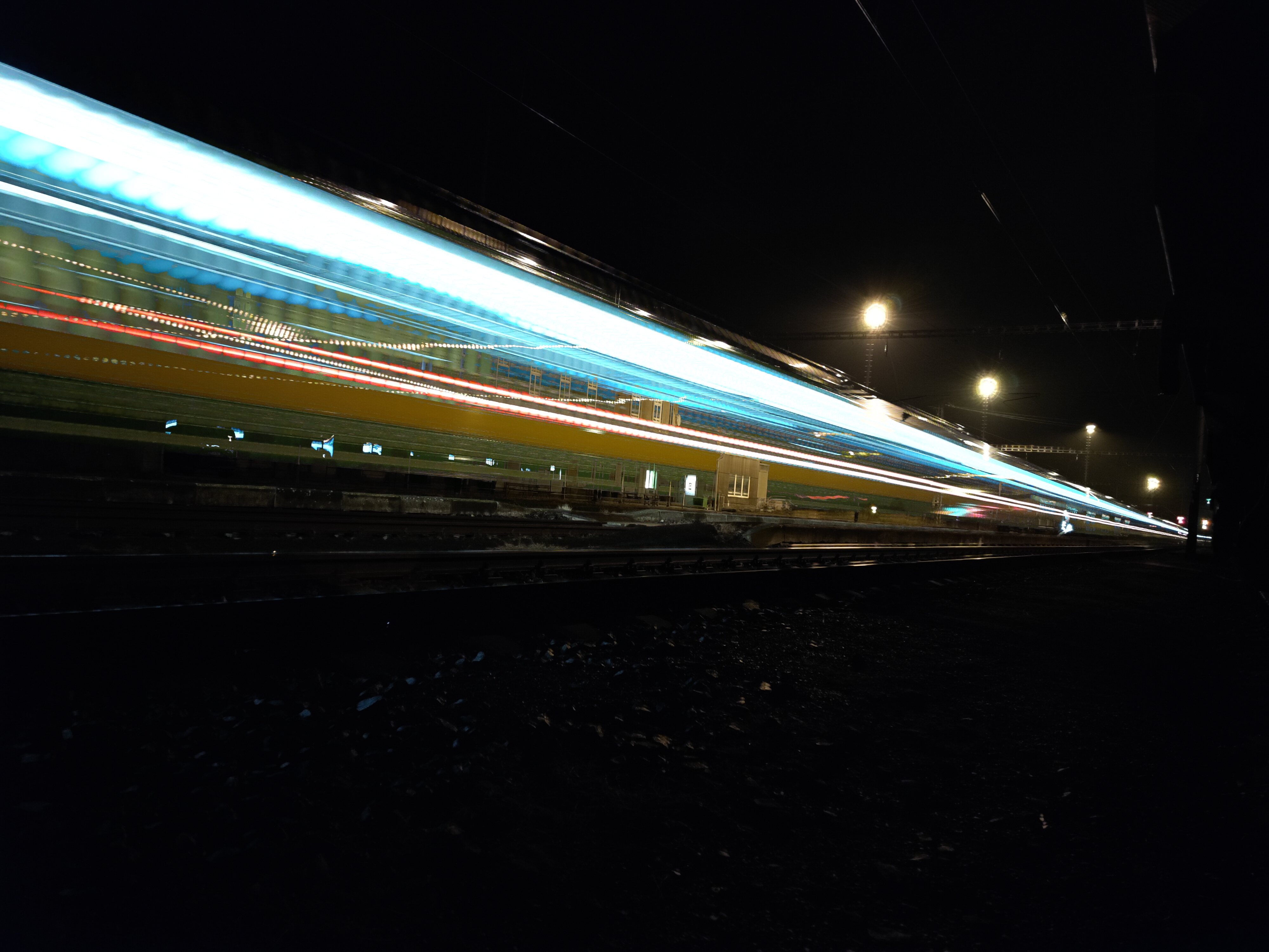Samozřejmě jsem vyzkoušel i kreativní režimy dlouhé expozice – malbu světlem a neonové linky. Oba režimy jsou velice podobné a popravdě si vlastně ani nejsem jistý, v čem se mají lišit. Když se ale podíváme na výsledek, uvidíme poměrně solidní fotku. Dokonce fotka vypadá kvalitněji, než všechny fotky s běžným nočním režimem. Není zde žádný šum, nepatrné rozmazání vzdálenějších objektů vypadá přirozeně a ani po přiblížení není vidět nějaké výraznější slévání barev. Jediným výrazným nedostatkem tak je fakt, že fotoaparát doopravdy nedělá to co říká. Zatímco v EXIFu je uvedena expozice dlouhá 67 vteřin, jak je mimochodem funkce také prezentována, ve skutečnosti je výsledkem složení několika desítek fotek s kratším expozičním časem. Výhodou je, že se nepřesvětlují objekty, které se v obraze nehýbou. Nevýhodou je, že na pohybujících se objektech je vidět snímání jednotlivých snímků.