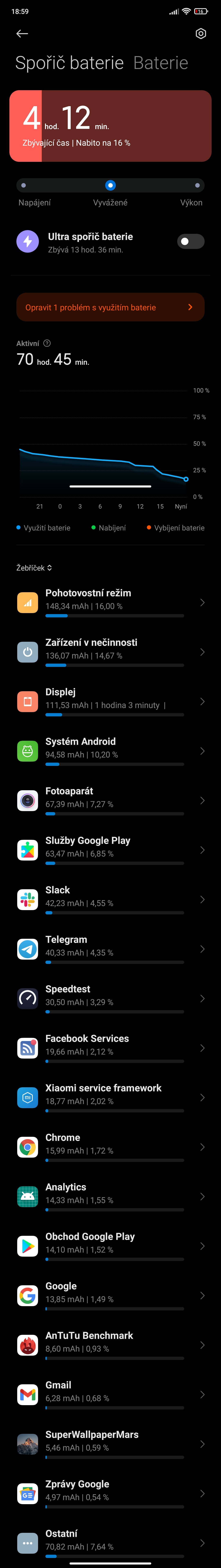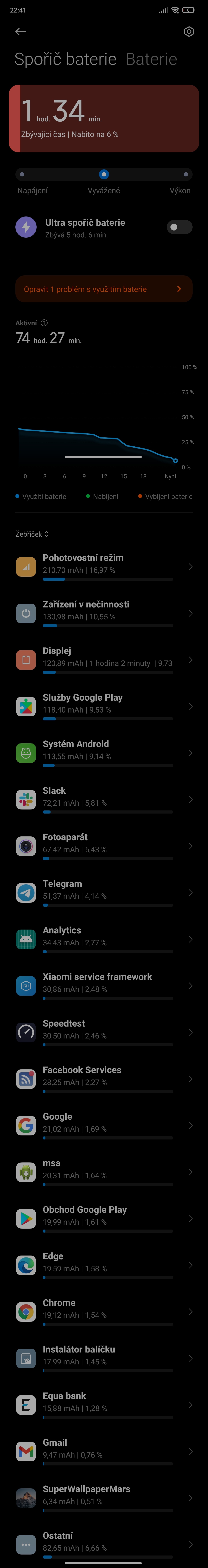 Pamatujete, jak jsem v kapitole o hardwaru psal, že jsem pro testování zvolil dva režimy po týdnech? A věřili byste tomu, že jsem během toho prvního týdne nabíjel telefon jen dvakrát? Dvakrát za týden. To znamená tří denní výdrž na jedno nabití. Nevěříte? Naštěstí mám důkaz v podobě screenshotů. Znovu podotýkám, že jsem telefon nijak výrazně nezatěžoval, ale rozhodně jsem ho ani nijak nešetřil. Prostě jsem ho používal tak, jak jsem aktuálně potřeboval a jak jsem zvyklý. Několik hovorů denně, odepisování na zprávy na Telegramu a Slacku, pár mailů, hudba v autě…