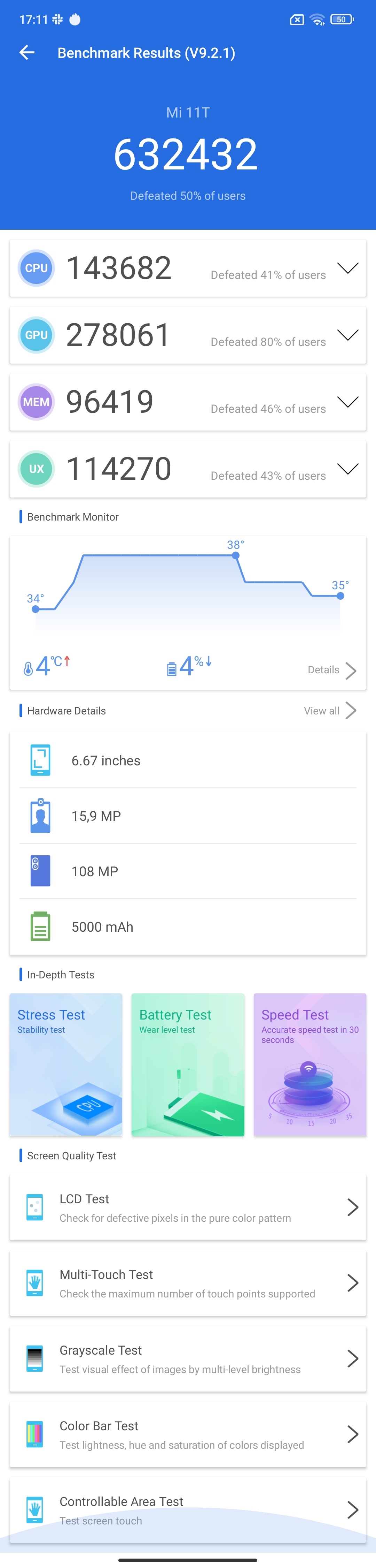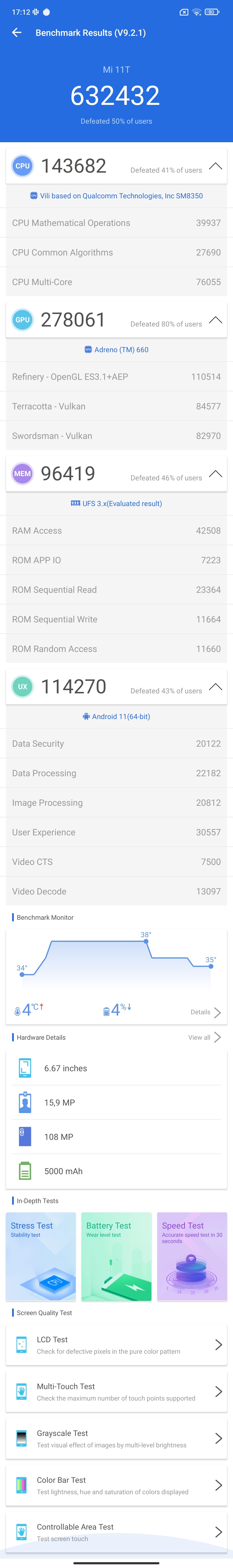 Když se podíváme na výsledky benchmarku AnTuTu, uvidíme, že výsledky zde už nevypadají tak moc slavně. Nicméně stále se není za co stydět. V celkovém souhrnu získalo Xiaomi 11T Pro 632432 bodů. Pokud si hodnocení rozdělíme, tak procesor získal 143682 bodů, grafický čip 278061 bodů, operační paměť 96419 a optimalizace UX 114270 bodů. A již na těchto výsledcích vidíme, že právě operační paměť bude zřejmě slabinou hardwaru, což potvrzuje můj test s náročnější hrou a fotoaparátem. Samotné hry vám ale poběží opravdu parádně, jak benchmark dokazuje.