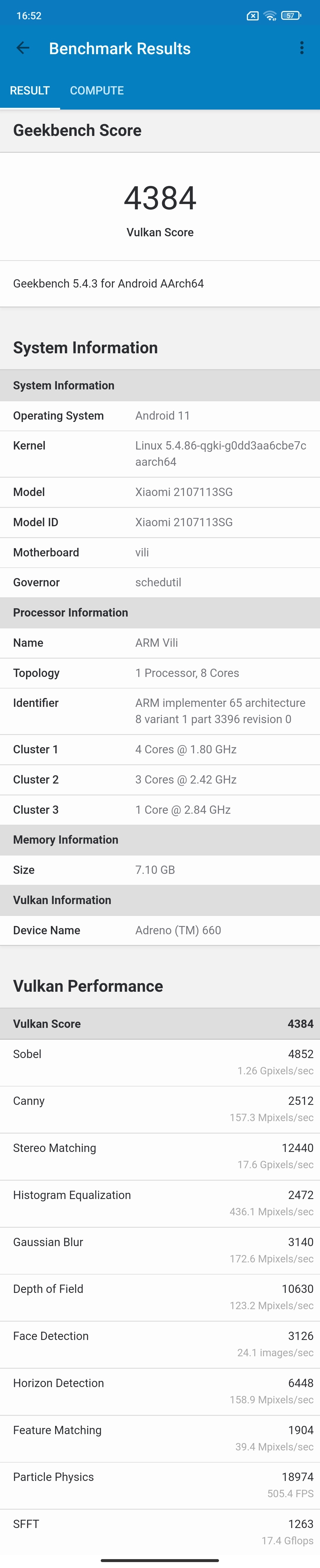 Pokud se podíváme na výkon grafického čipu, tak vidíme, že test udělil telefonu skóre 4677 bodů na technologii OpenCL a 4384 bodů na technologii Vulkan. Pokud bychom telefon opět srovnali s konkurencí, tak při technologii Open CL se zařadí opět na šesté místo mezi Samsung Galaxy Note20 Ultra 5G a Samsung Galaxy Note 20 Ultra. Při testu technologie Vulkan pak bohužel srovnání nemáme, protože aplikace nám z nějakého důvodu žádné konkurenční zařízení nezobrazila.
