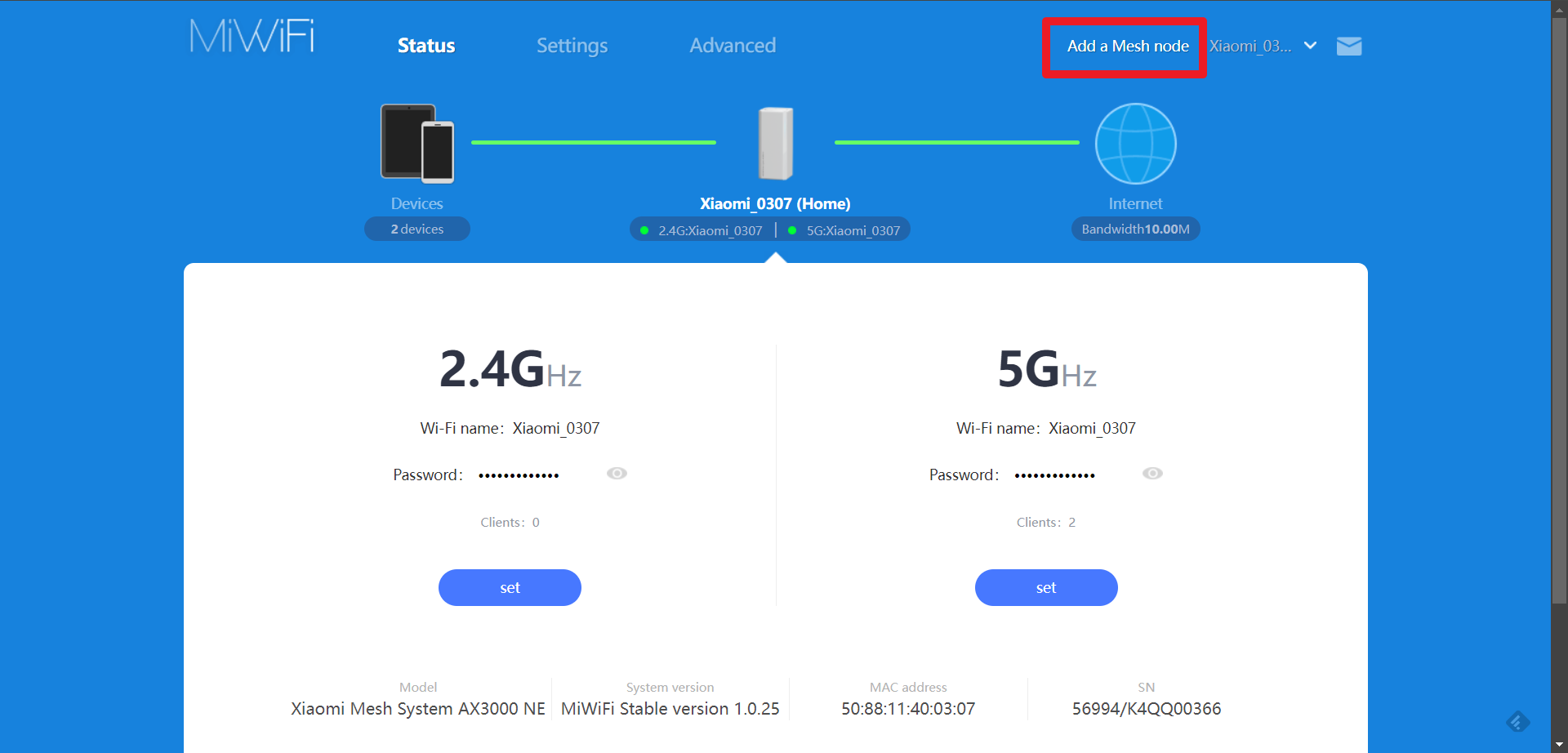 Po zadání IP adresy se zobrazí stránka s QR kódem pro stažení aplikace Mi Home a pole pro zadání administrátorského hesla. Po přihlášení se zobrazí stránka Status se základními informacemi, ze které vyčtete počet aktuálně připojených zařízení a to, zda je funkční internetové připojení.