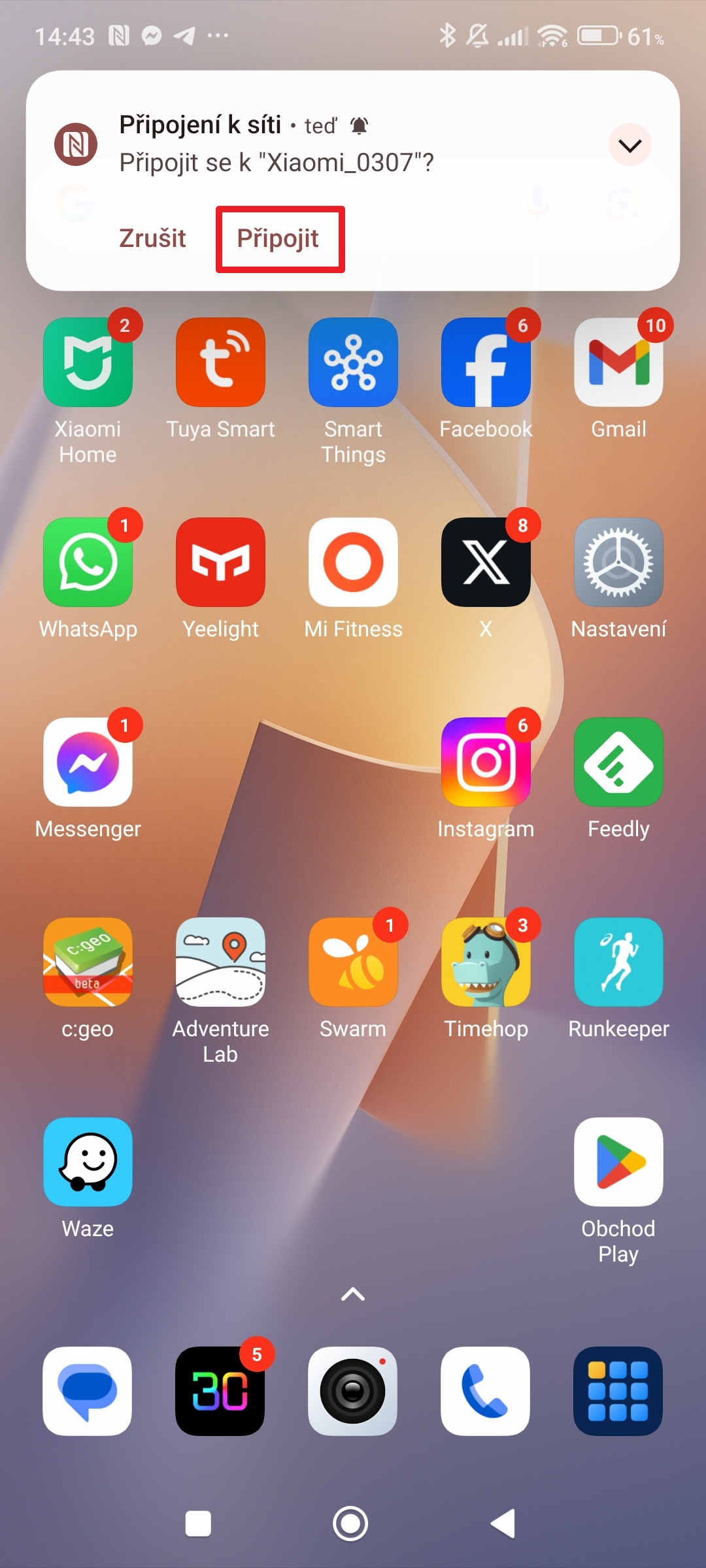 Následně se zobrazí dialogové okno s dotazem, zda si přejete připojit se k bezdrátové síti. V případě, že odpovíte klepnutím na tlačítko Připojit, se telefon automaticky během krátkého okamžiku připojí k Wi-Fi. Není nutné vyhledávat okolní sítě, ani zadávat heslo.