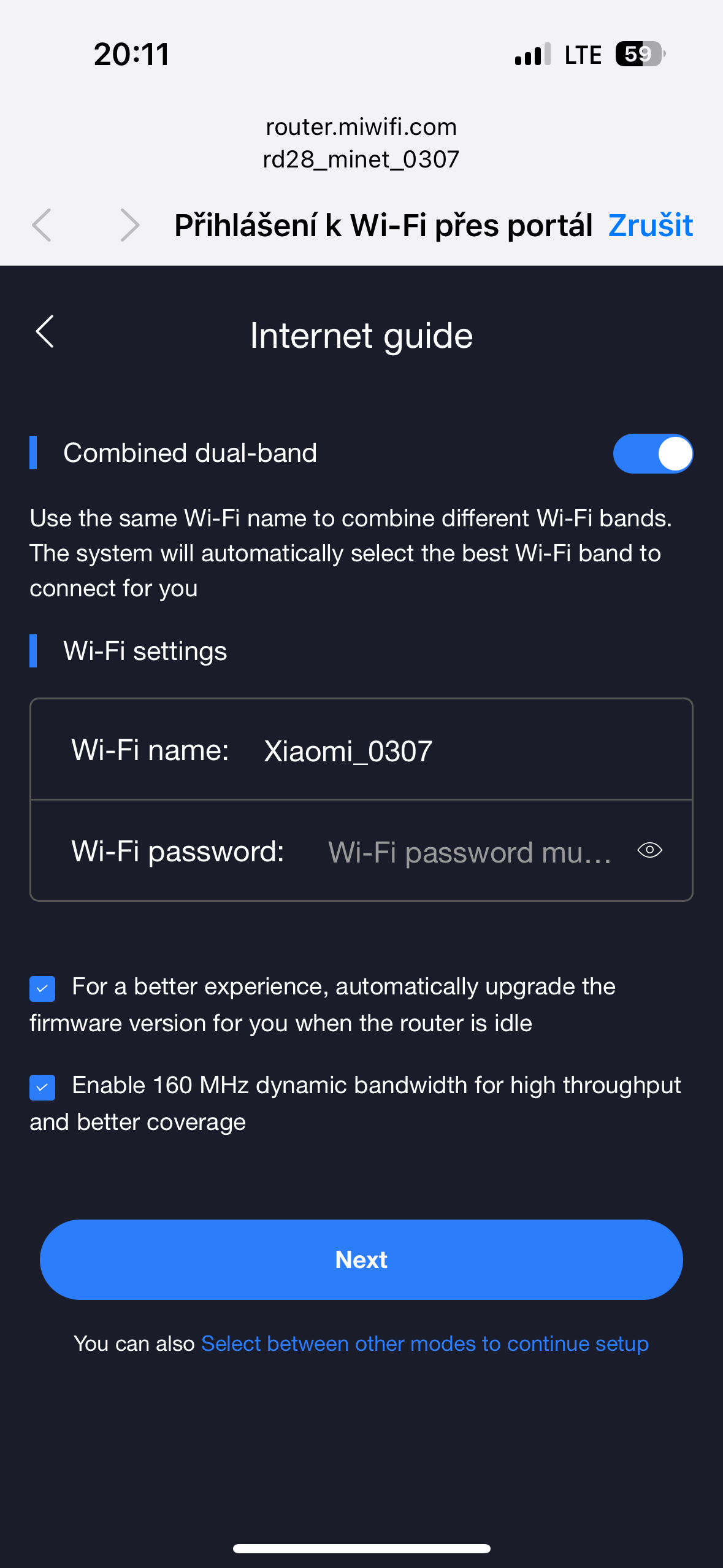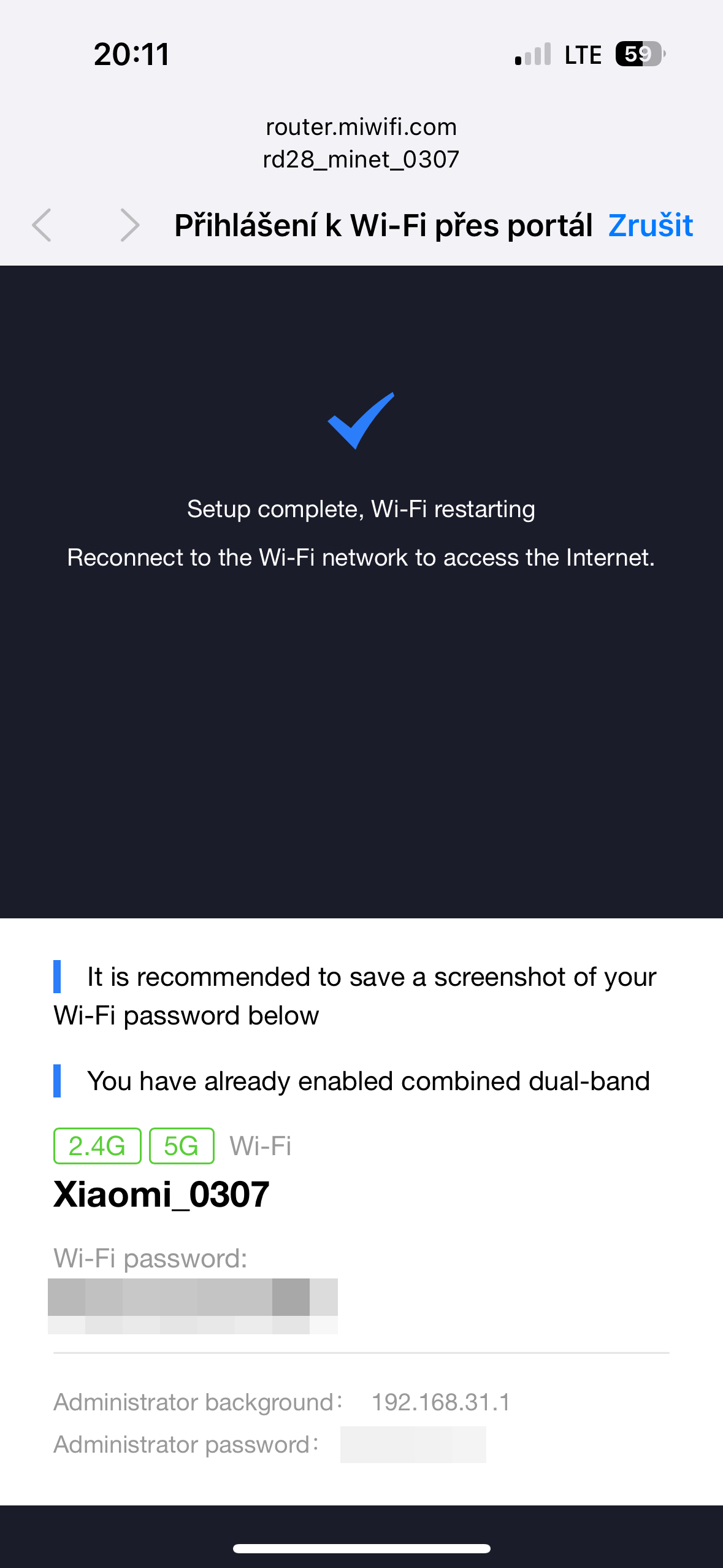 V další fázi pak následuje nastavení bezdrátové sítě. Zde je možné síť nastavit jako dvoupásmovou (tj. v pásmu 2,4 i 5,0 GHz má stejný název a přístupové heslo), nebo zvlášť definovat síť v pásmu 2,4 a 5,0 GHz, Kromě názvu sítě (SSID) je nutné zadat také heslo, které bude nutné zadávat na připojovaných zařízeních. Router po dokončení konfigurace ukáže oba zadané údaje na obrazovce. Kromě toho ukáže také IP adresu a heslo do webové administrace.