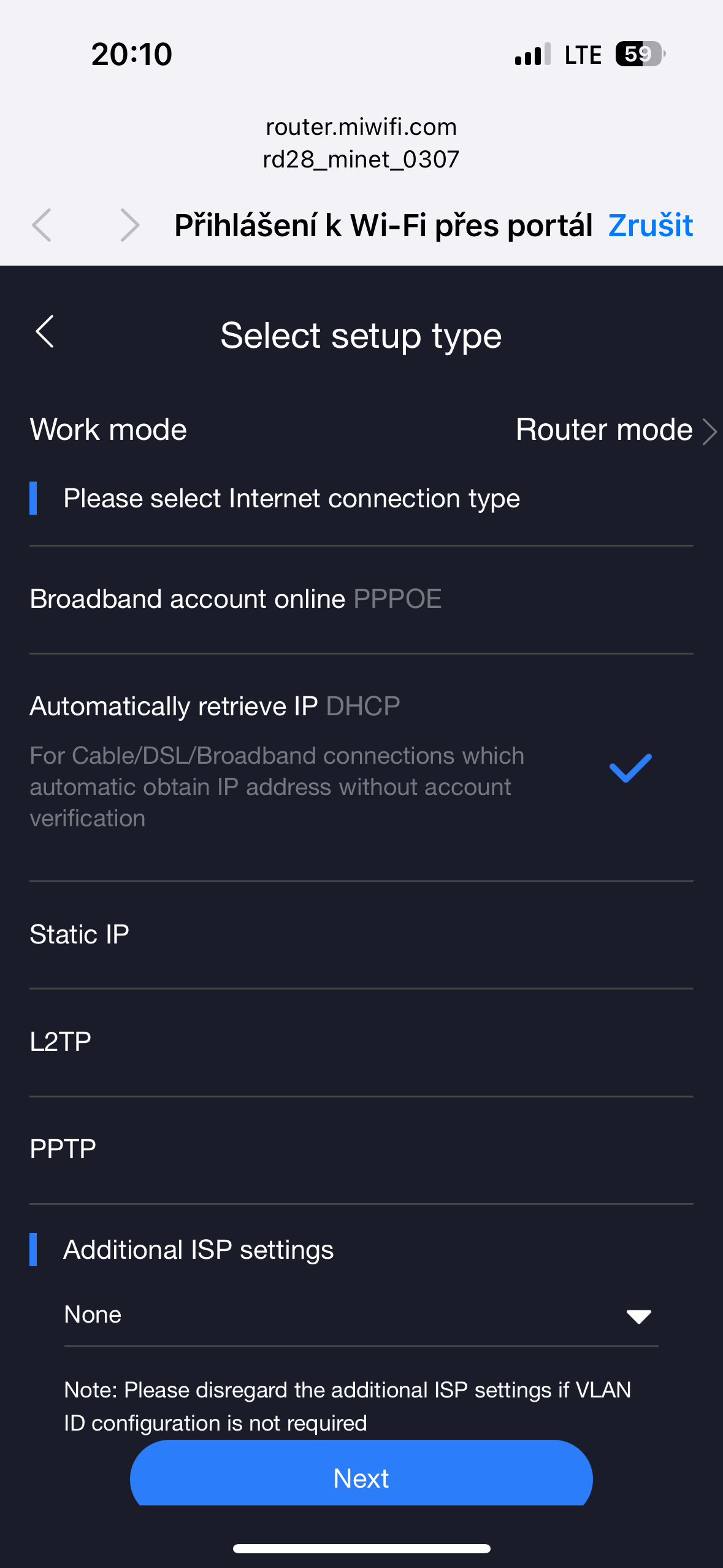 Následuje nastavení internetového připojení. Aplikace nabízí automatické přidělení IP adresy DHCP serverem nebo její ruční zadání a poskytuje několik dalších možností nastavení. V následujícím kroku jsme dostali na výběr ze tří možných režimů: