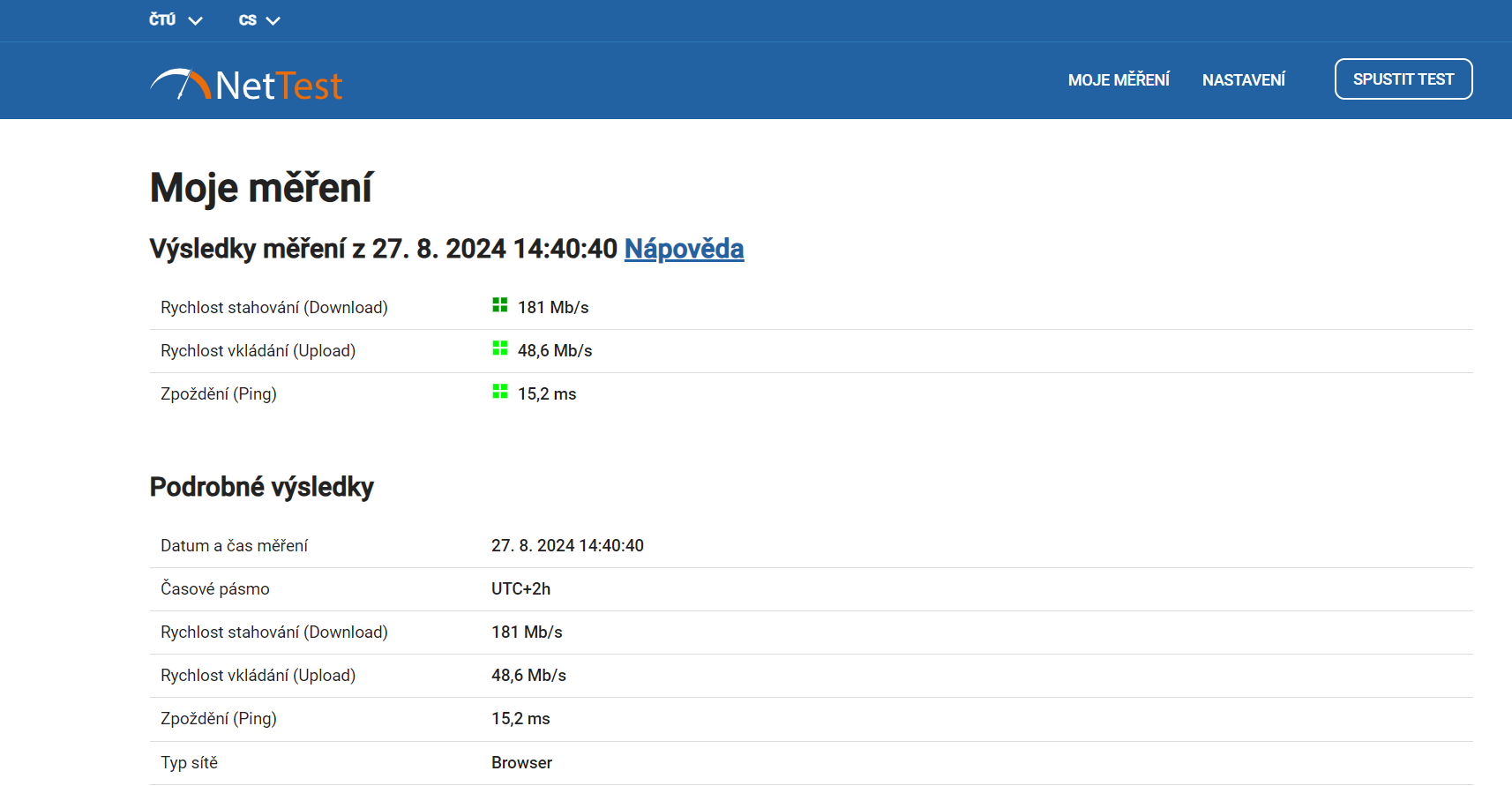 Výsledky byly překvapivé. Průměrná rychlost downloadu se po odečtení nejvyšší a nejnižší hodnoty pohybovala jen okolo 171 Mb/s. Byla tedy o 28 % než při použití routeru Xiaomi. Naopak rychlost uploadu dosahovala v průměru 47 Mb/s a byla tak o 20 % vyšší. Čím jsou tyto rozdíly způsobeny bohužel neumíme vysvětlit.