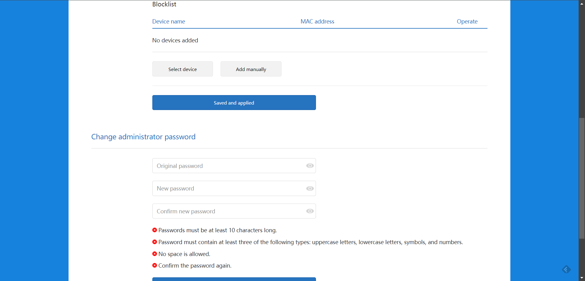 - Change administrator password – změna hesla správce routeru je důležitá pro zajištění bezpečnosti sítě. Nové heslo musí splňovat následující kritéria: minimální délka 10 znaků, musí obsahovat alespoň tři z následujících typů znaků: velká písmena, malá písmena, čísla, a symboly a nesmí obsahovat mezery.