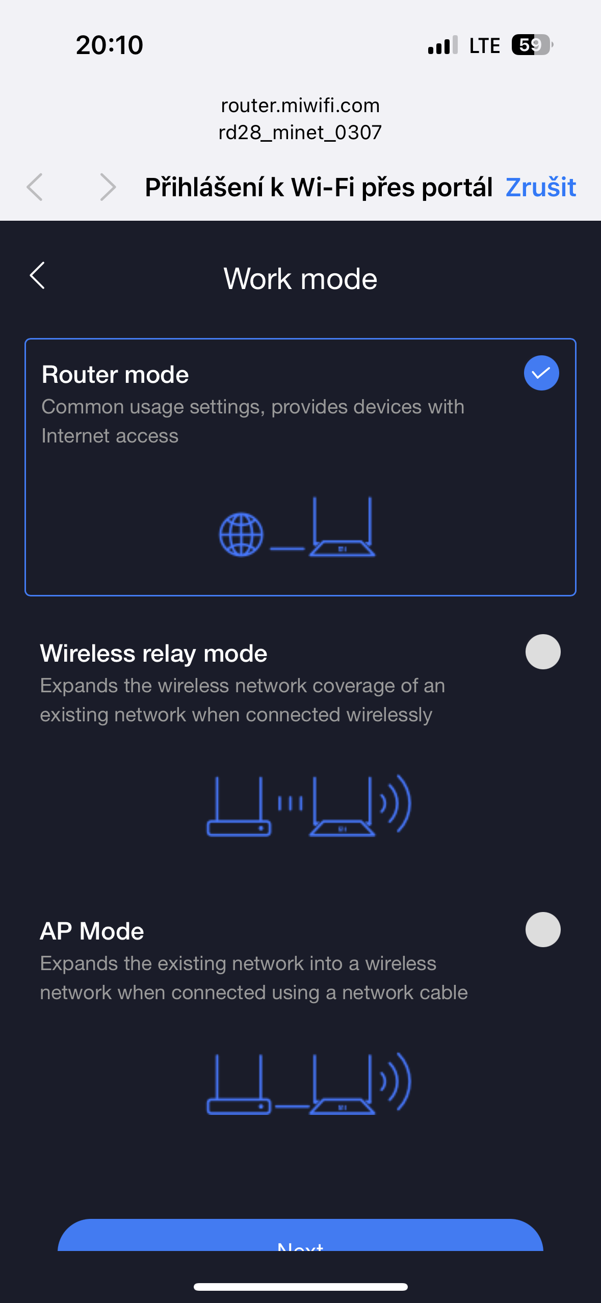 - Switch modes – router Xiaomi Mesh System AX3000 NE může pracovat ve třech režimech: router, bezdrátový repeater (opakovač) a drátový repeater. Chcete-li změnit režim, přejděte do nastavení a vyberte požadovaný režim podle vašich potřeb. Pro správné fungování v režimu opakovače je důležité, aby nastavení země/regionu bylo na obou zařízeních (hlavním routeru i opakovači) identické. To zajistí kompatibilitu a správnou synchronizaci mezi zařízeními.