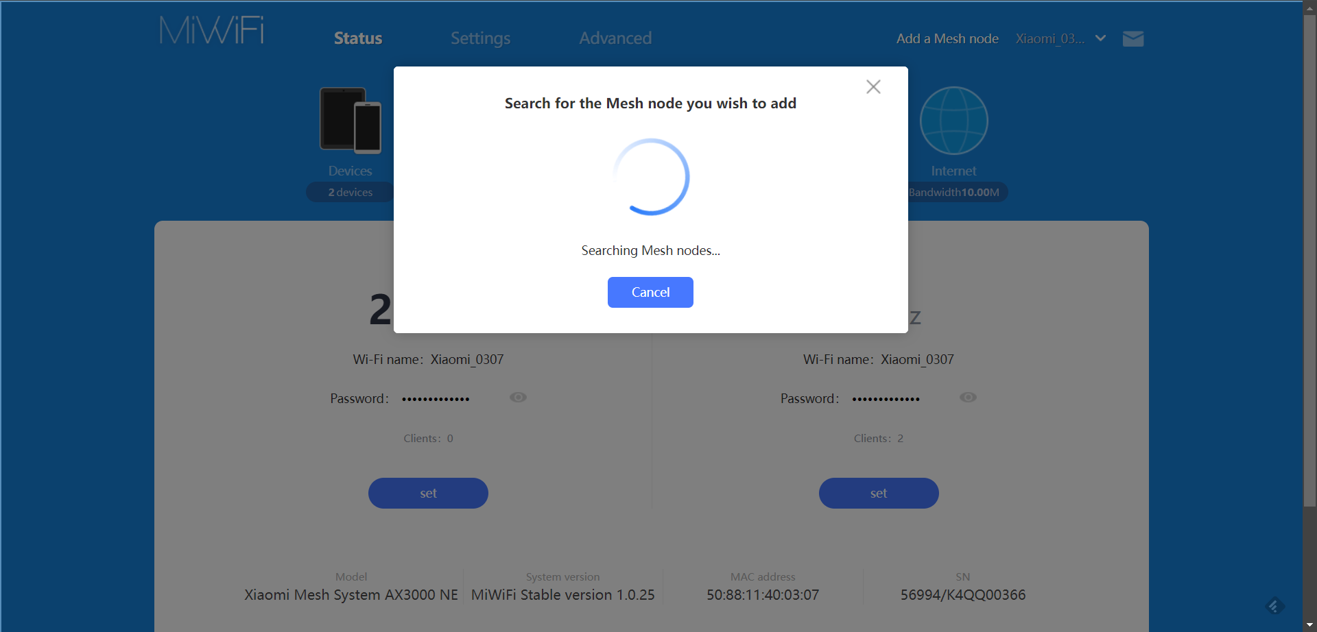 Níže pak lze prohlížet údaje zvlášť pro Wi-Fi v pásmu 2,4 a 5,0 GHz. Kromě názvu a hesla, které je možné si nechat zobrazit, se zde ukazuje počet připojených zařízení. V dolní části je pak uvedený model routeru, tj. v našem případě Xiaomi Mesh System AX3000 NE, verze systému (v době testu MiWiFi Stable version 1.0.25), MAC adresa a sériové číslo.