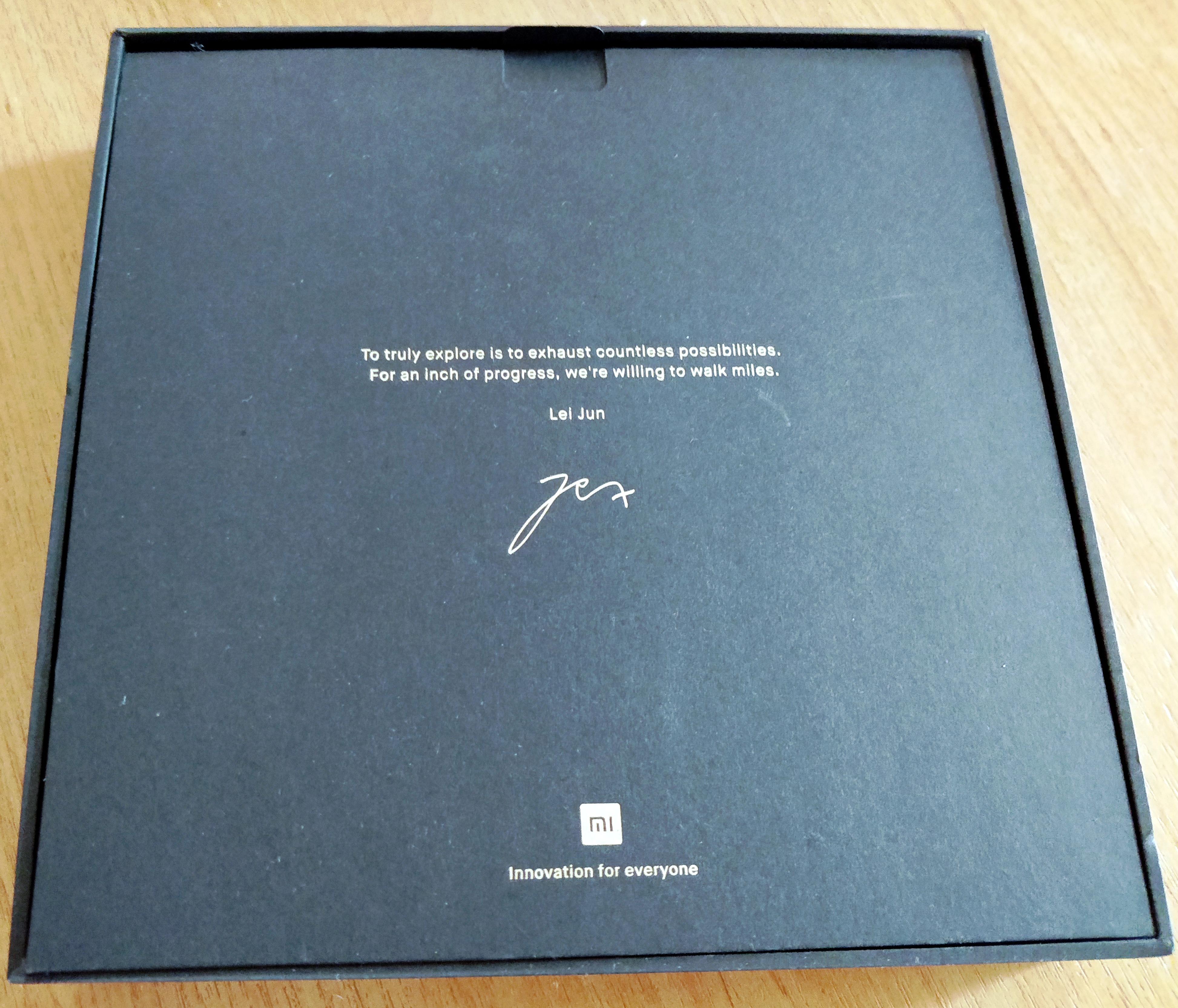 Po odklopení víka přivítá novopečeného majitele černá kartička s citátem generálního ředitele společnosti Lei Juna, který zhruba znamená: „Skutečné prozkoumat znamená vyčerpat nesčetné možnosti. Pro pokrok o jeden palec jsme ochotni nachodit celé míle.“